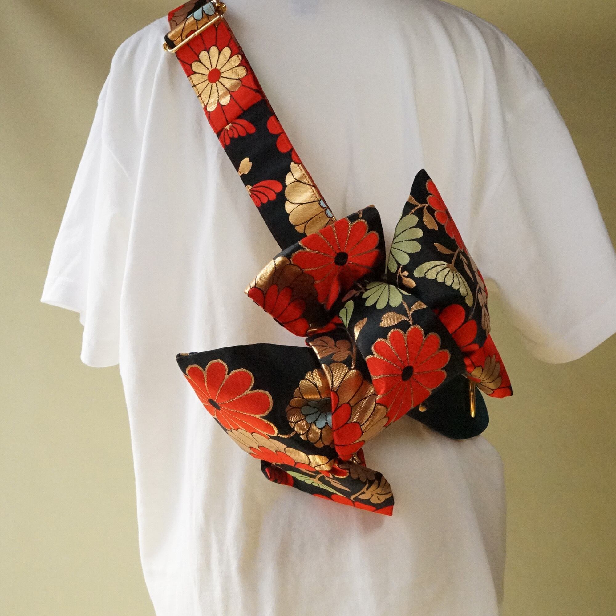 着物帯ならではの色づかいと存在感はステージ映え間違いナシのアイテムです。