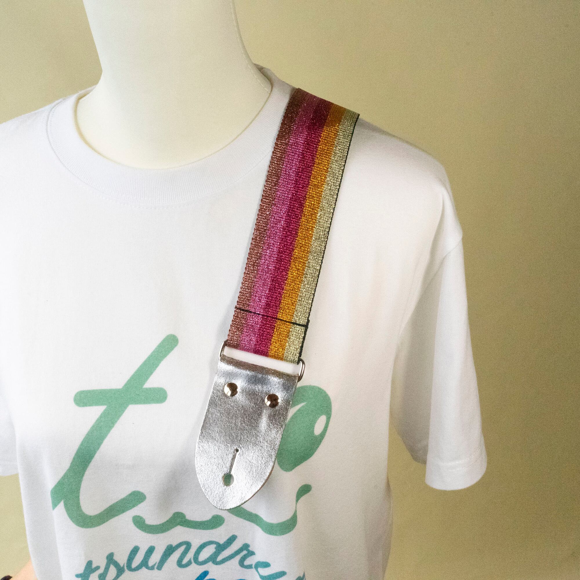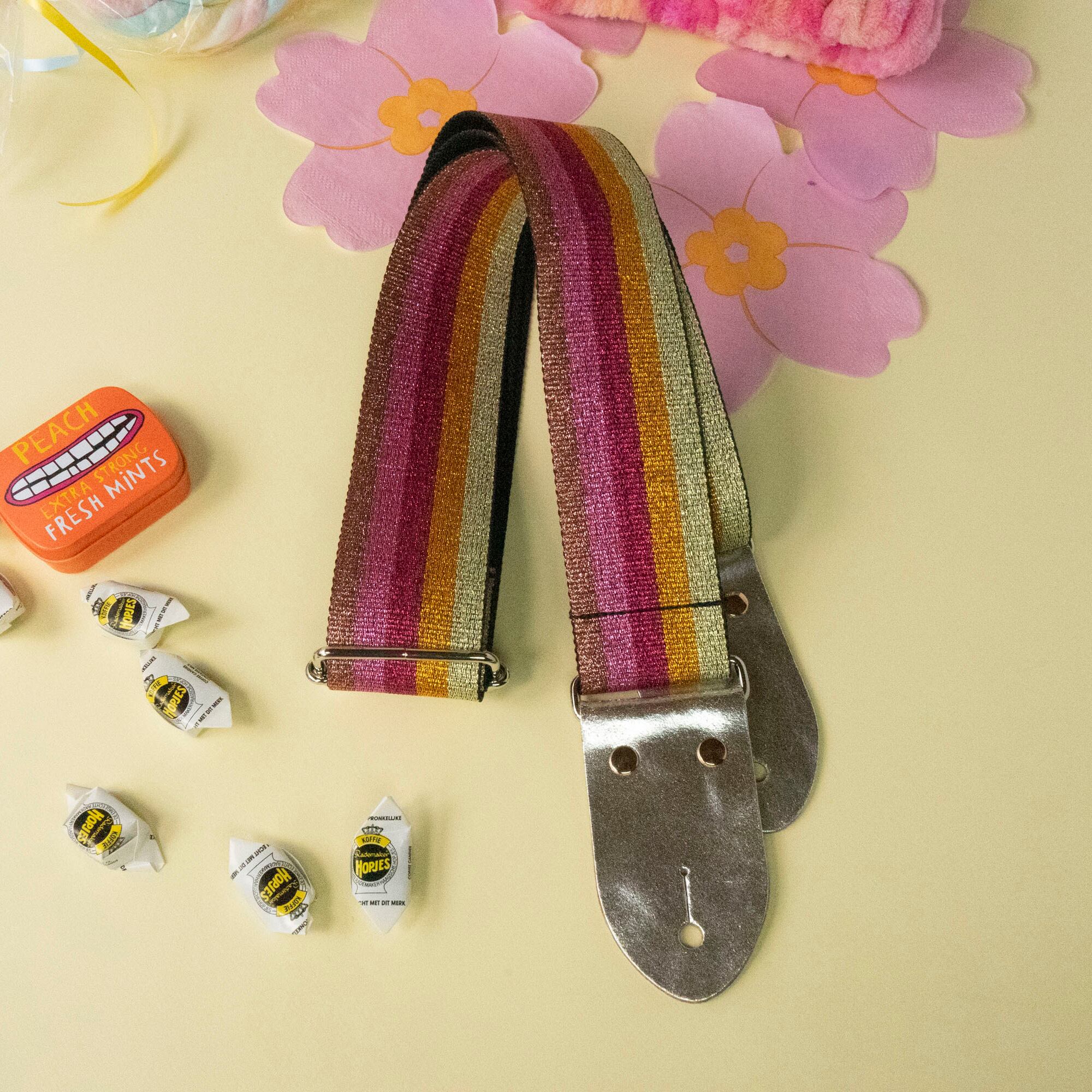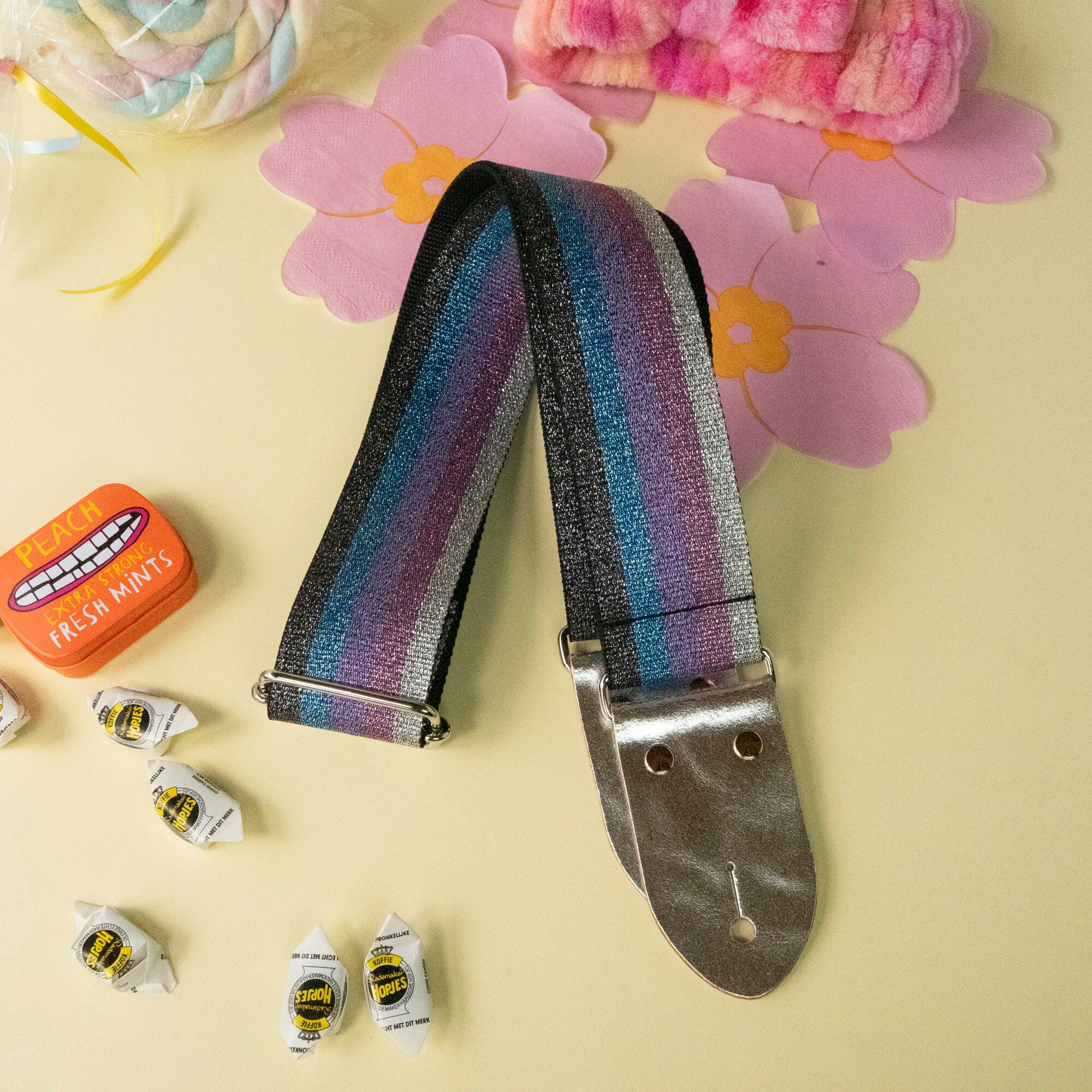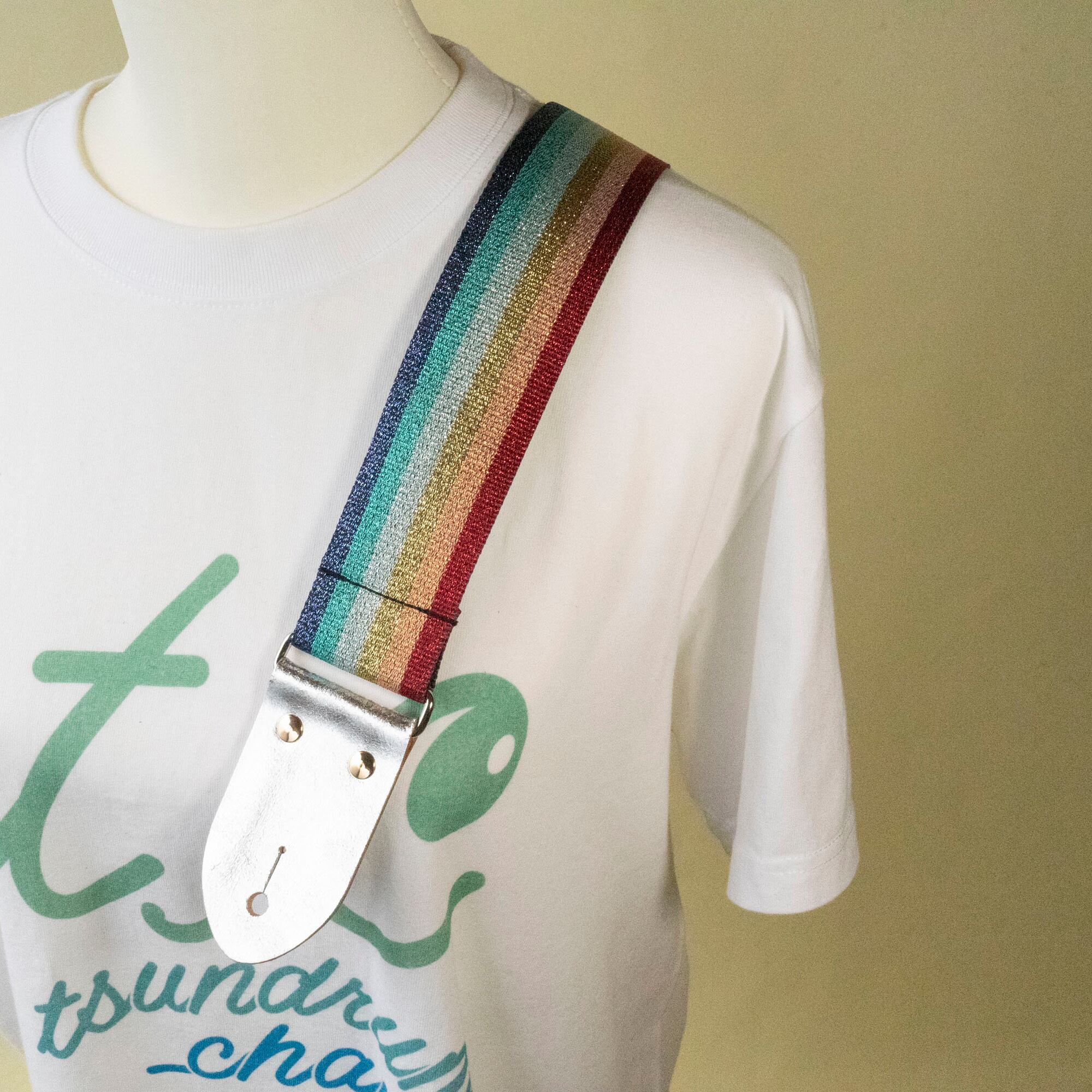 虹色は6色、パープルとピンクは5色のラメラインが輝く外国製のPP(ポリプロピレン)ベルトで、従来のレインボー柄のように子どもっぽくなり過ぎず、クール系にもモード系にもハマるデザインです。