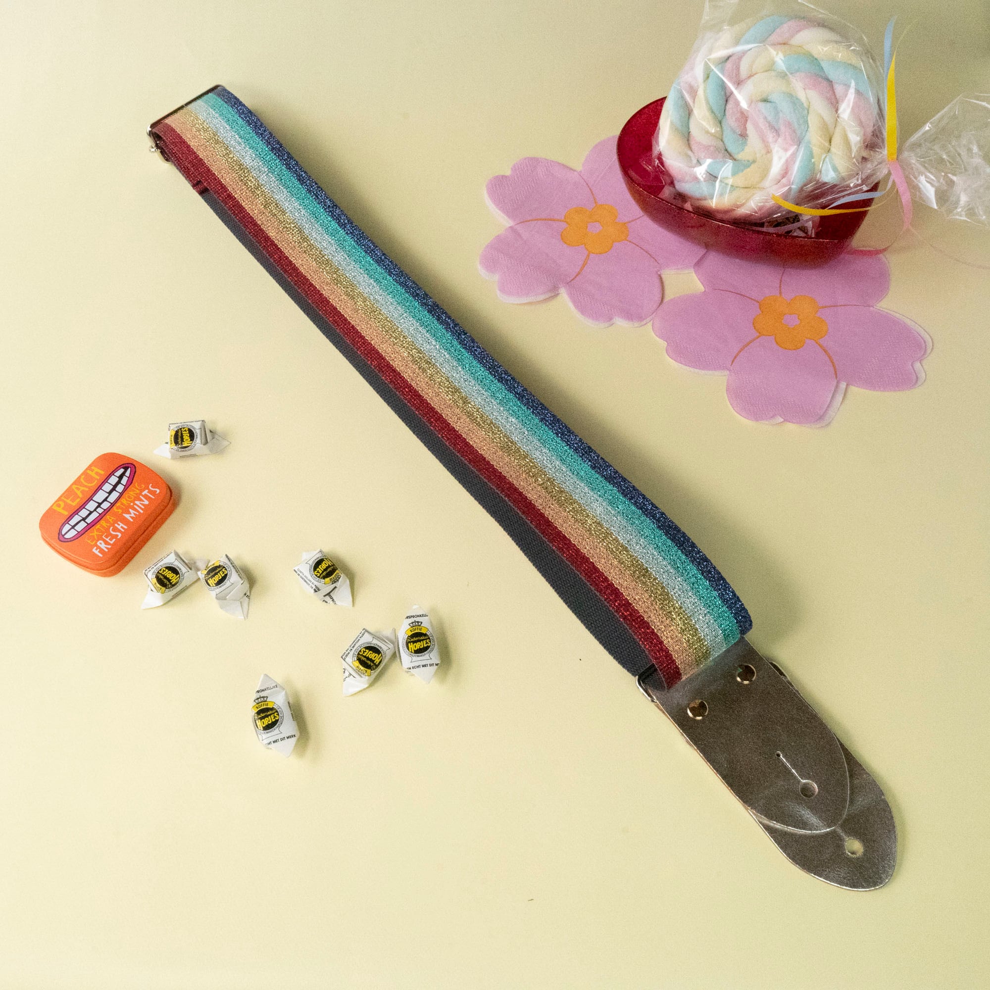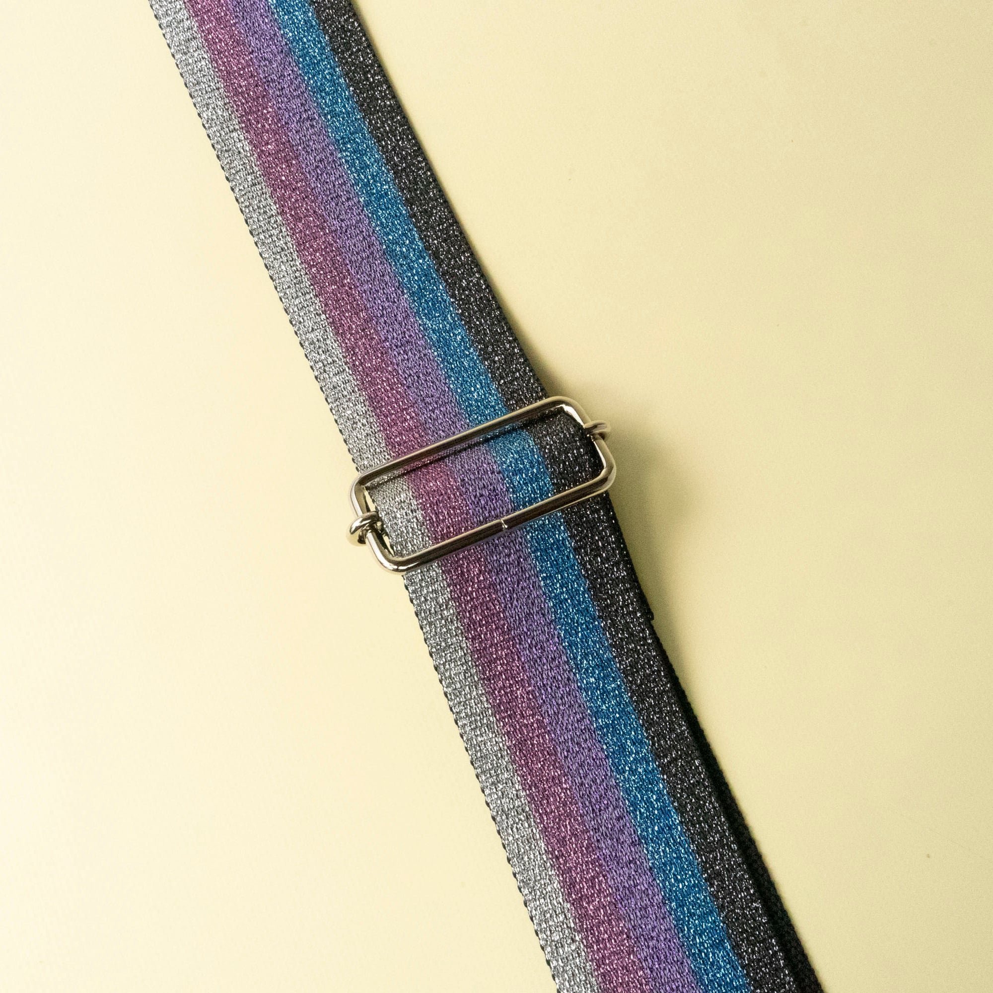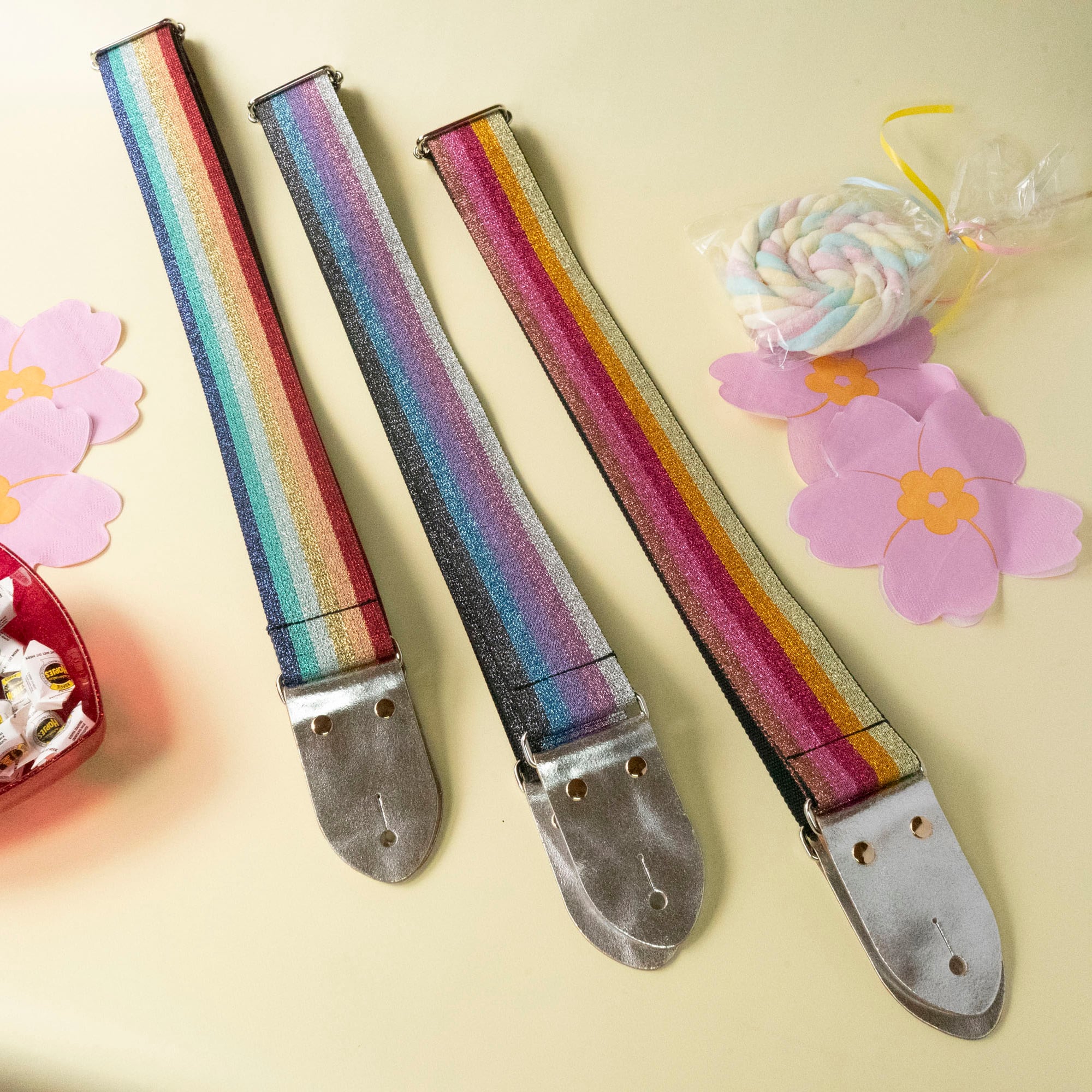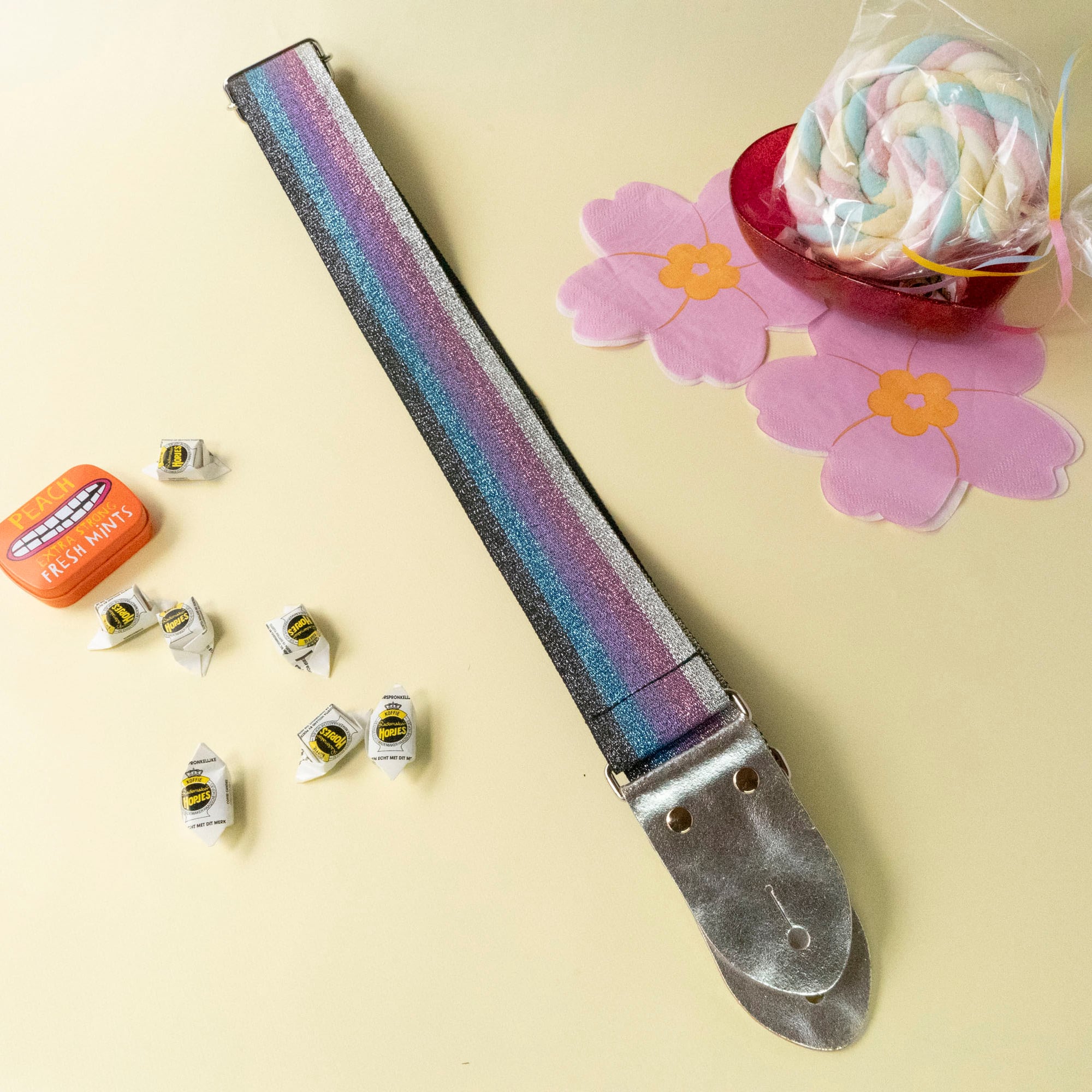 虹色は6色、パープルとピンクは5色のラメラインが輝く外国製のPP(ポリプロピレン)ベルトで、従来のレインボー柄のように子どもっぽくなり過ぎず、クール系にもモード系にもハマるデザインです。