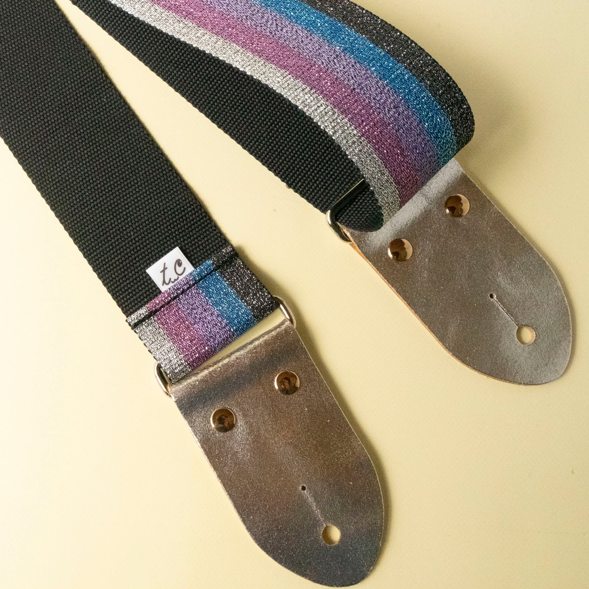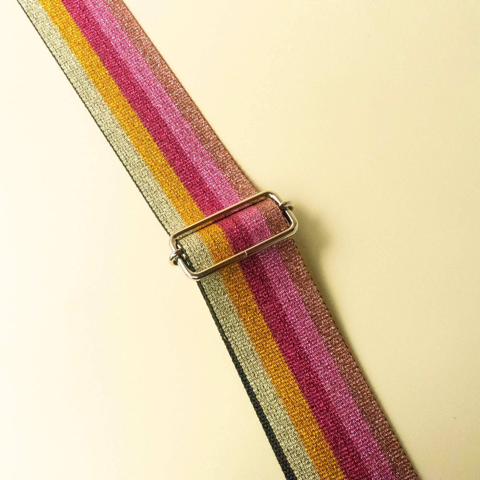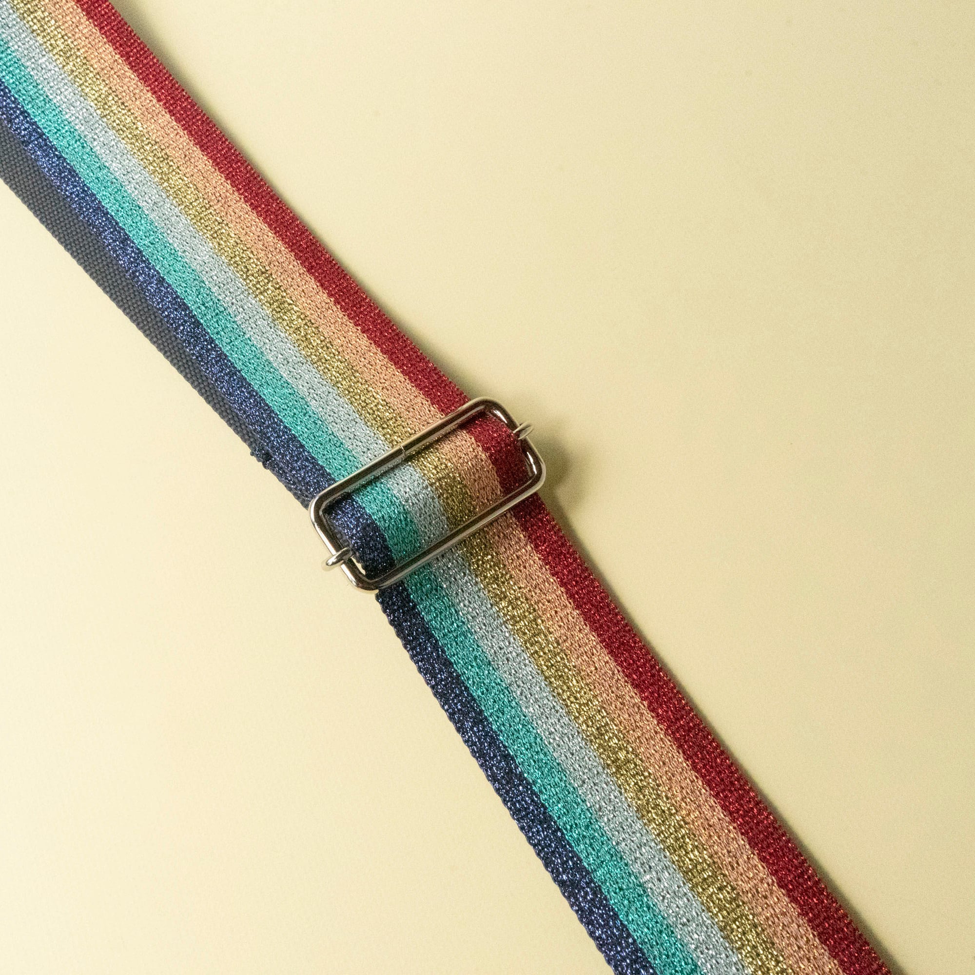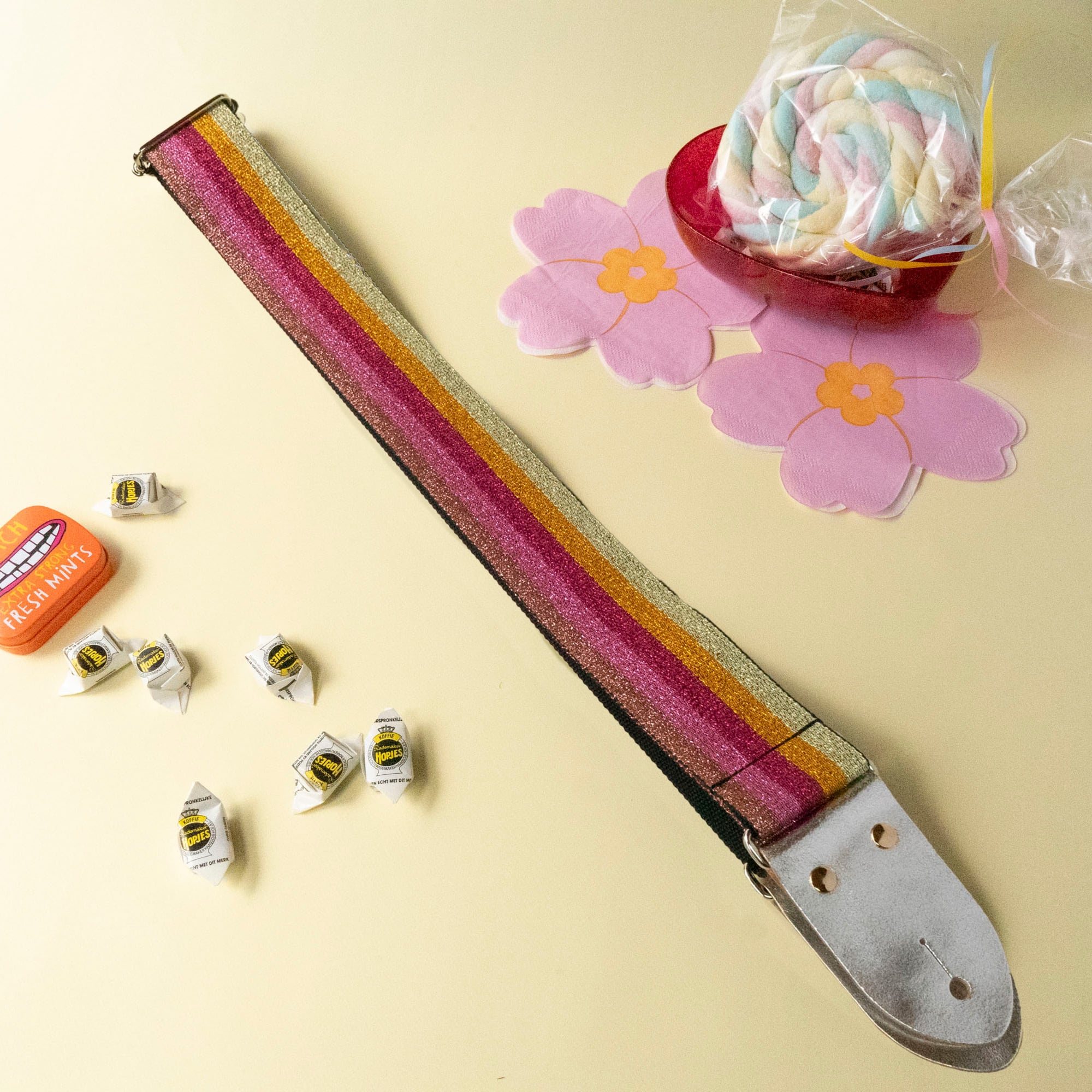 虹色は6色、パープルとピンクは5色のラメラインが輝く外国製のPP(ポリプロピレン)ベルトで、従来のレインボー柄のように子どもっぽくなり過ぎず、クール系にもモード系にもハマるデザインです。