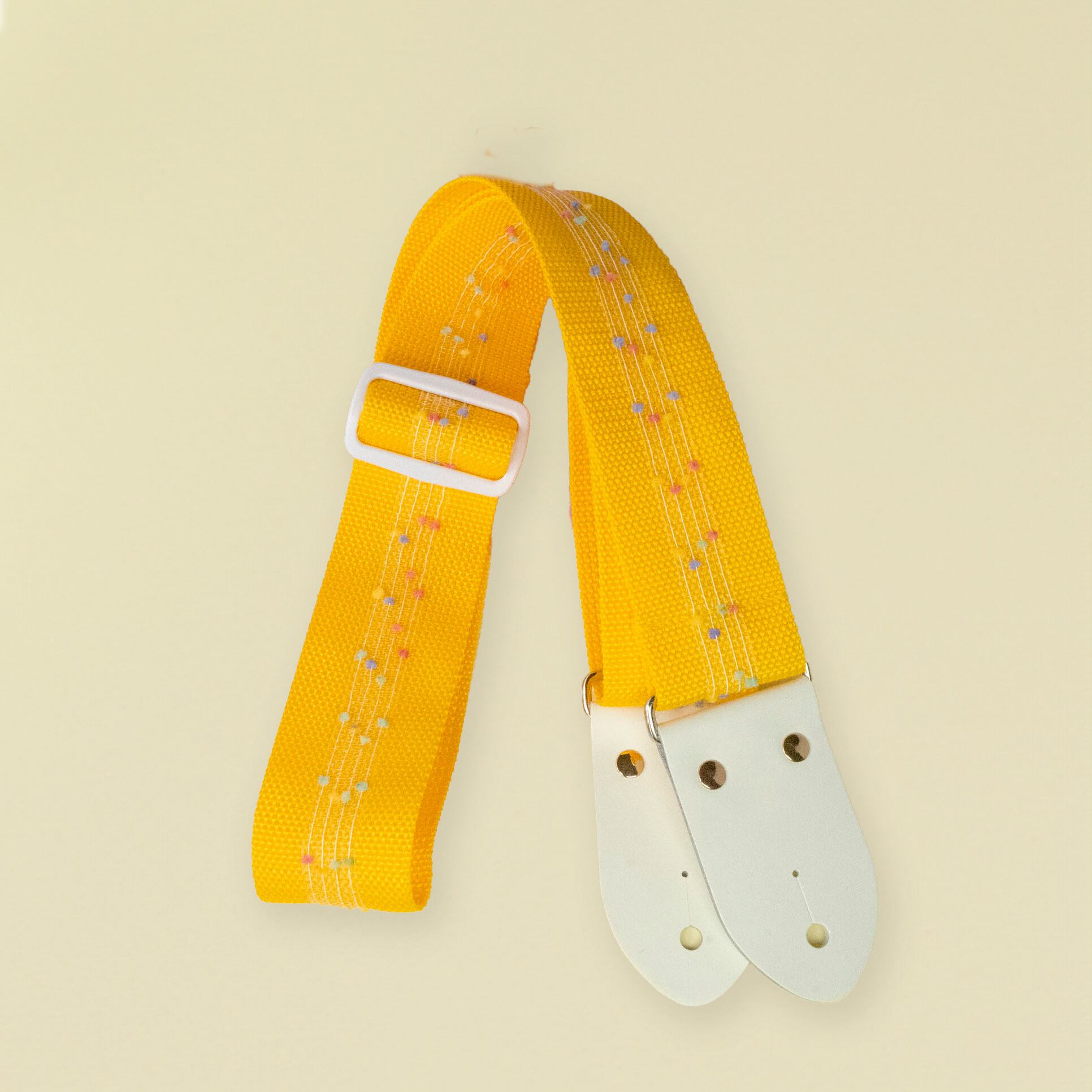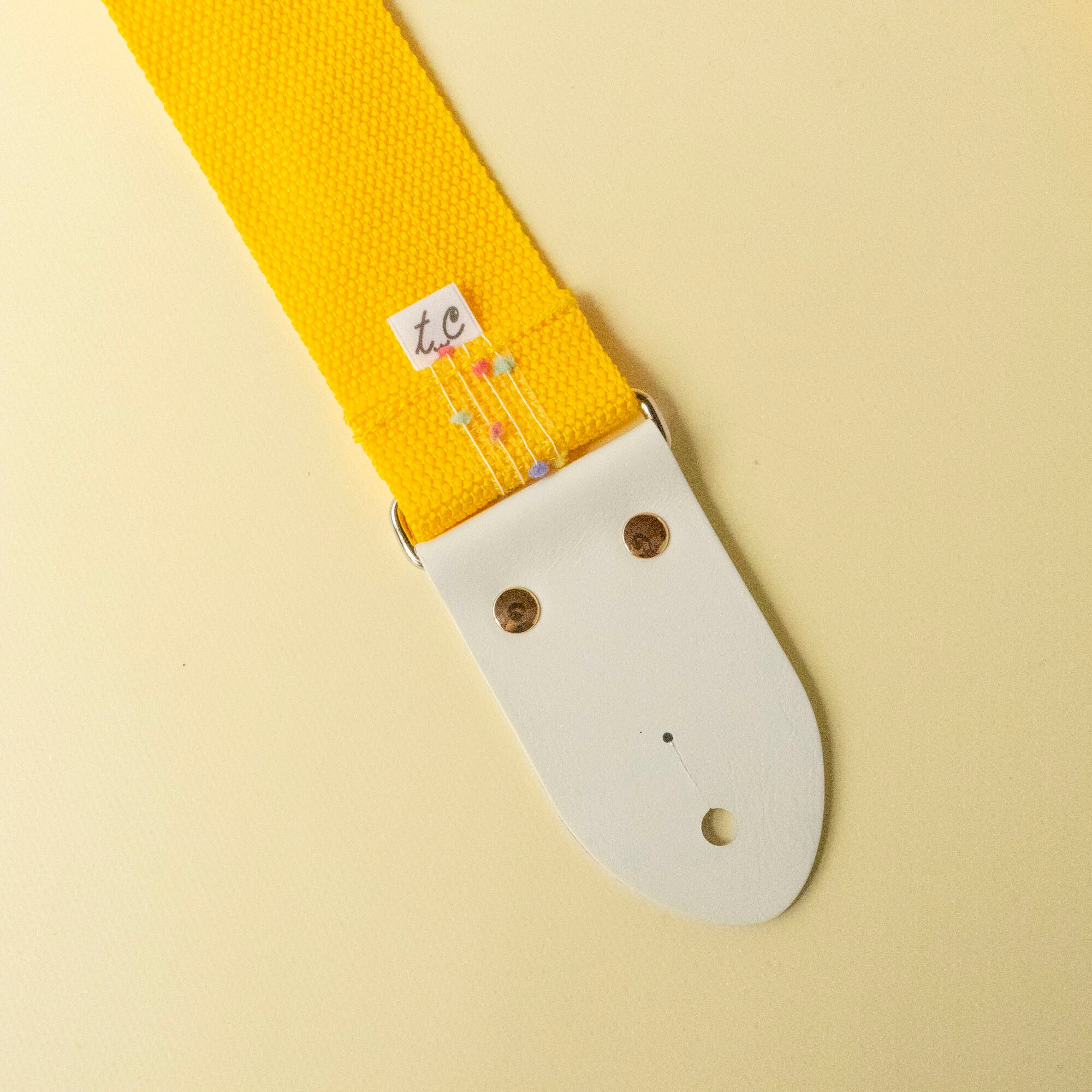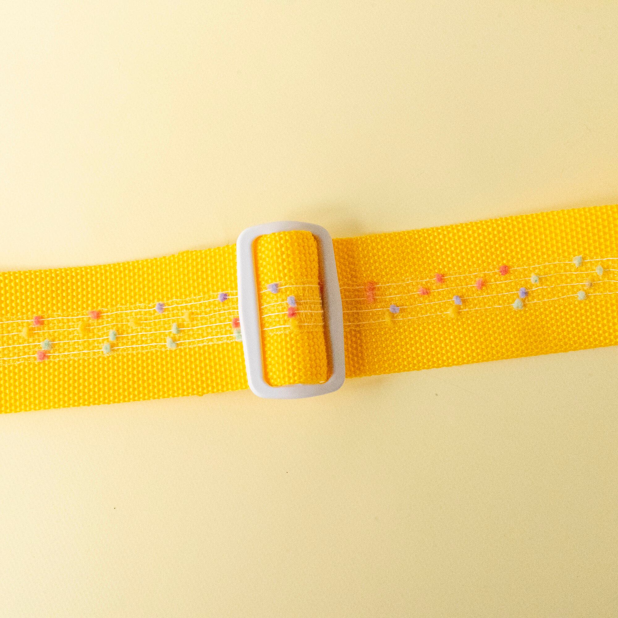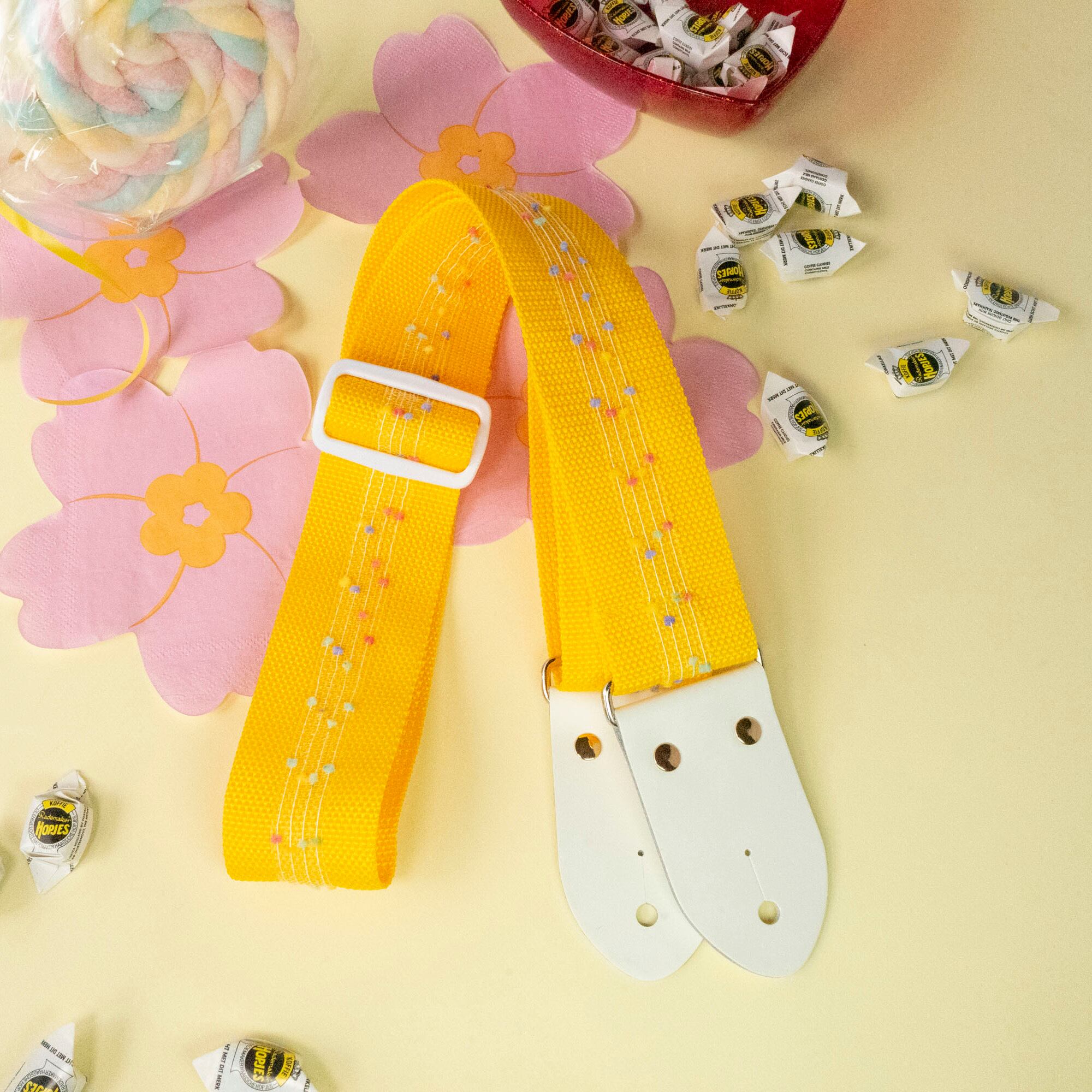 ミモザイエローのPP(ポリプロピレン)ベルトに、ポップキャンディを散りばめたような透け感のあるリボン装飾を施したデザインで、アジャスターとストラップエンドをホワイトにして、ごちゃごちゃしすぎないPOPさにまとめました。カシメをゴールドにすることで、より女の子感を前面に押し出しています。