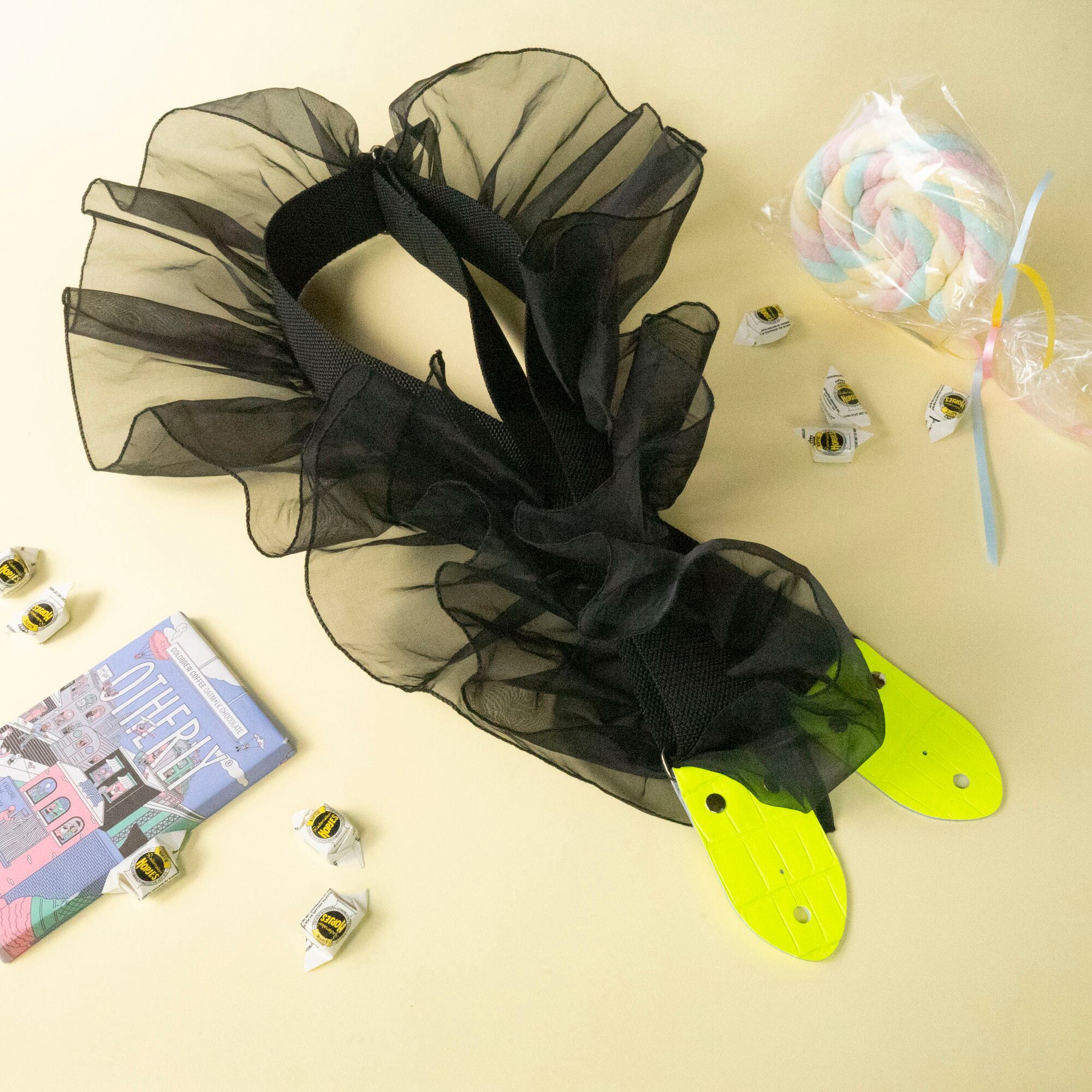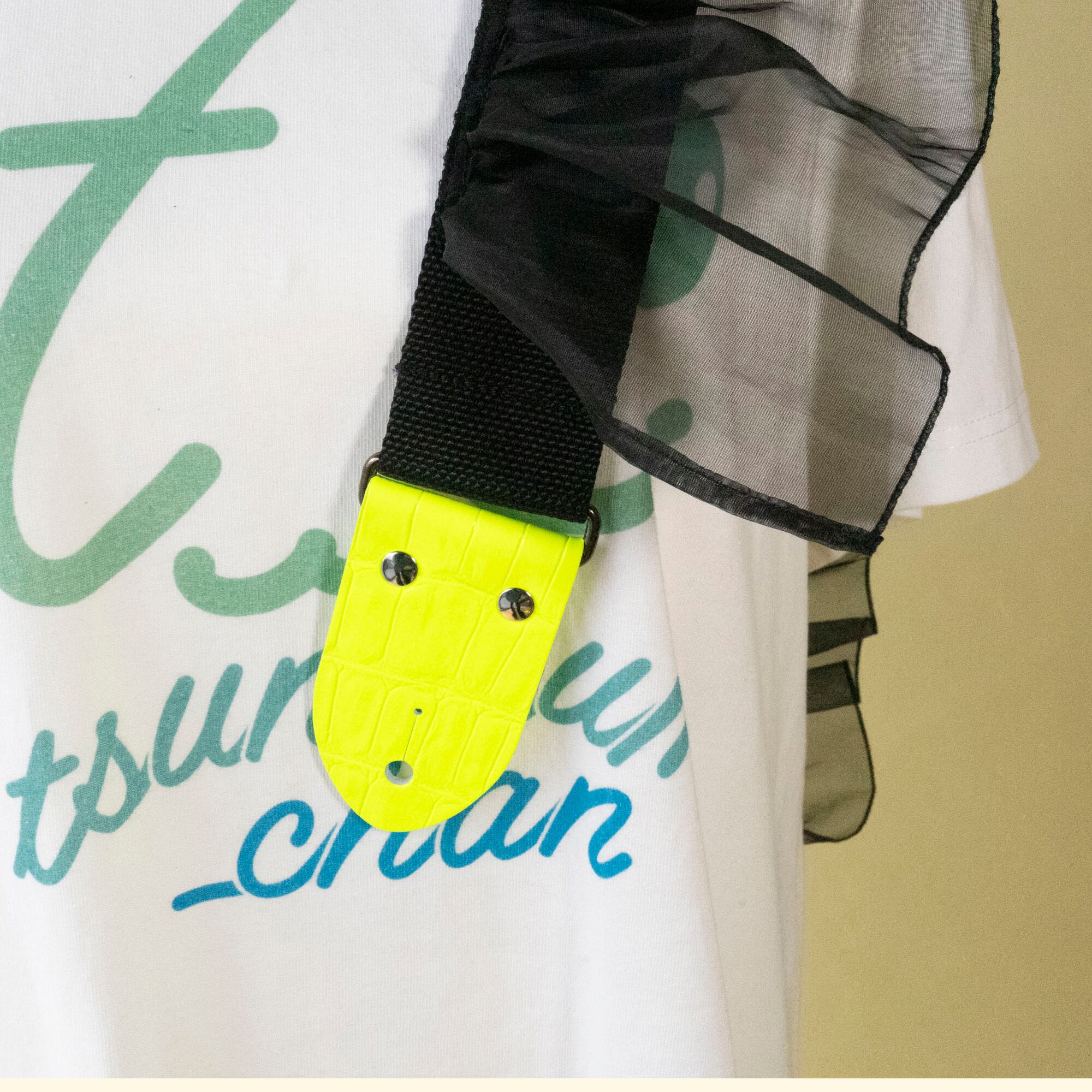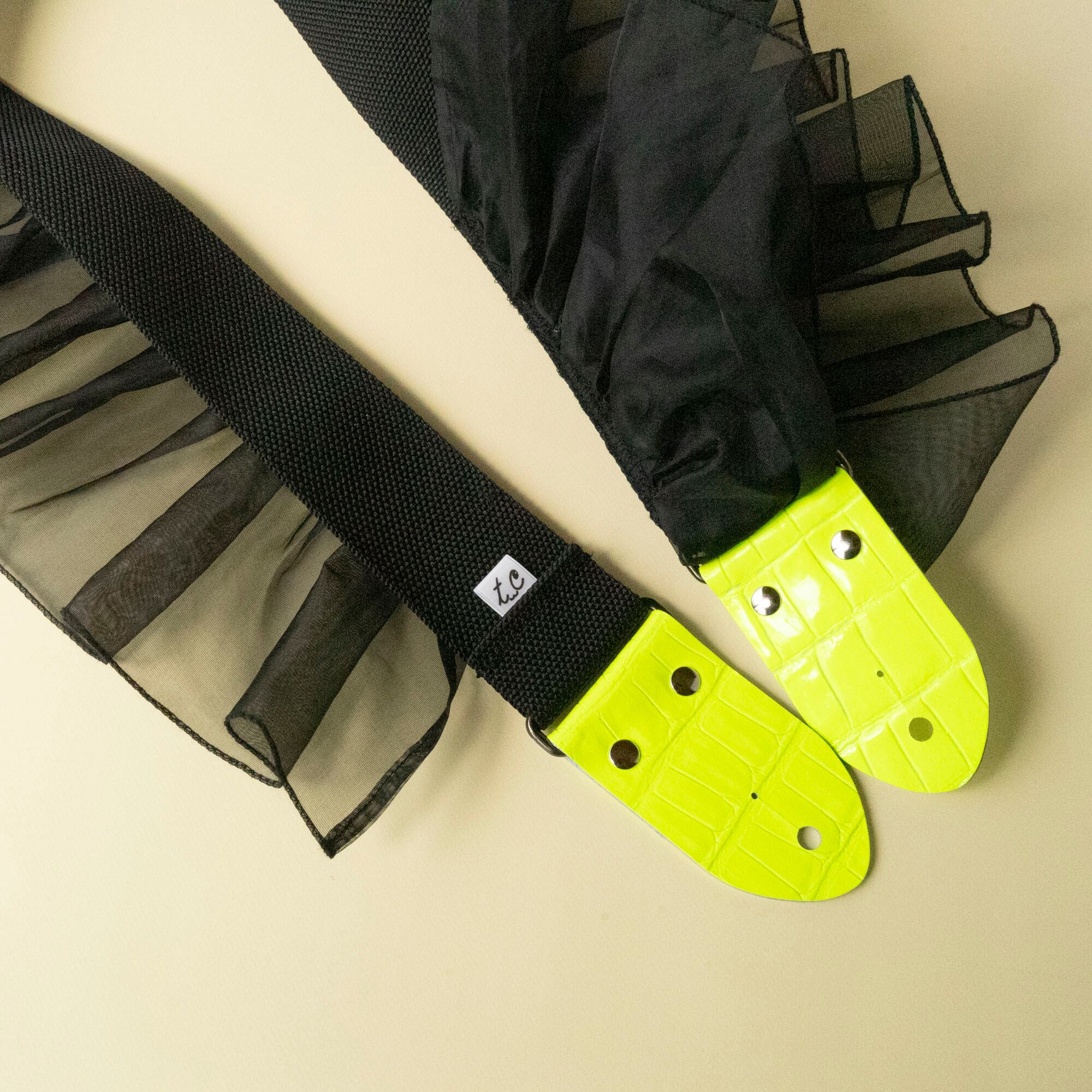 張りのあるゴージャスなフリルが評判の「黒フリルギターストラップ」に、ネオンイエロー革の「イェイイェイエロー」シリーズが登場!
