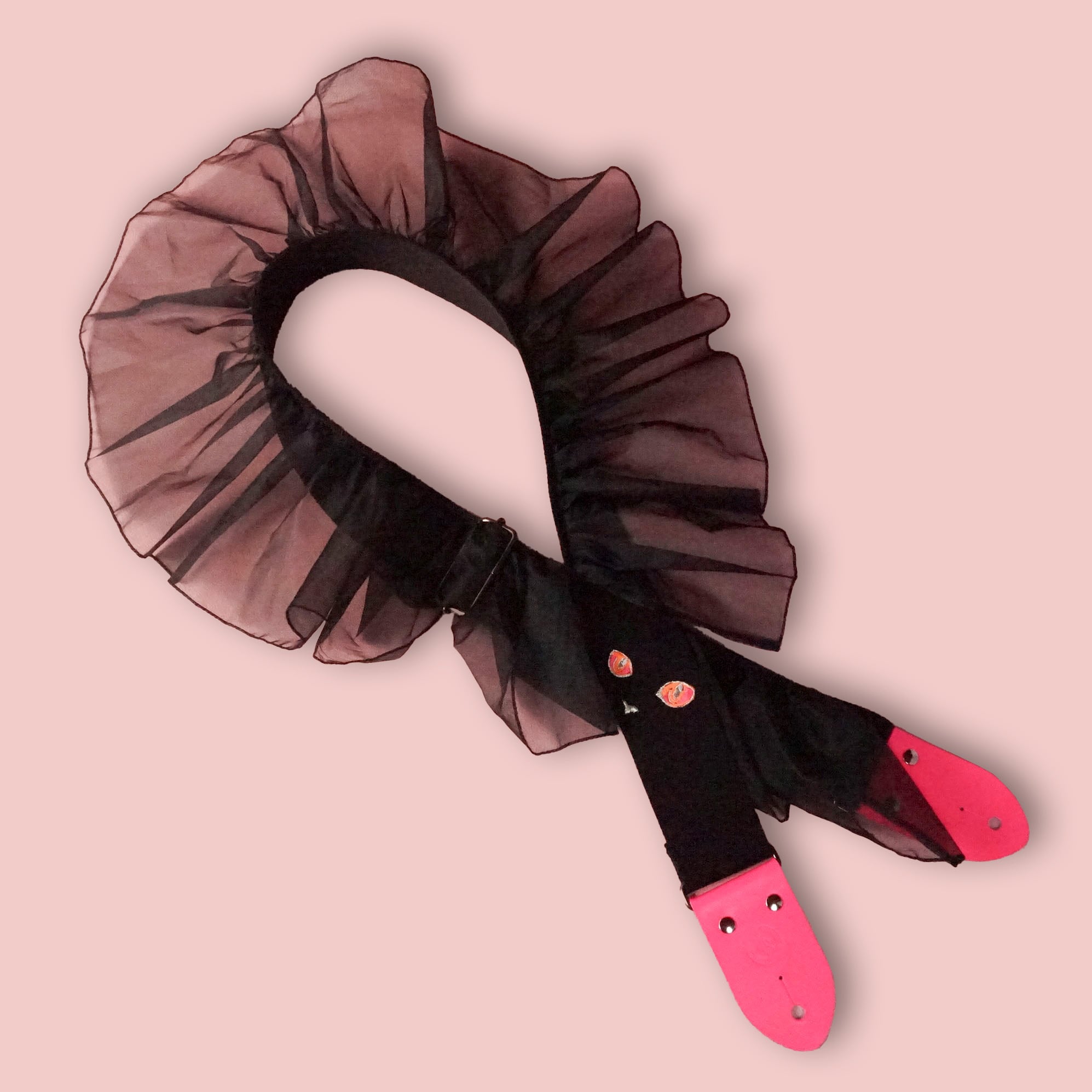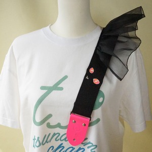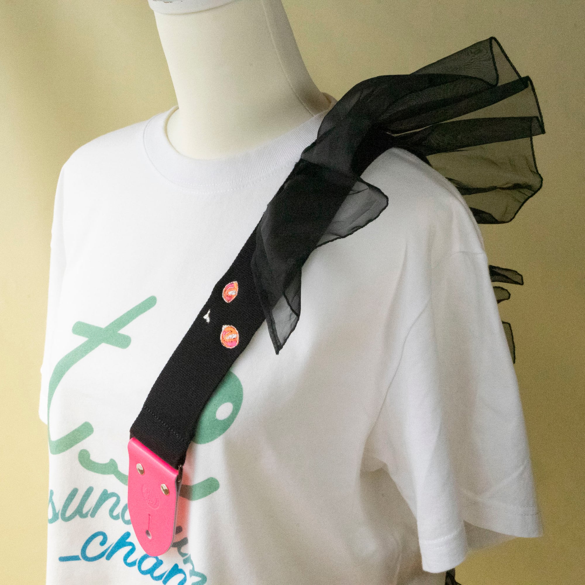 柔らかくて肩馴染みの良いアクリル製のベルトを使用。黒ベルトに映える、シルバー・ネオンピンク・ネオンオレンジのド派手カラーで大人気の猫目を刺繍し、張りのあるゴージャスなフリルを思う存分付けました。
