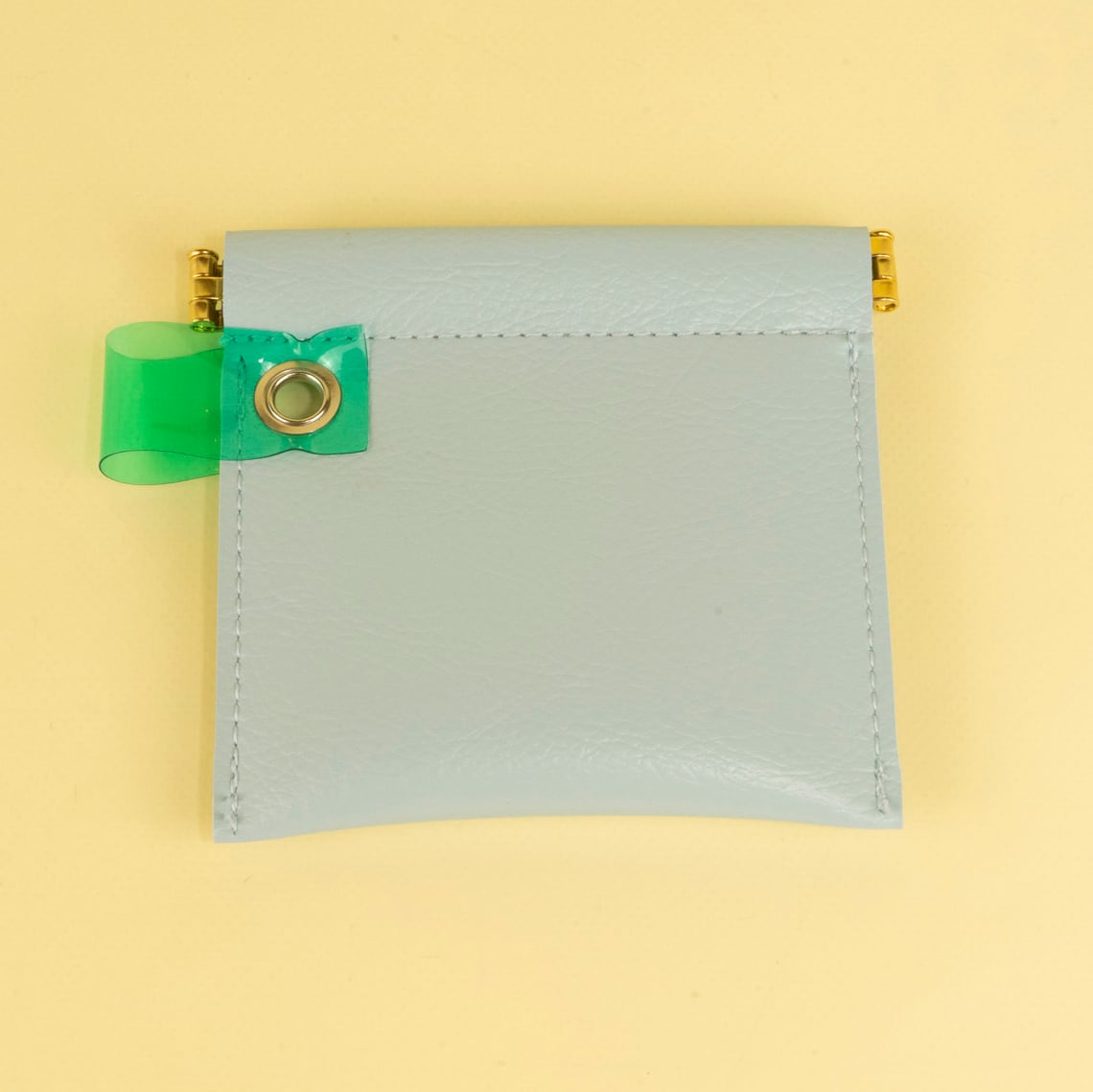 開け口がバネ口金なので片手で容易に開け閉めができ、tsundrum_chanのアイテムでお馴染みのハトメ穴や「耳」がついているので、カラビナ等でケースや鞄にぶら下げてもお使いいただけます。