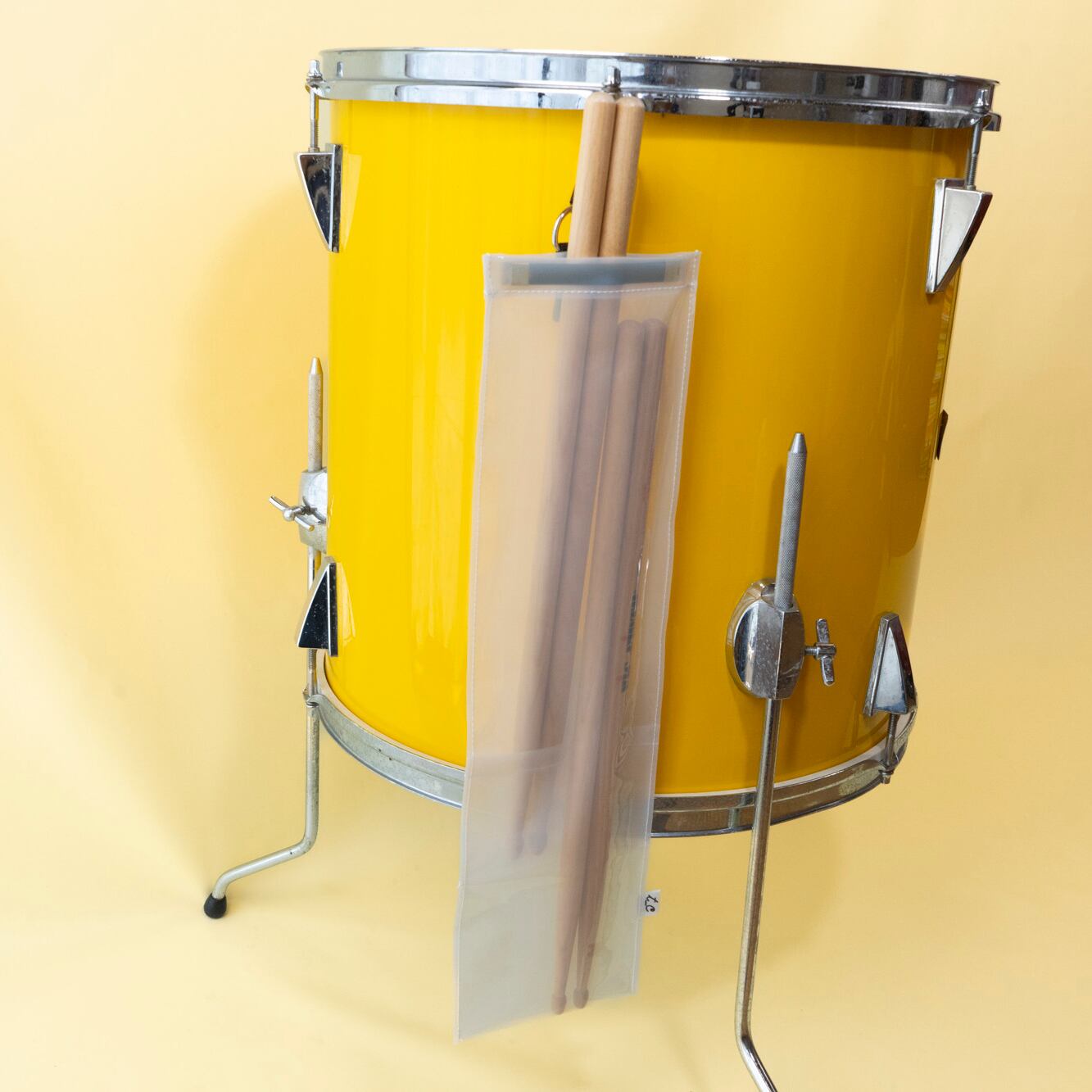 フロアタムにぶら下げるときは、内側のスティックポケットにスティックの先を入れれば、持ち手部分が飛び出して、演奏中のもしも!の時にも取り出しやすい仕様になっています。