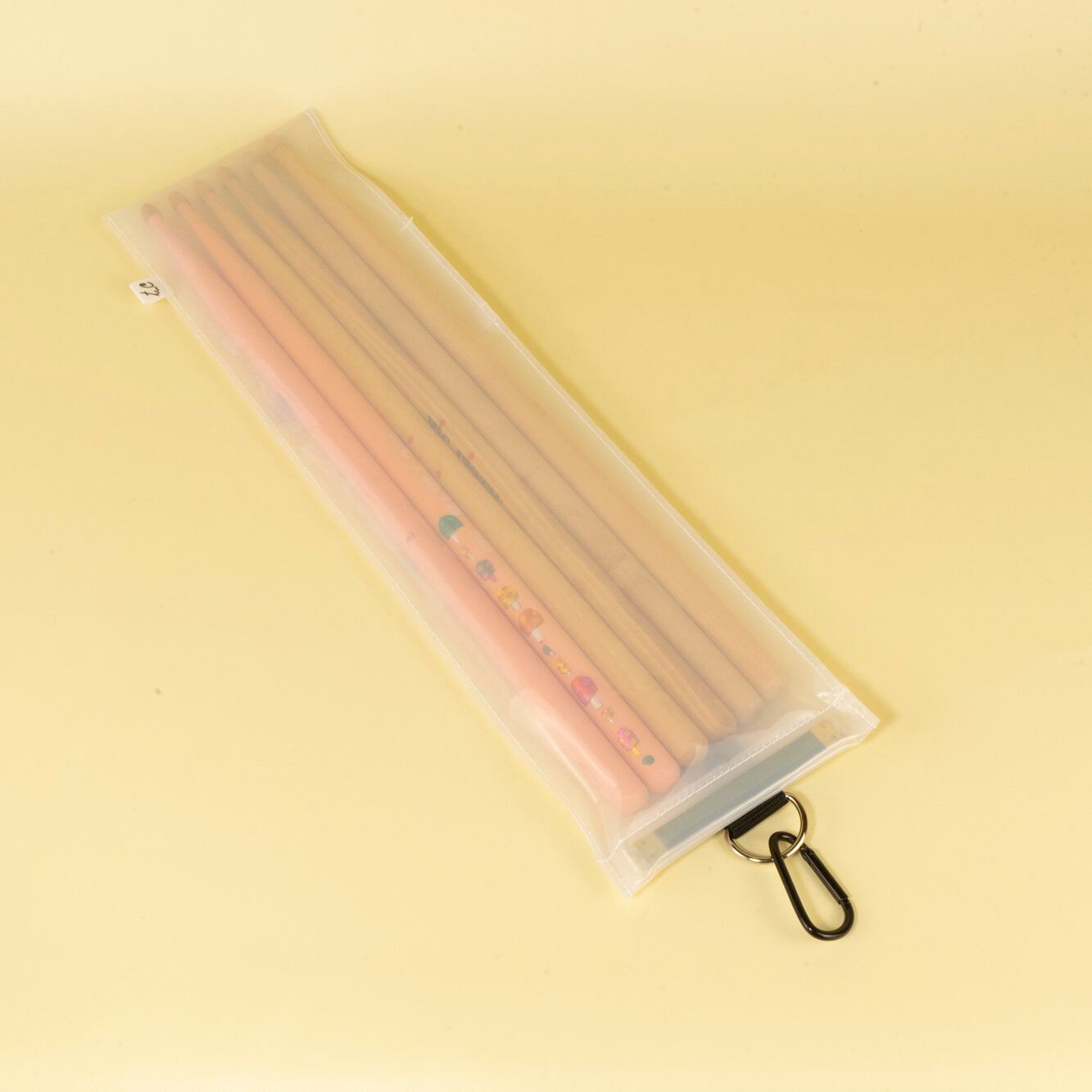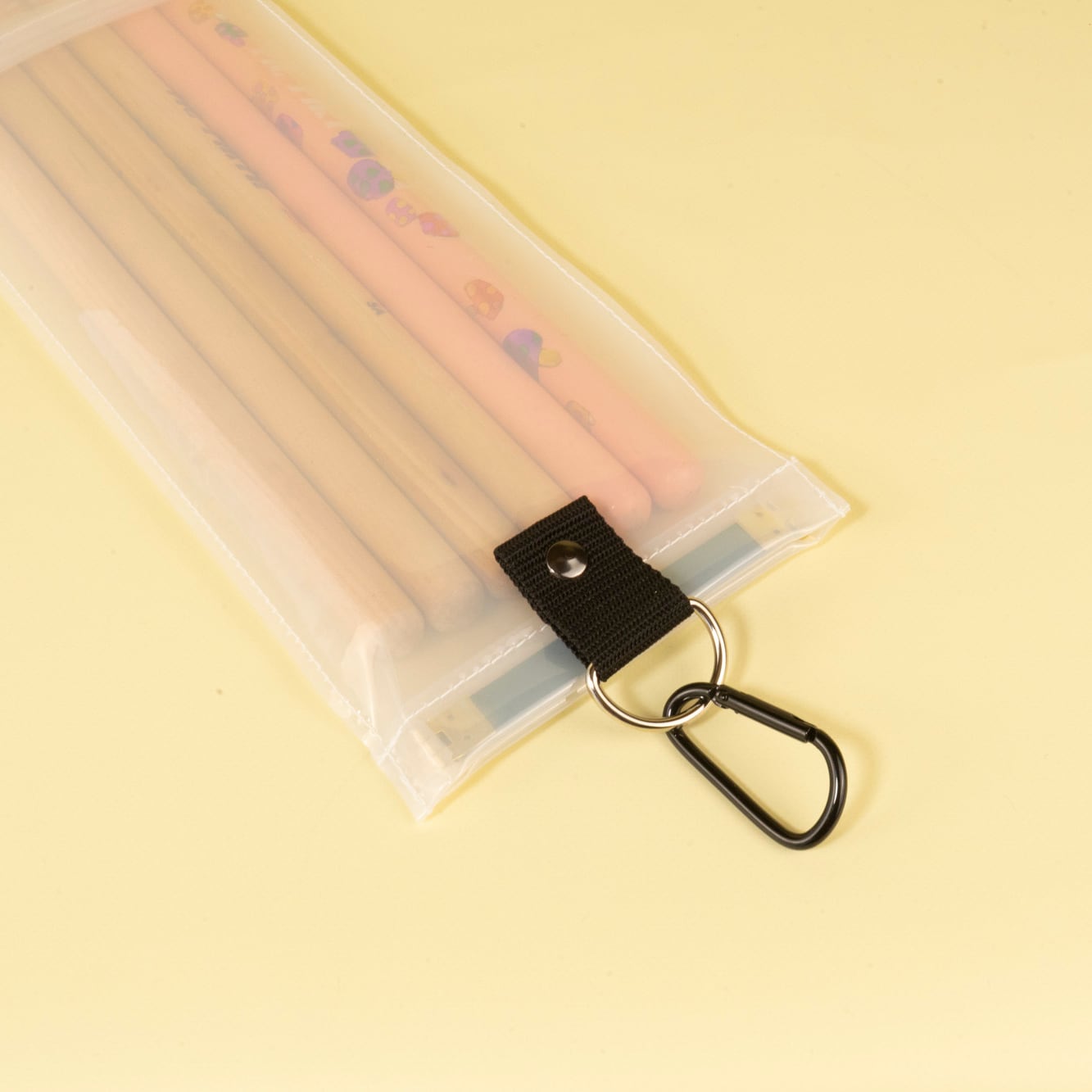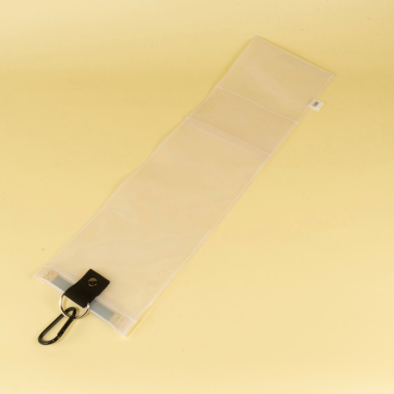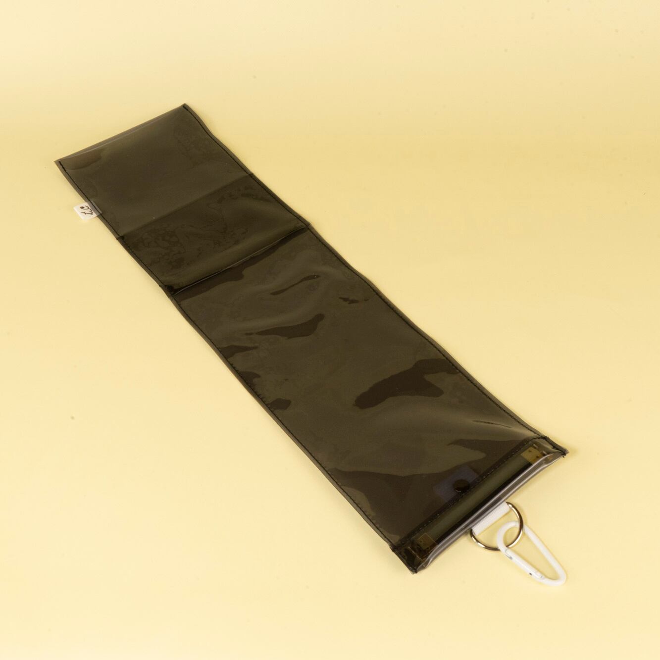 透け感のあるビニール素材やカラーカラビナはそのままに、色づかいだけでグッとクールな落ち着いた雰囲気を演出できます。