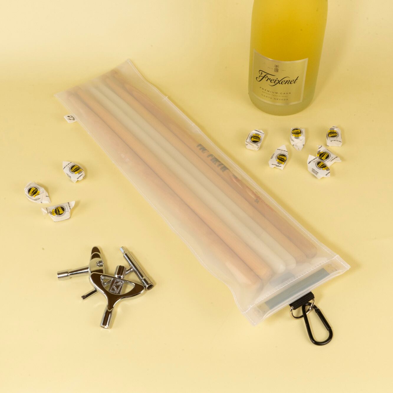 演奏中、ドラムに引っかけて使用したい方の為にカラビナが一つだけ付けました。