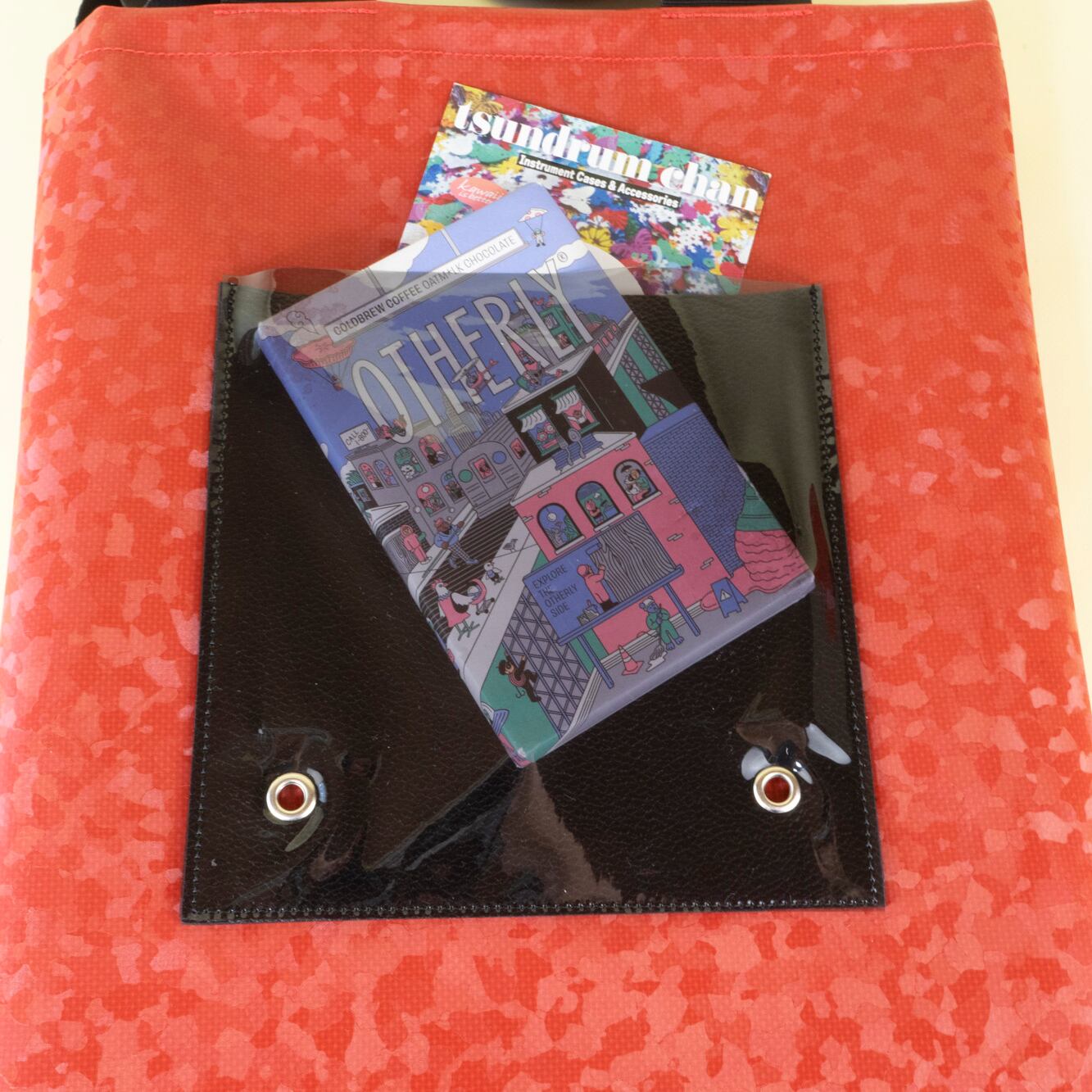 前面にあるハトメ付きの2重ポケットは、内側にブラックレザーを外側に透け感のあるPVCを使い、見える仕様はそのままに隠す機能もプラス。