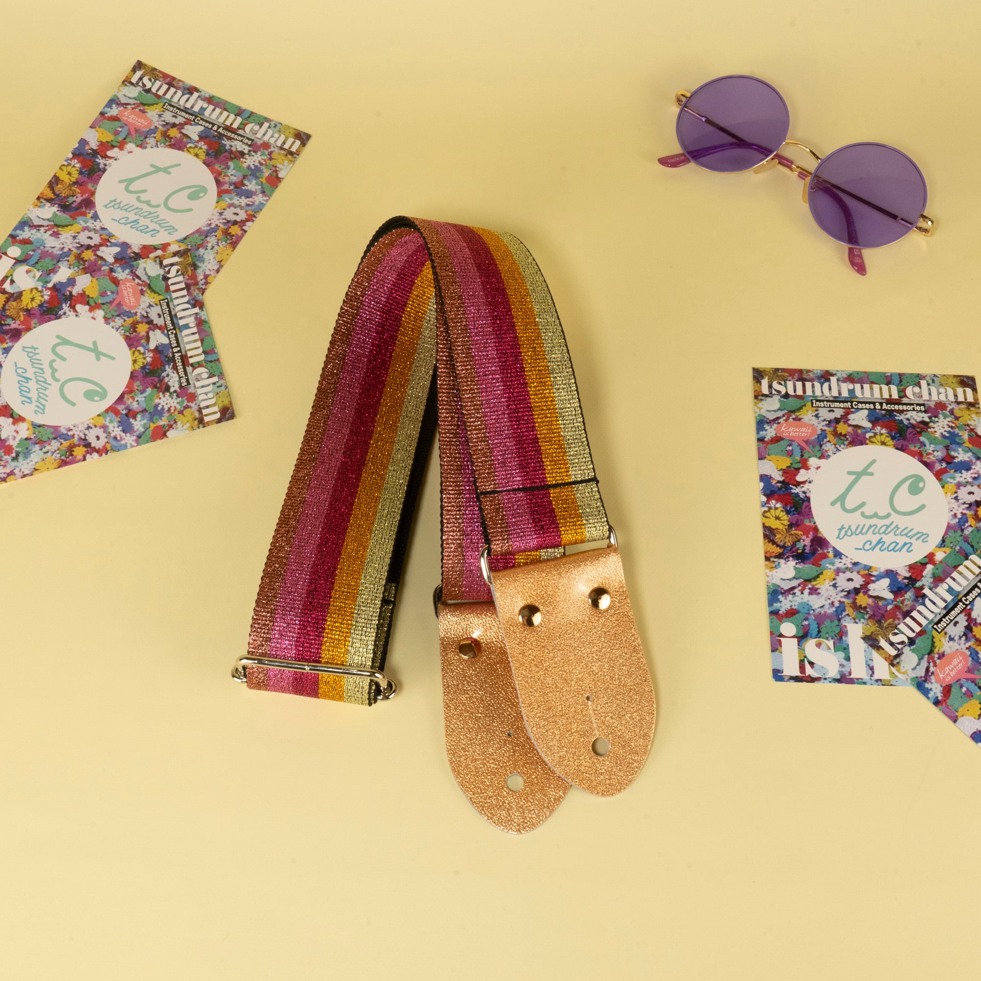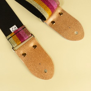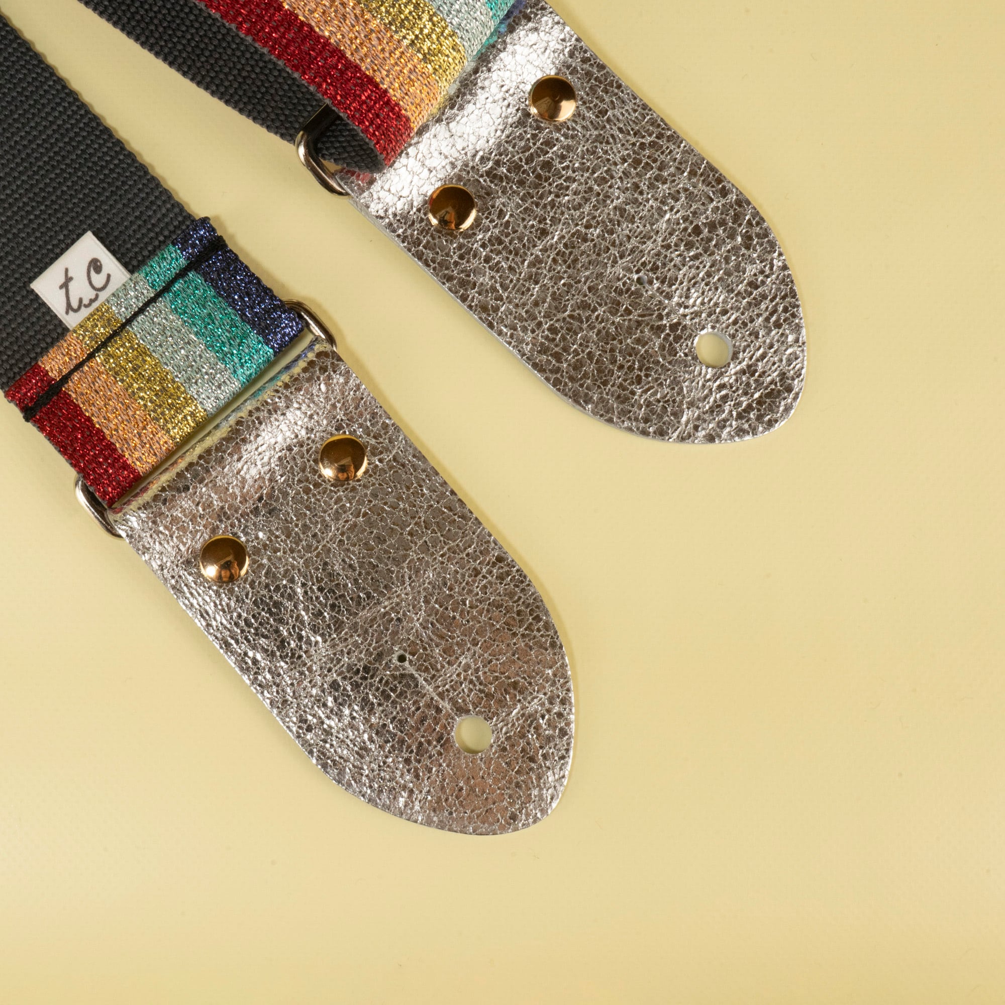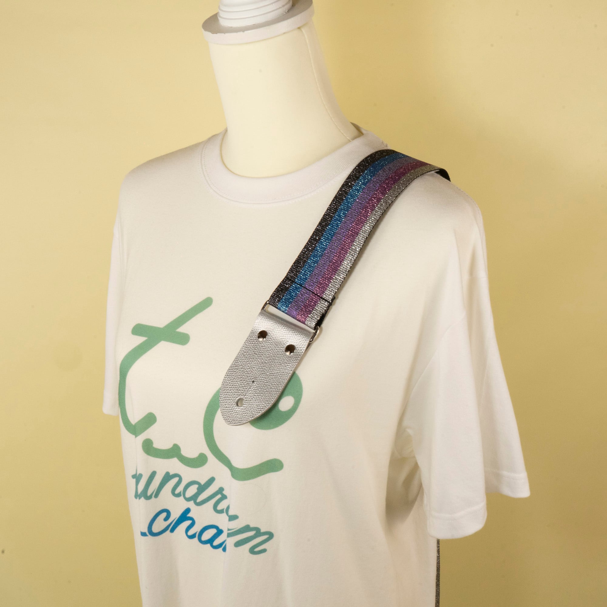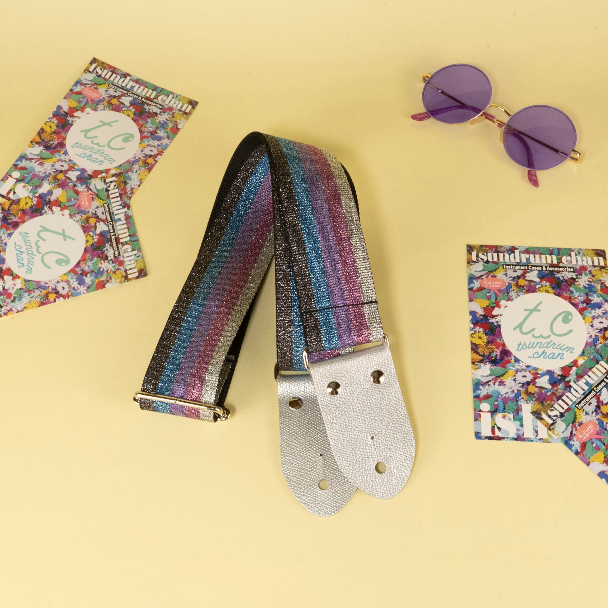 ストラップエンドは、虹色には従来のクラック加工が施された光り輝くシルバーの、使うほどにひび割れていく過程を楽しむスペシャルな質感。カシメを敢えてゴールドにすることで、キラキラ度120%です。パープルには細かいシボとキラ付きが控えめなシルバー革、ピンクにはピンクゴールドのグリッターエナメル革を使用しました。