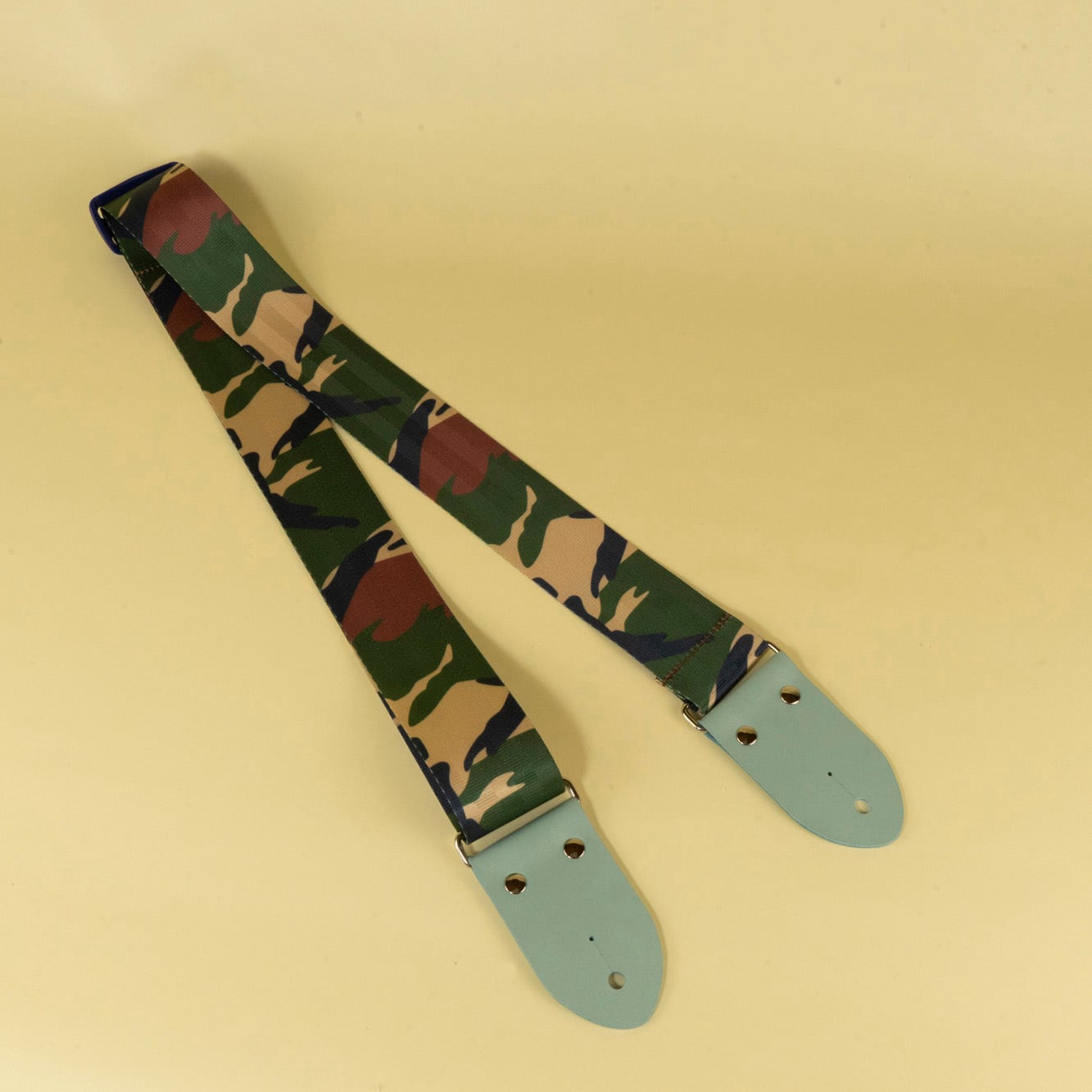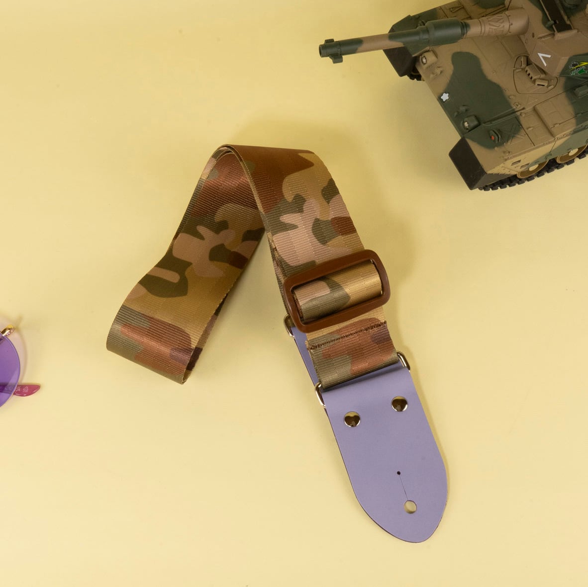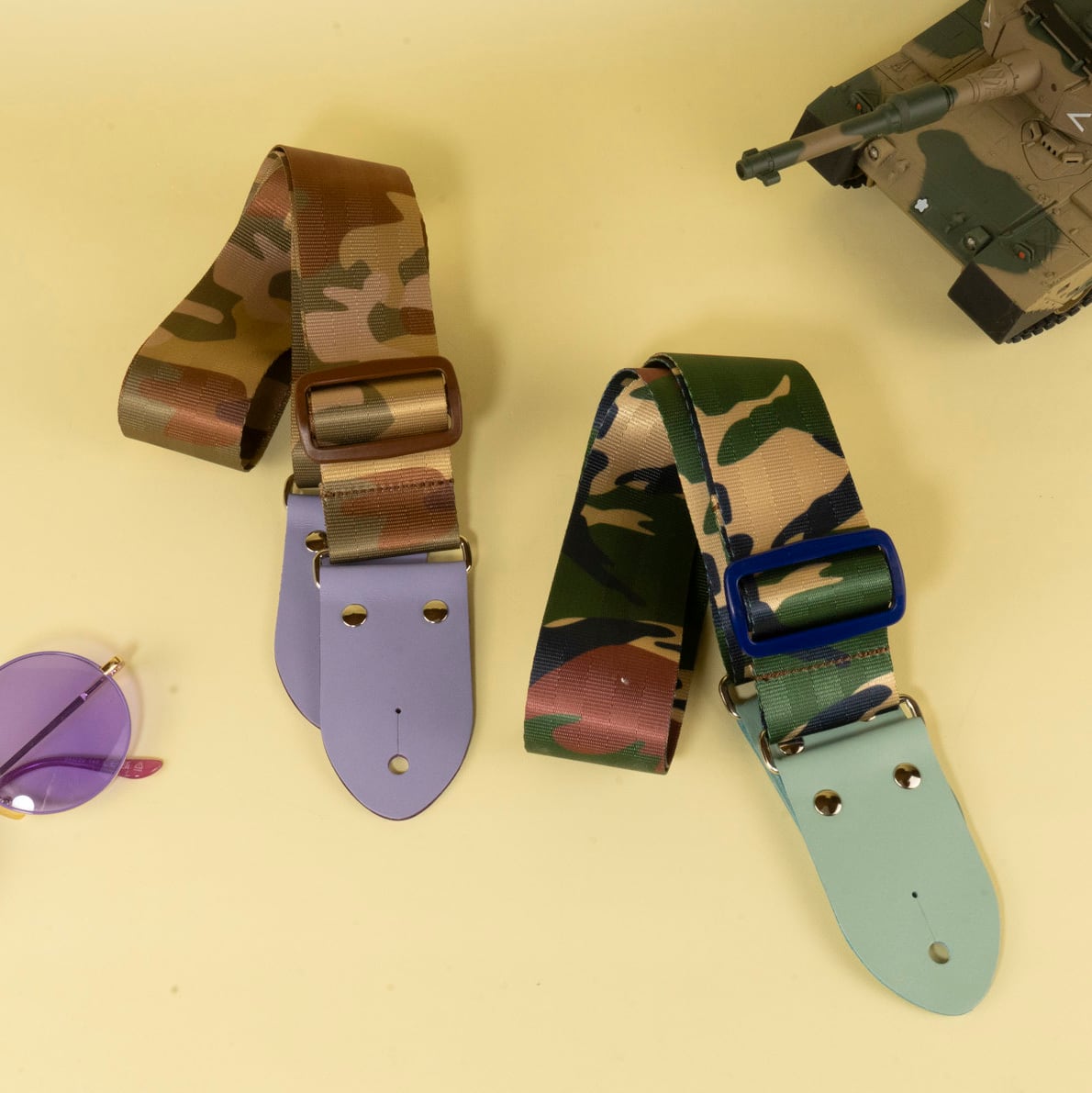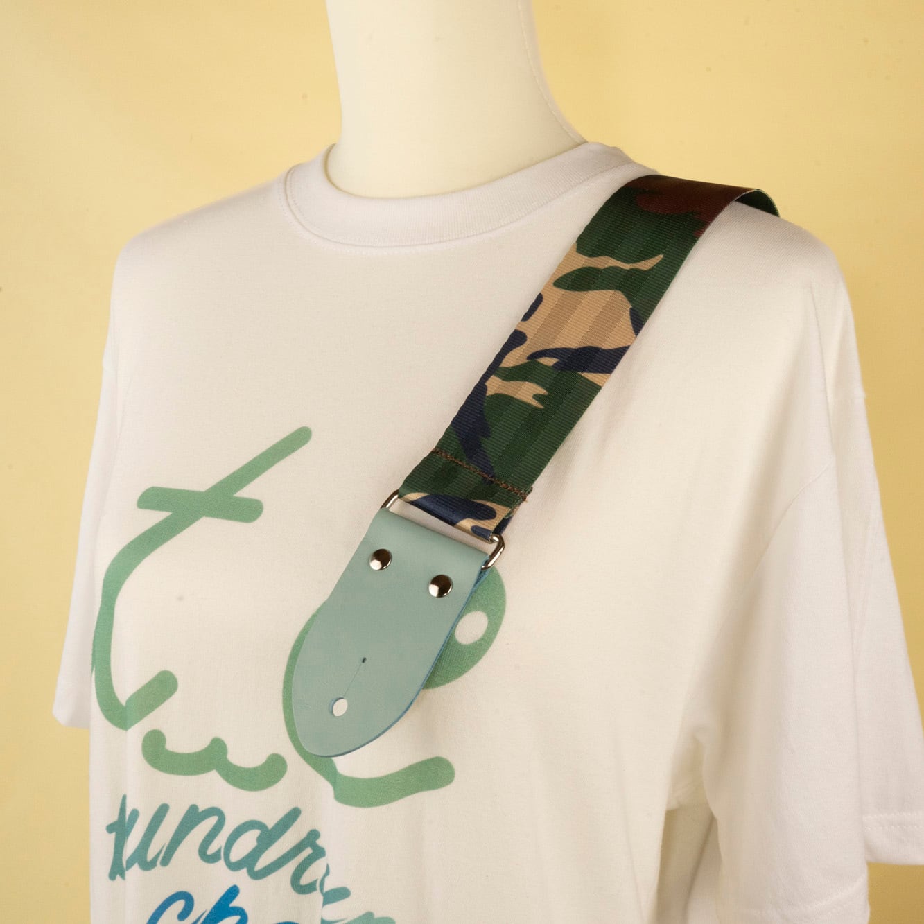 滑らかで肌辺りもよいシートベルト素材と、鮮やか過ぎないペールカラーのストラップエンドを合わせ、ポップなプラアジャスターでまとめたギターストラップは、迷彩柄をその役割から解き放ち、その模様の煩雑さや色を純粋に楽しめるデザインになっています。