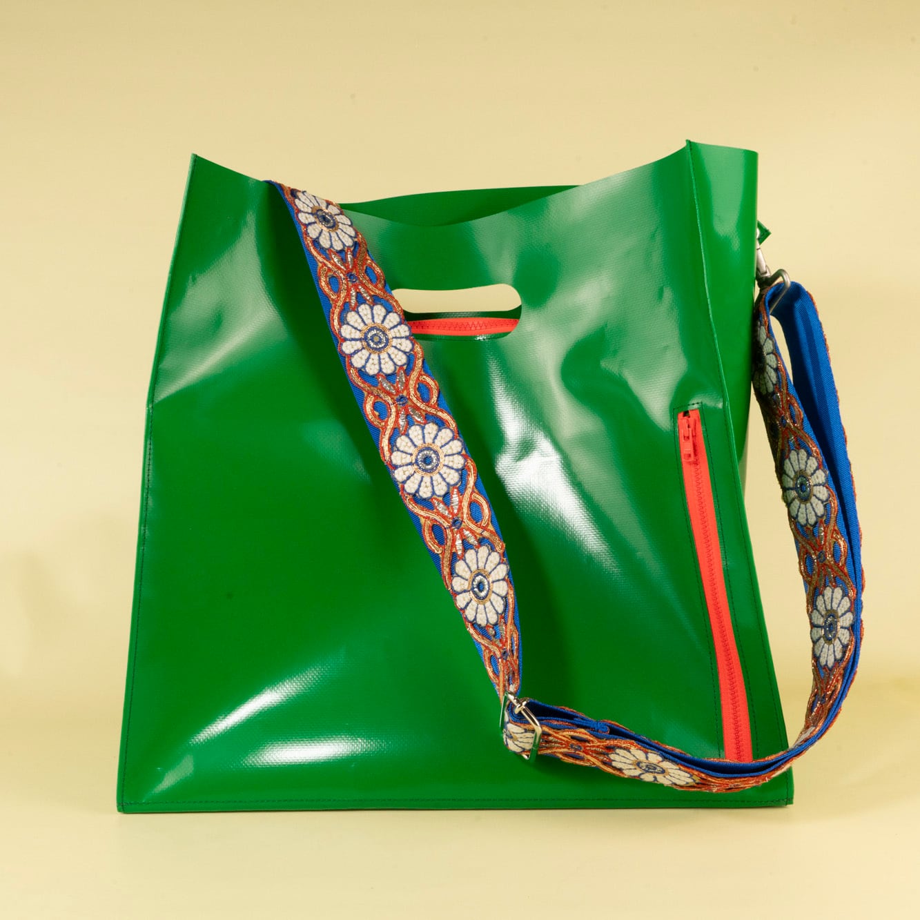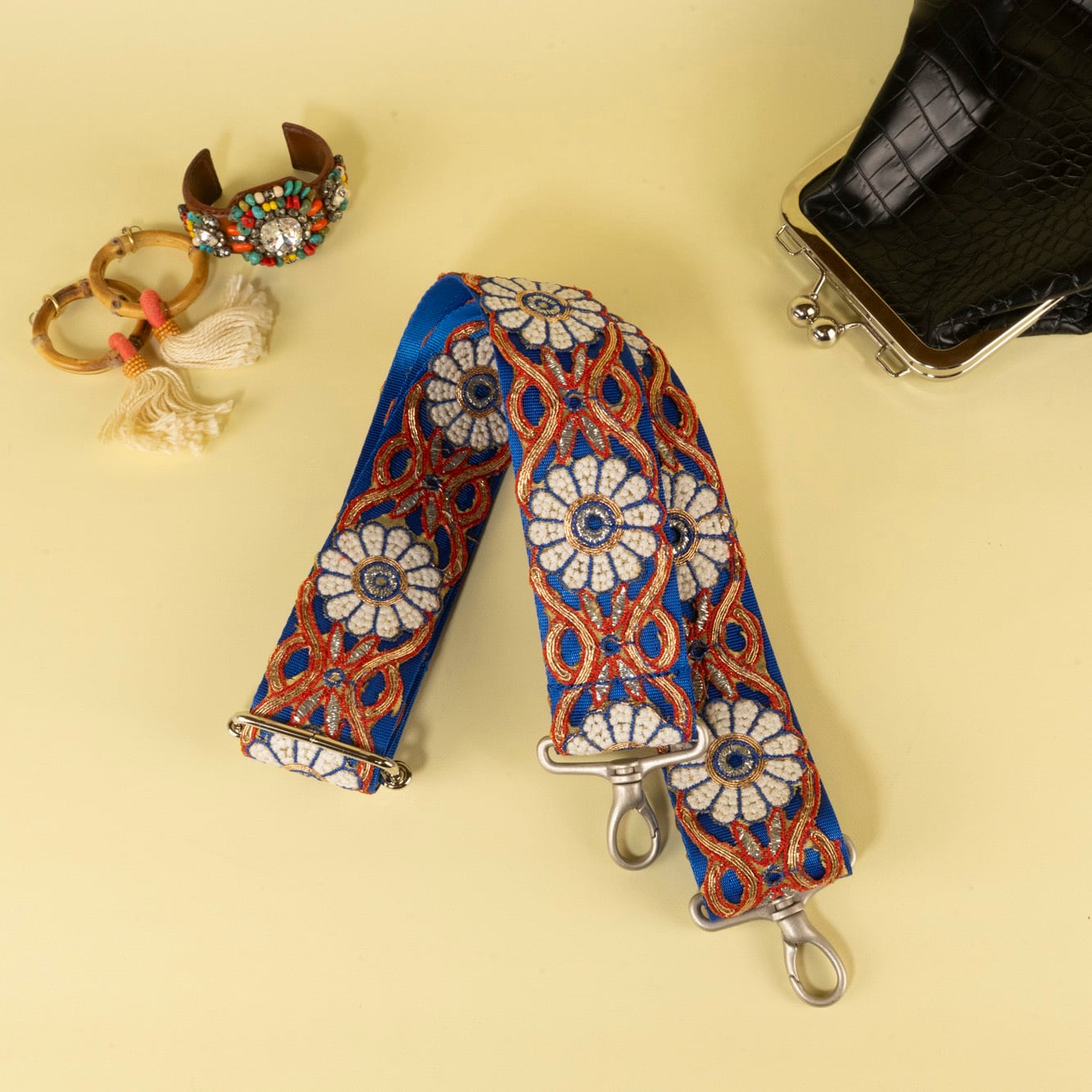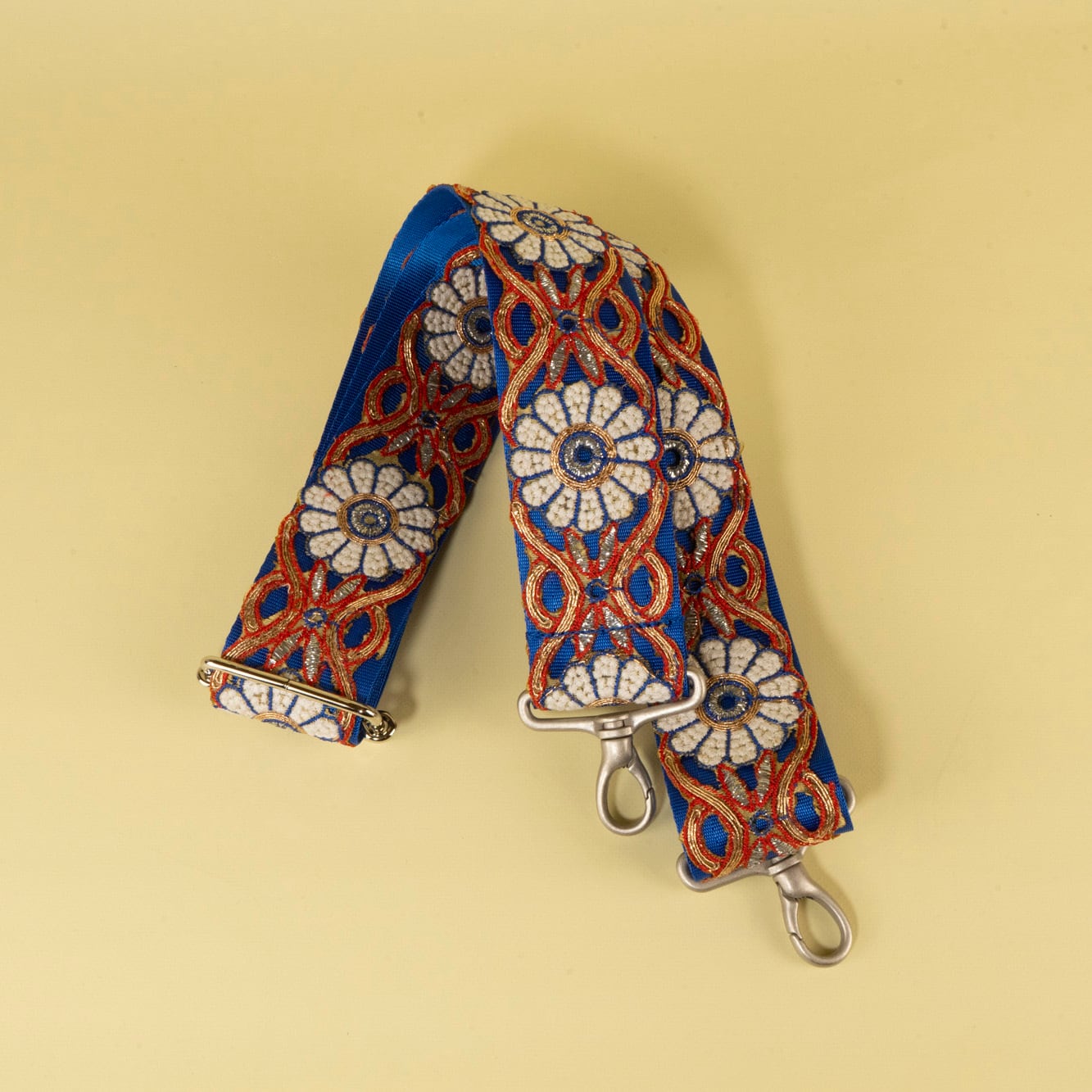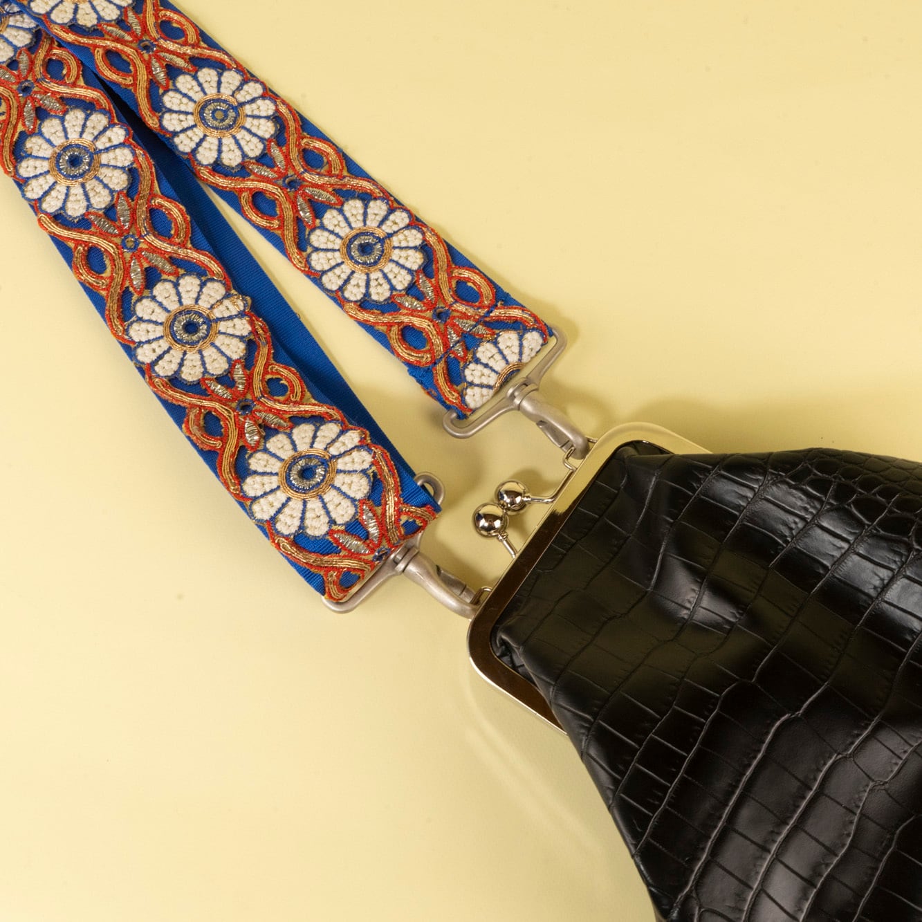 ヨーロピアンブルーのシートベルト素材にオリエンタルな装飾を施したショルダーストラップは、東洋と西洋が融合した独特なデザイン。