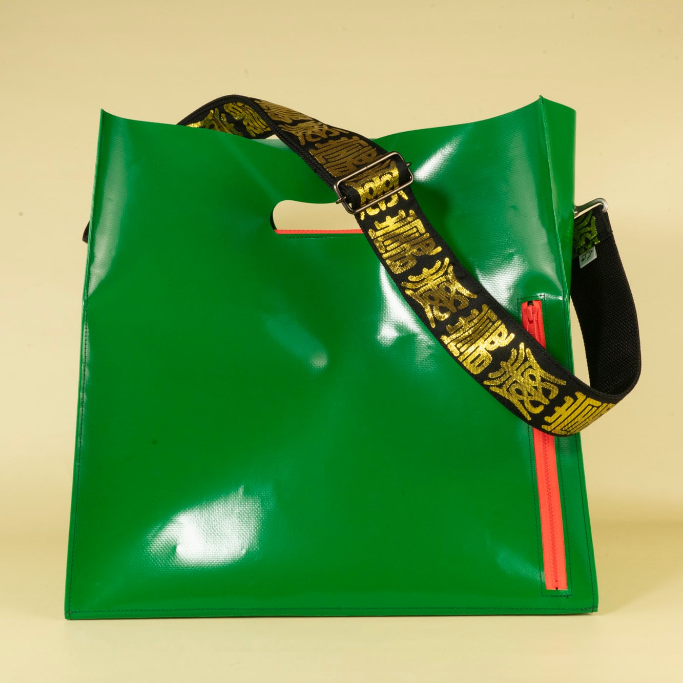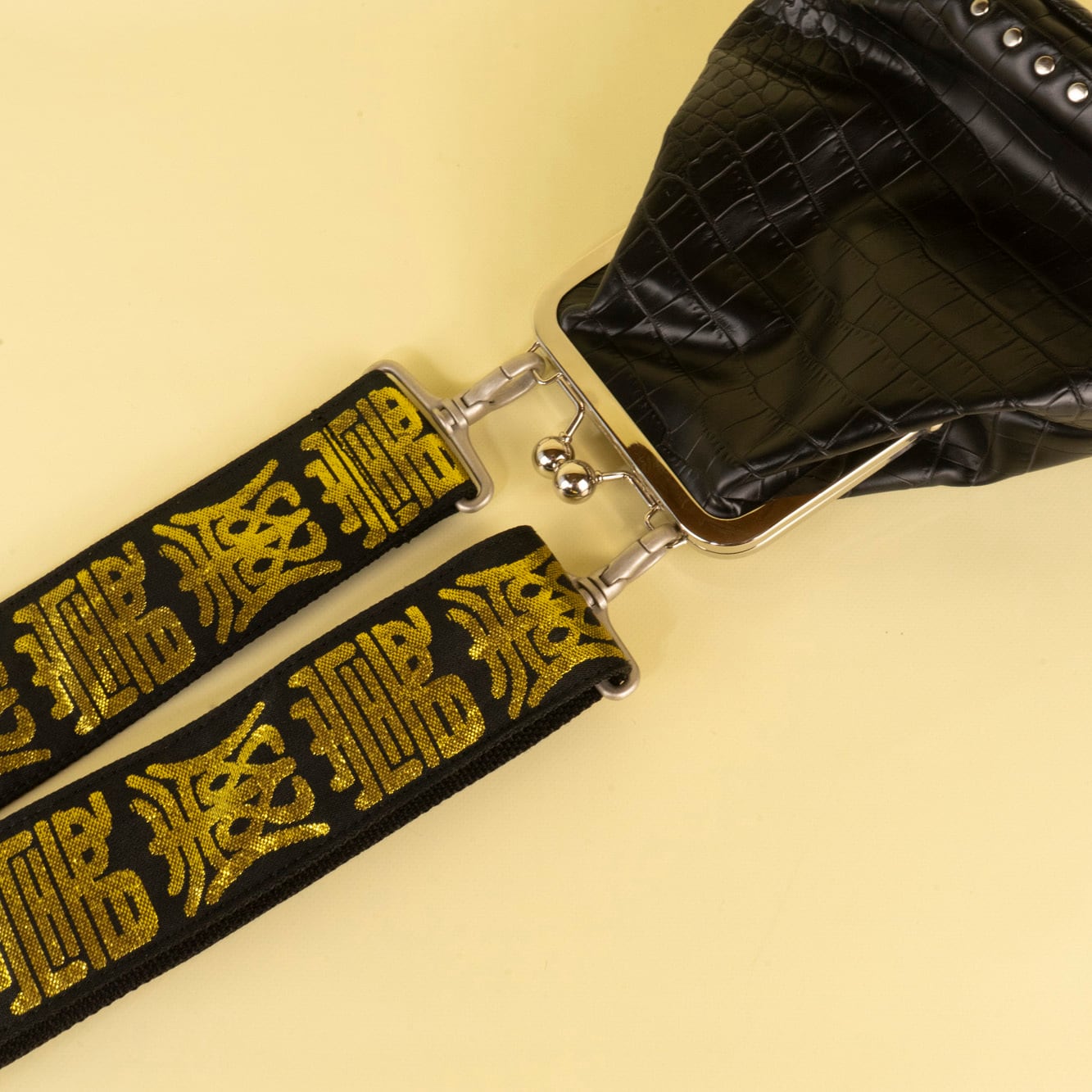 おめでたい「寿」の文字が延々と並ぶ黒×ゴールドの踊り帯を環境に優しく安定性も抜群の黒のポリプロピレンバンド縫い付け、少ない色数ながらキンキラキンにド派手に仕上げました。