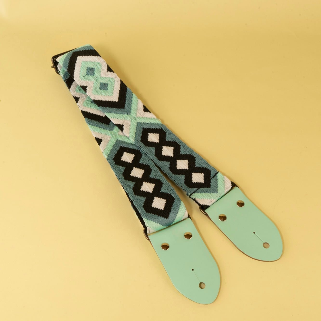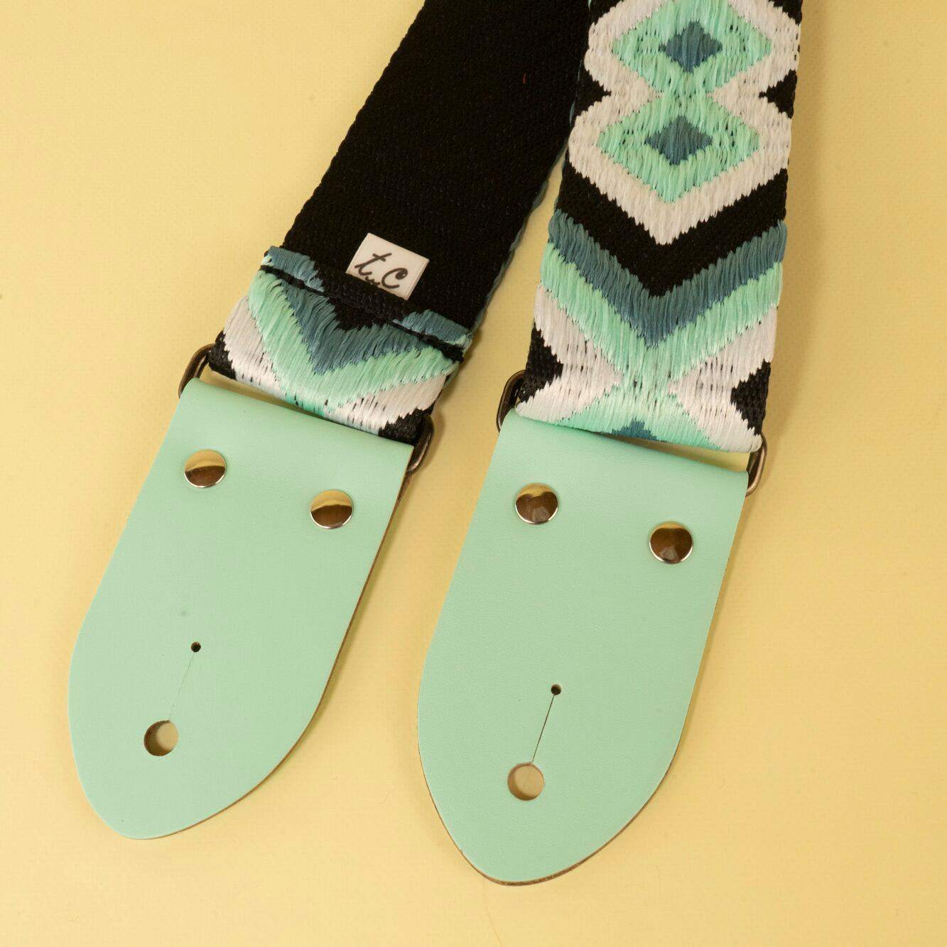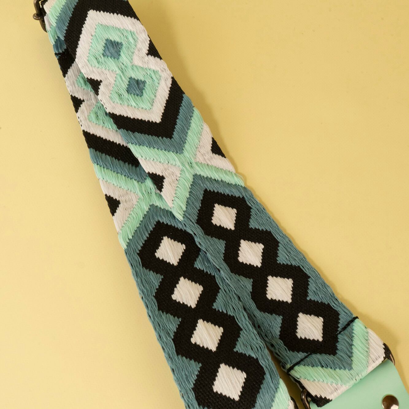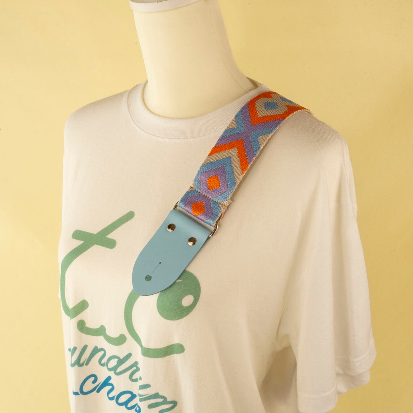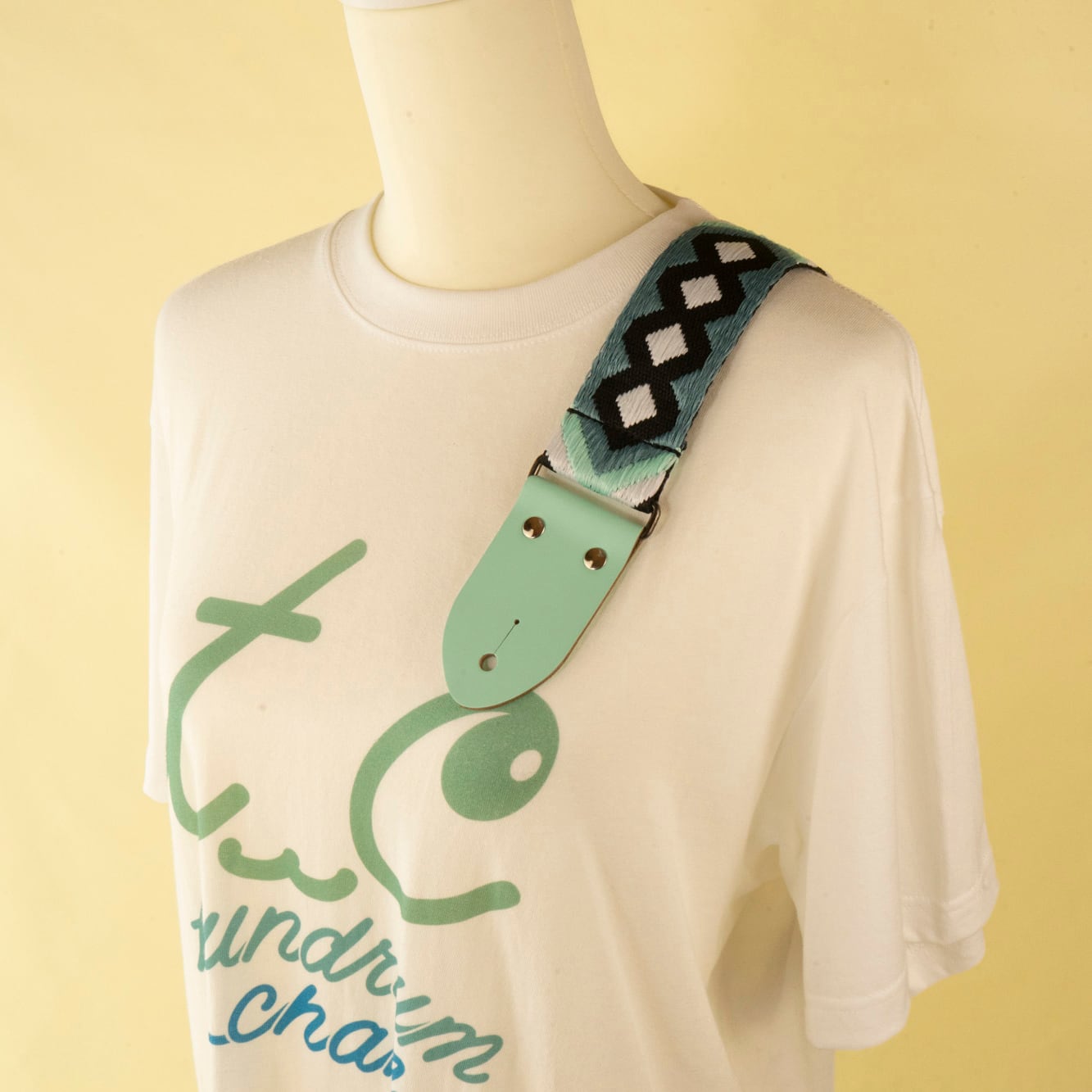 ボヘミアンな印象になり過ぎないよう、ストラップエンドはツヤ感のあるレザーを使用し、ブラック×ミント、ベージュ×水色の賑やかな配色になっています。