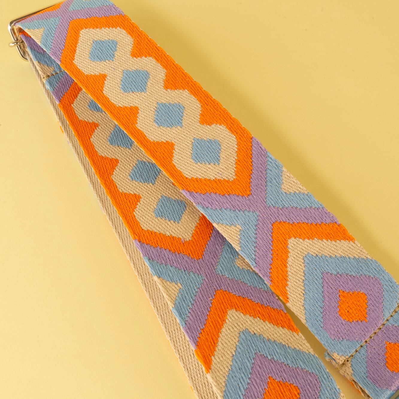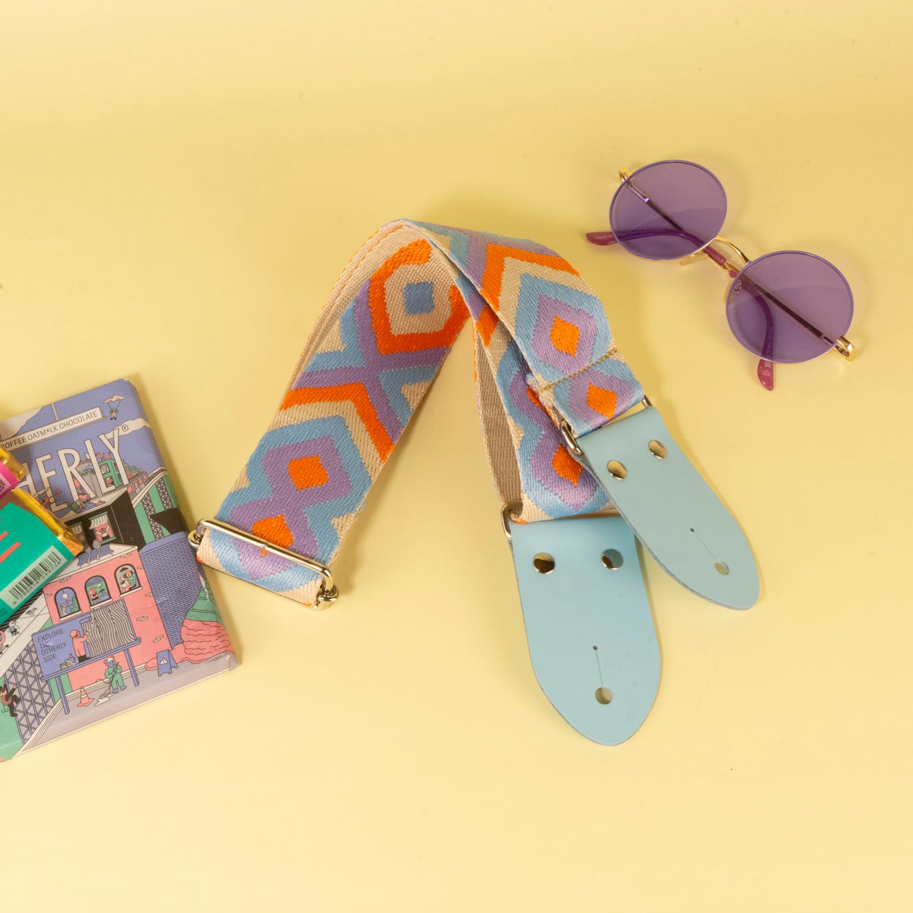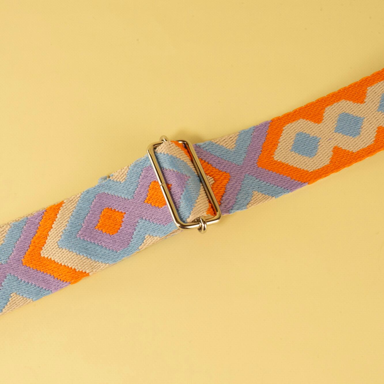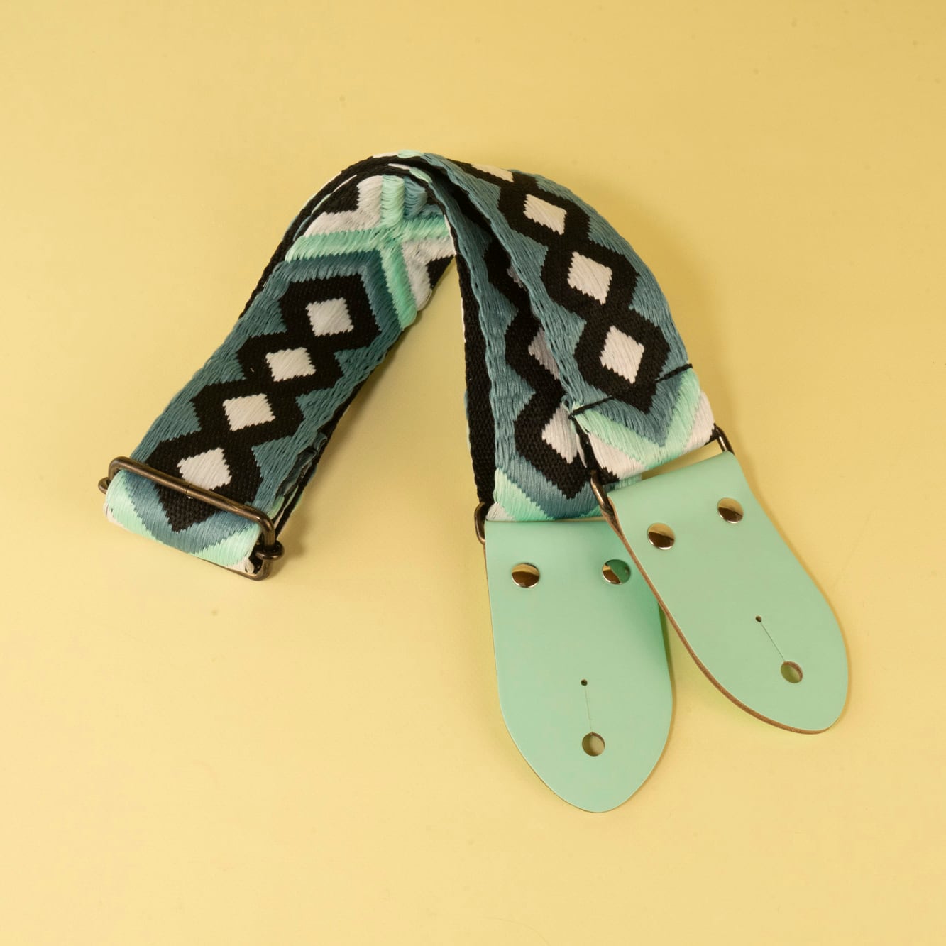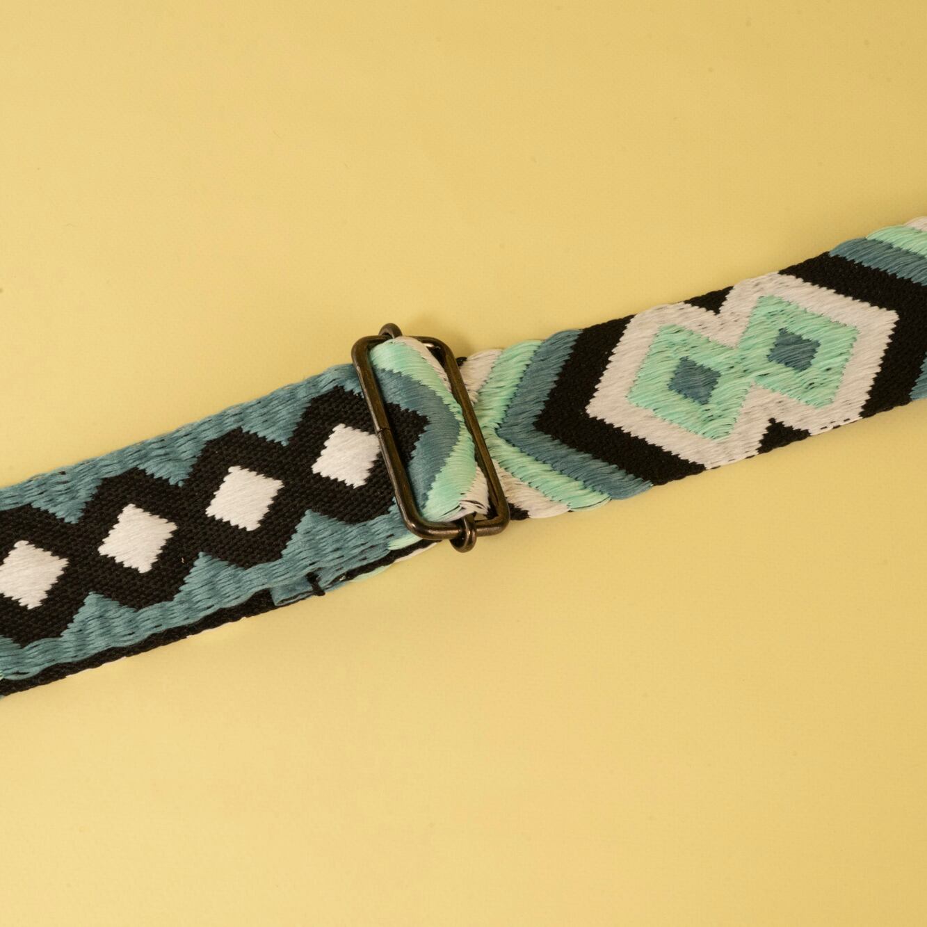 ボヘミアンな印象になり過ぎないよう、ストラップエンドはツヤ感のあるレザーを使用し、ブラック×ミント、ベージュ×水色の賑やかな配色になっています。