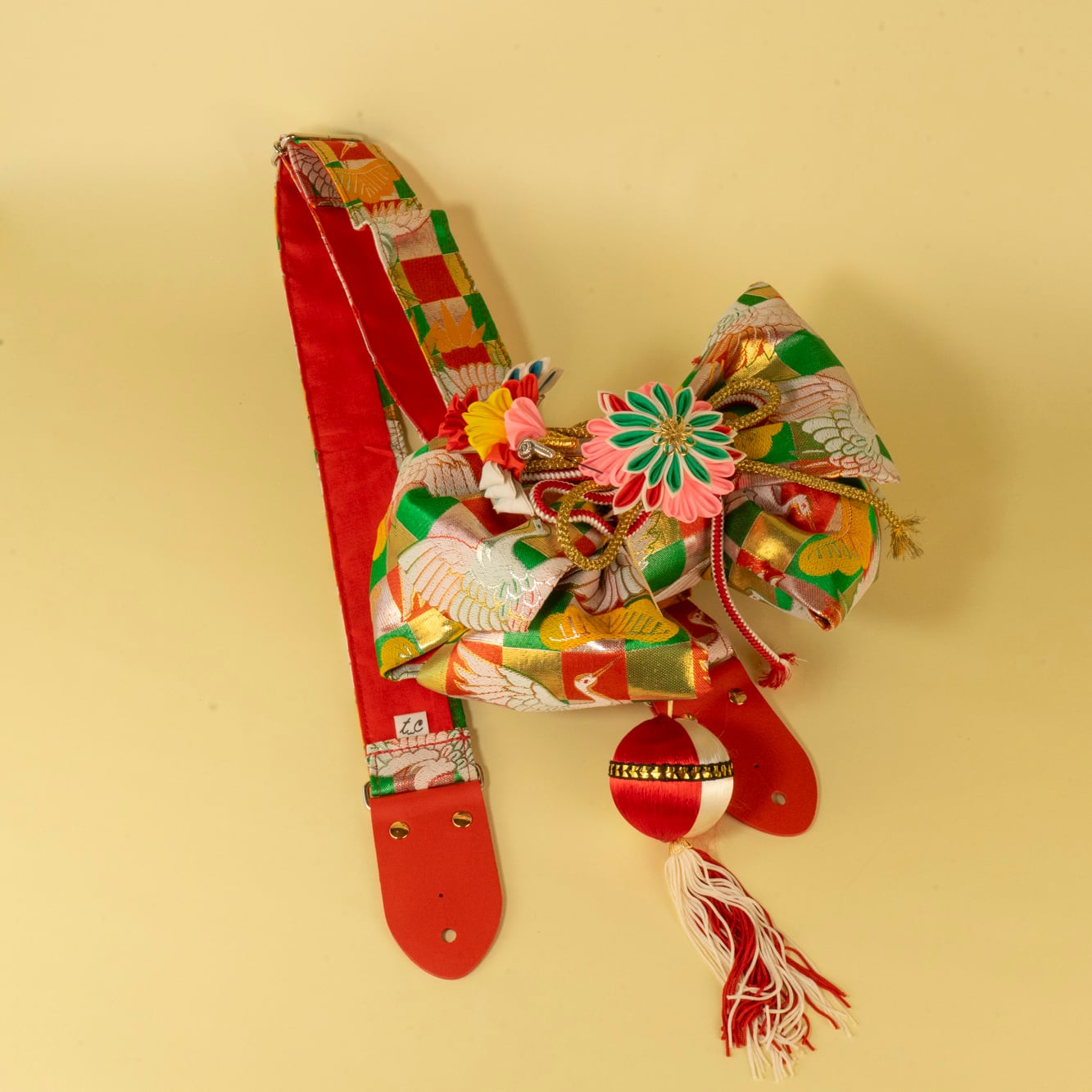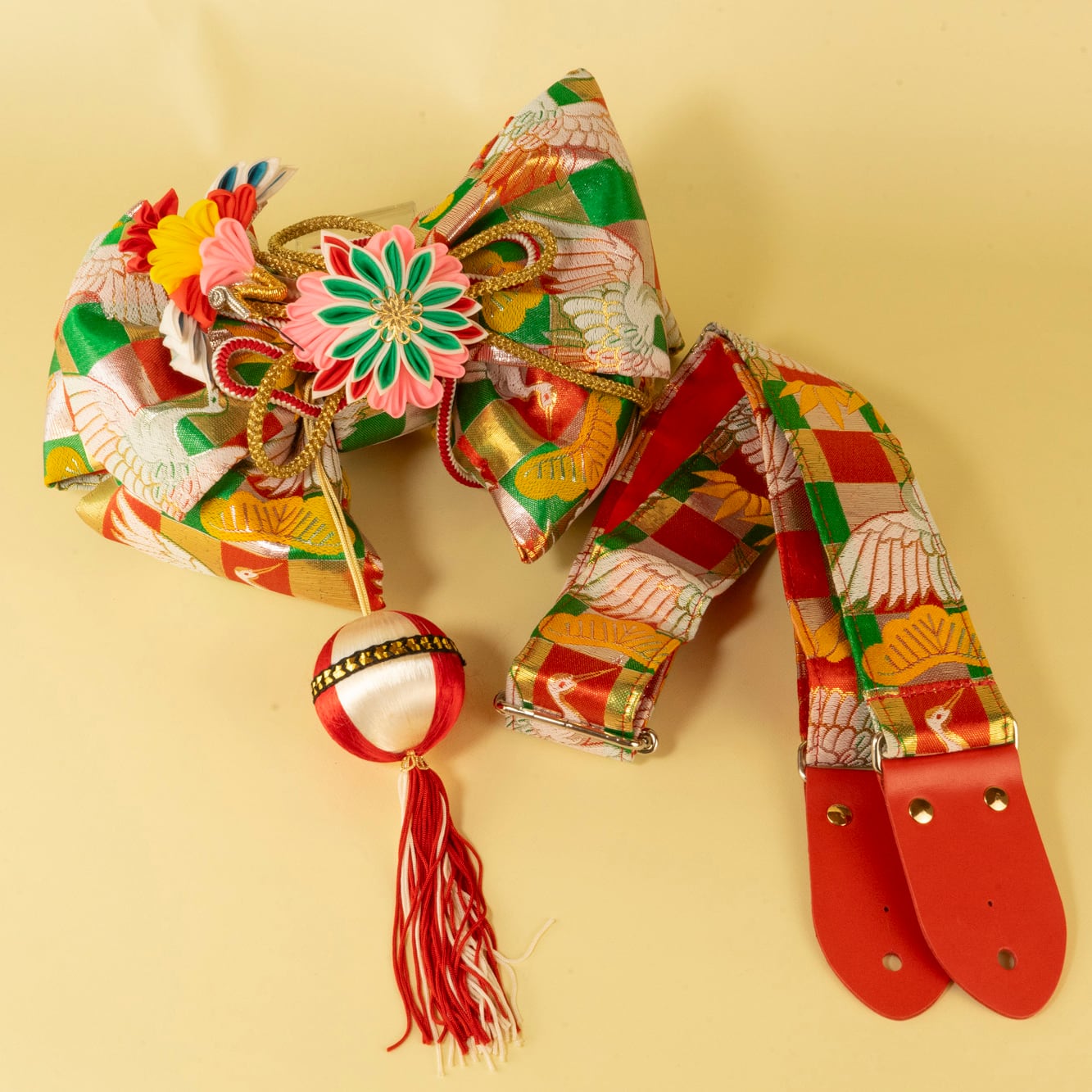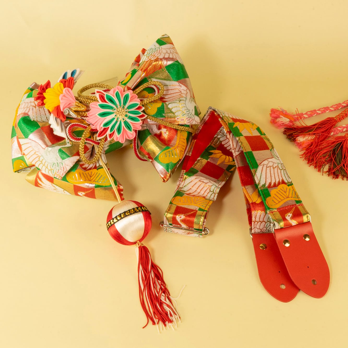 赤・緑・ゴールドの市松模様に縁起の良い鶴が舞う大胆な柄の着物帯を、赤いストラップエンドでおめでたくまとめたデザインは、同じく鶴の帯飾りがより一層華やかな印象にしてくれています。