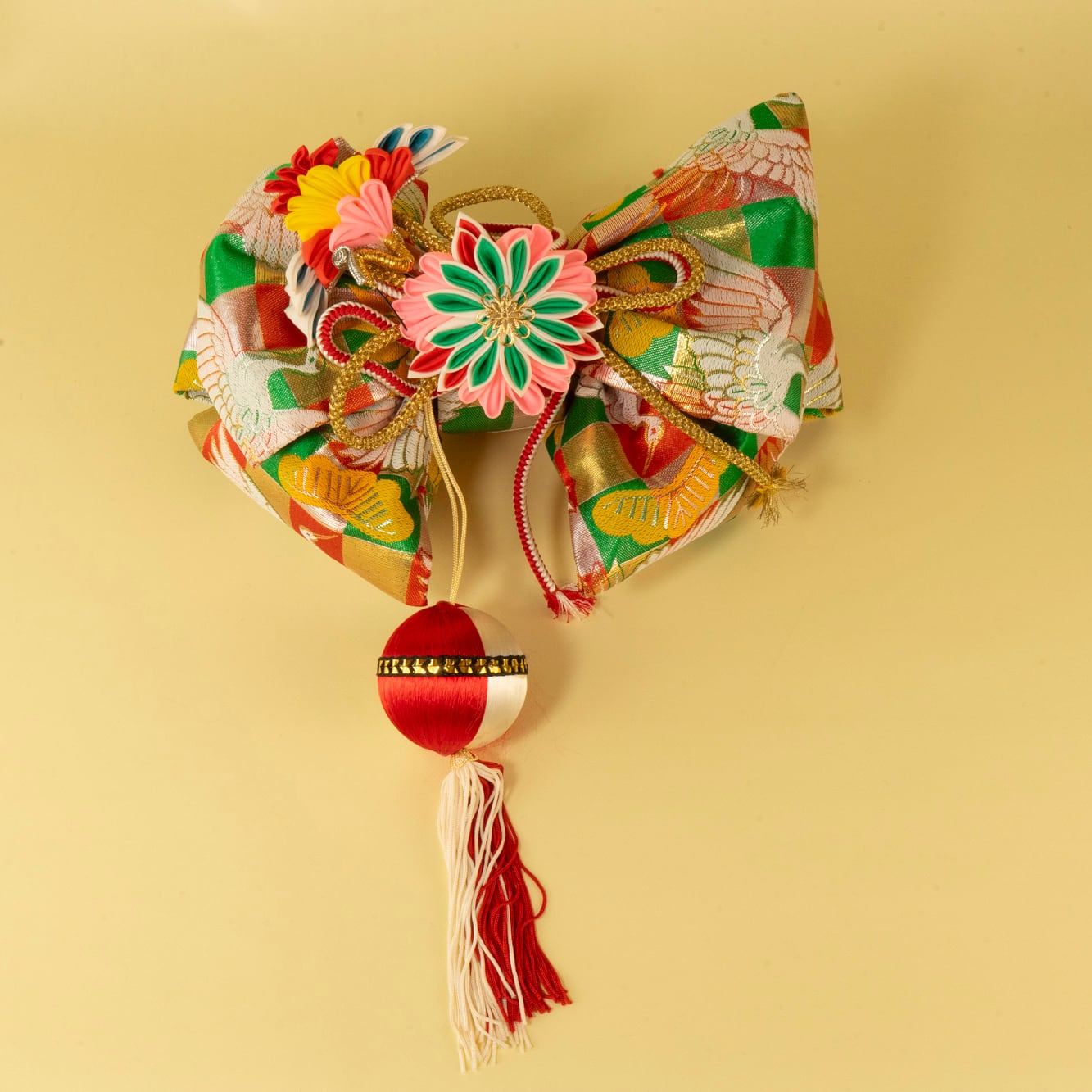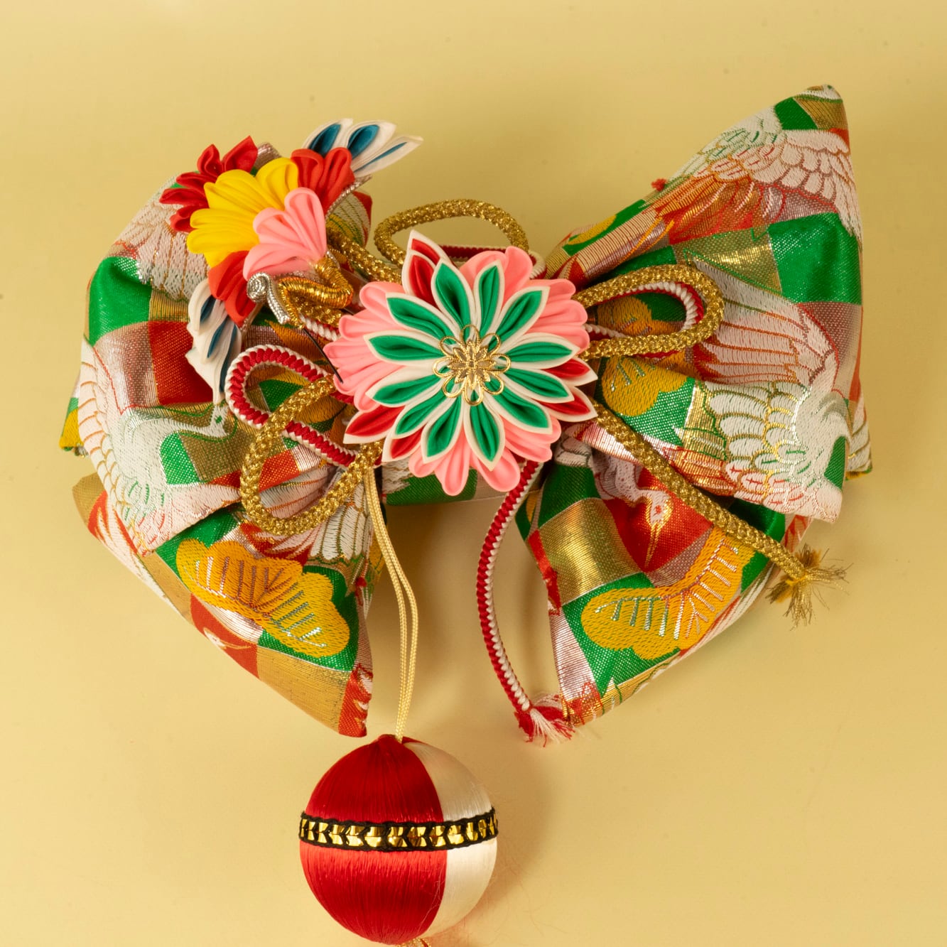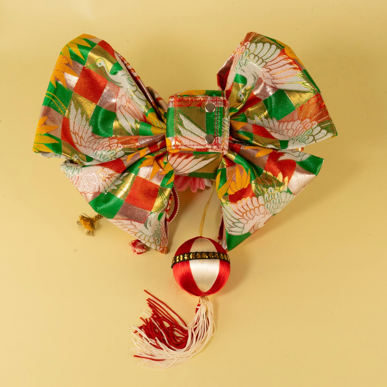 赤・緑・ゴールドの市松模様に縁起の良い鶴が舞う大胆な柄の着物帯を、赤いストラップエンドでおめでたくまとめたデザインは、同じく鶴の帯飾りがより一層華やかな印象にしてくれています。