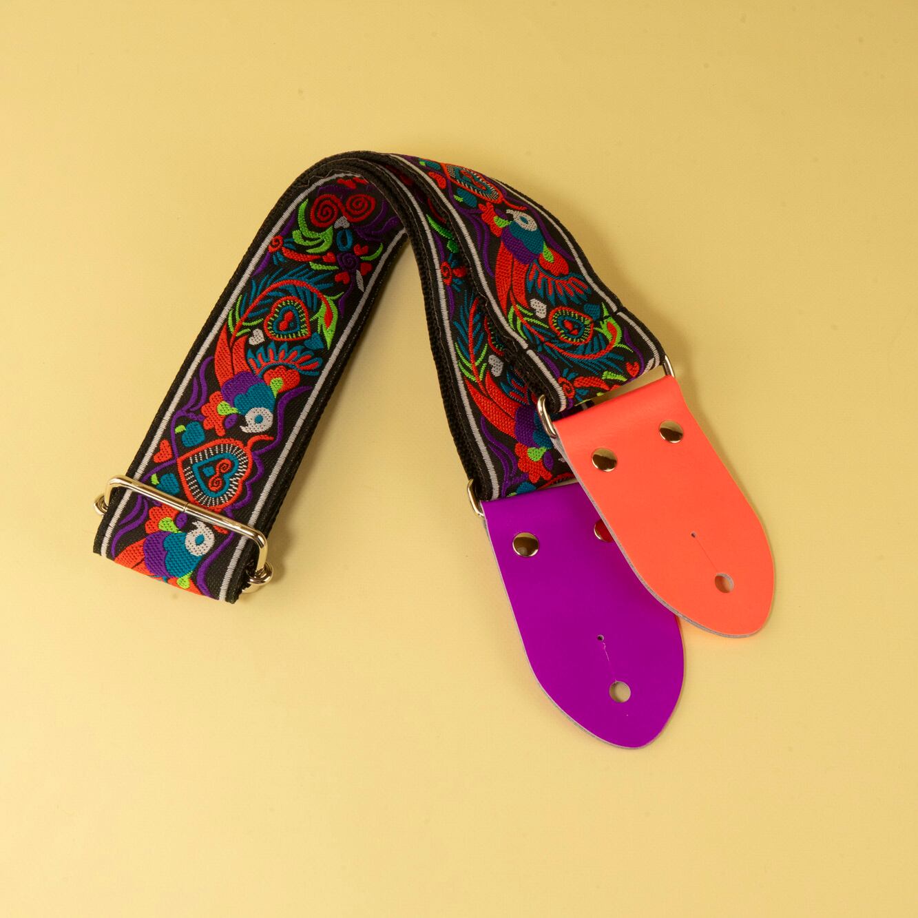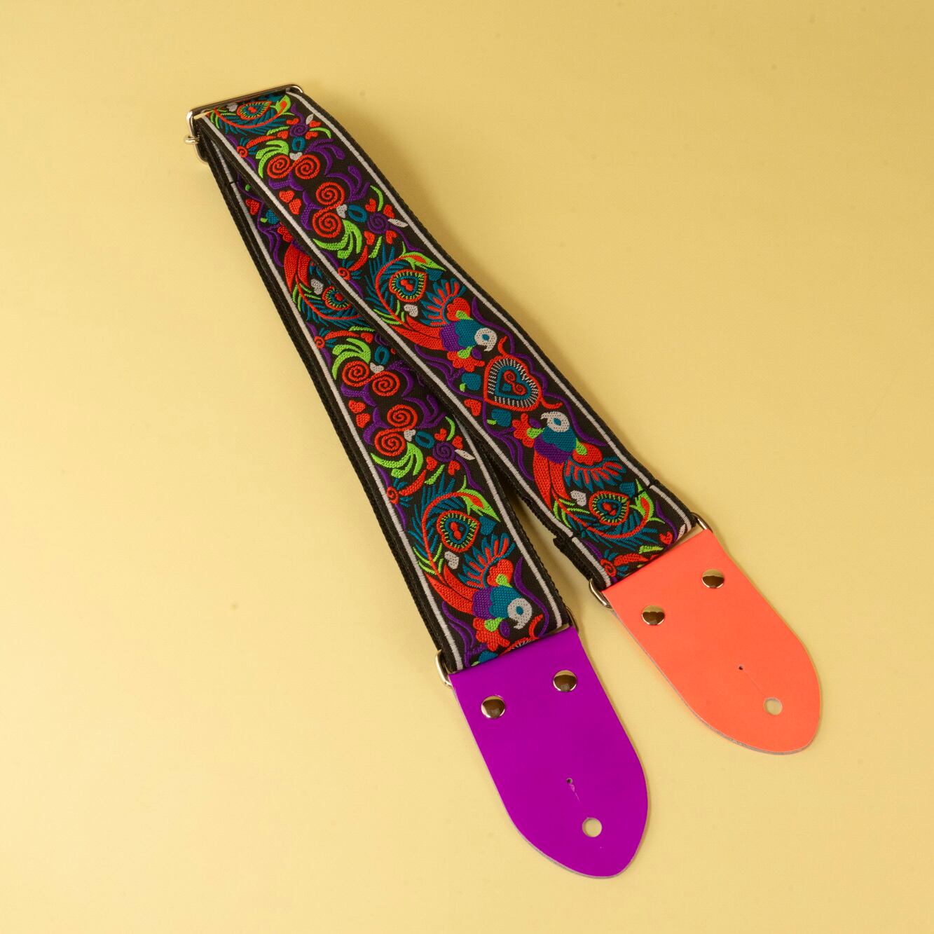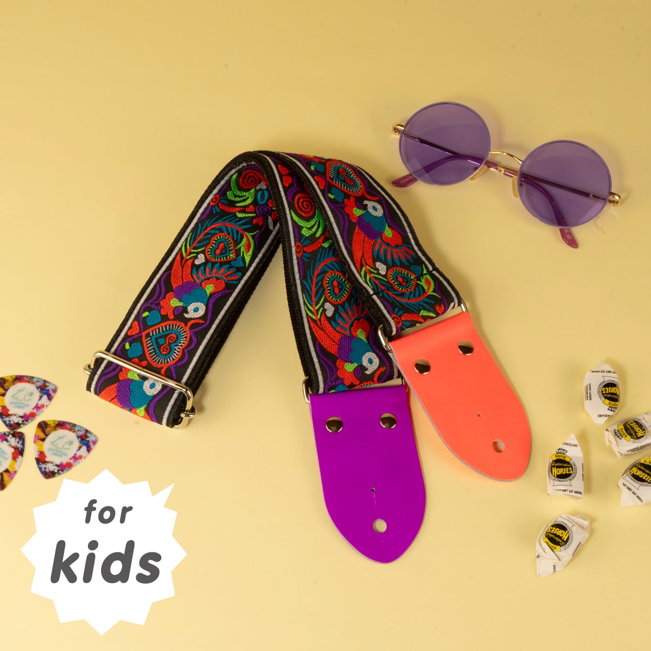 ビビッドカラーで織られたジャカードの、ラブで溢れた鳥たちの模様が愛おしい、バード柄のギターストラップは、もちろんキッズサイズもご用意しております!