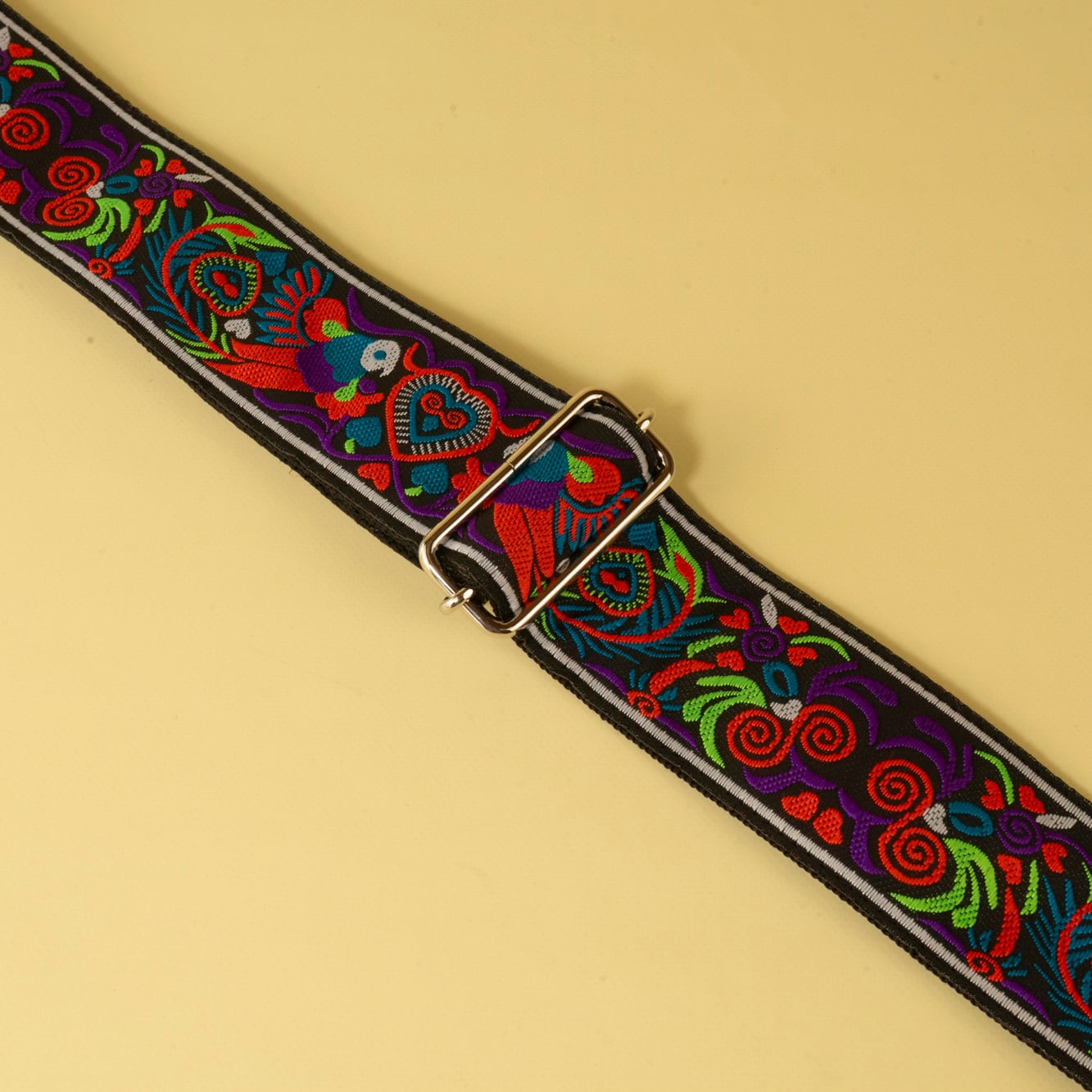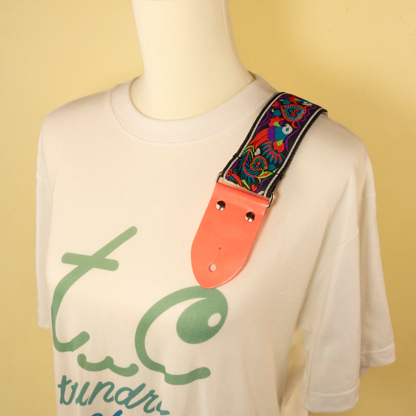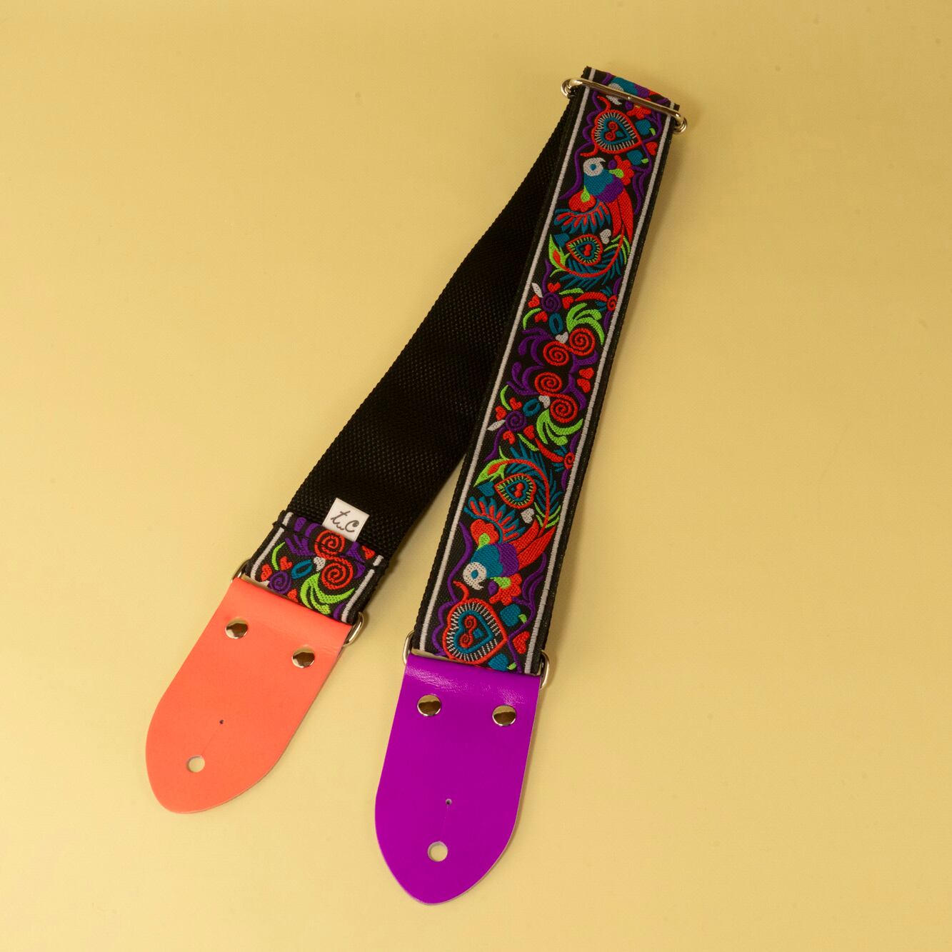 ビビッドカラーで織られたジャカードの、ラブで溢れた鳥たちの模様が愛おしい、バード柄のギターストラップは、もちろんキッズサイズもご用意しております!