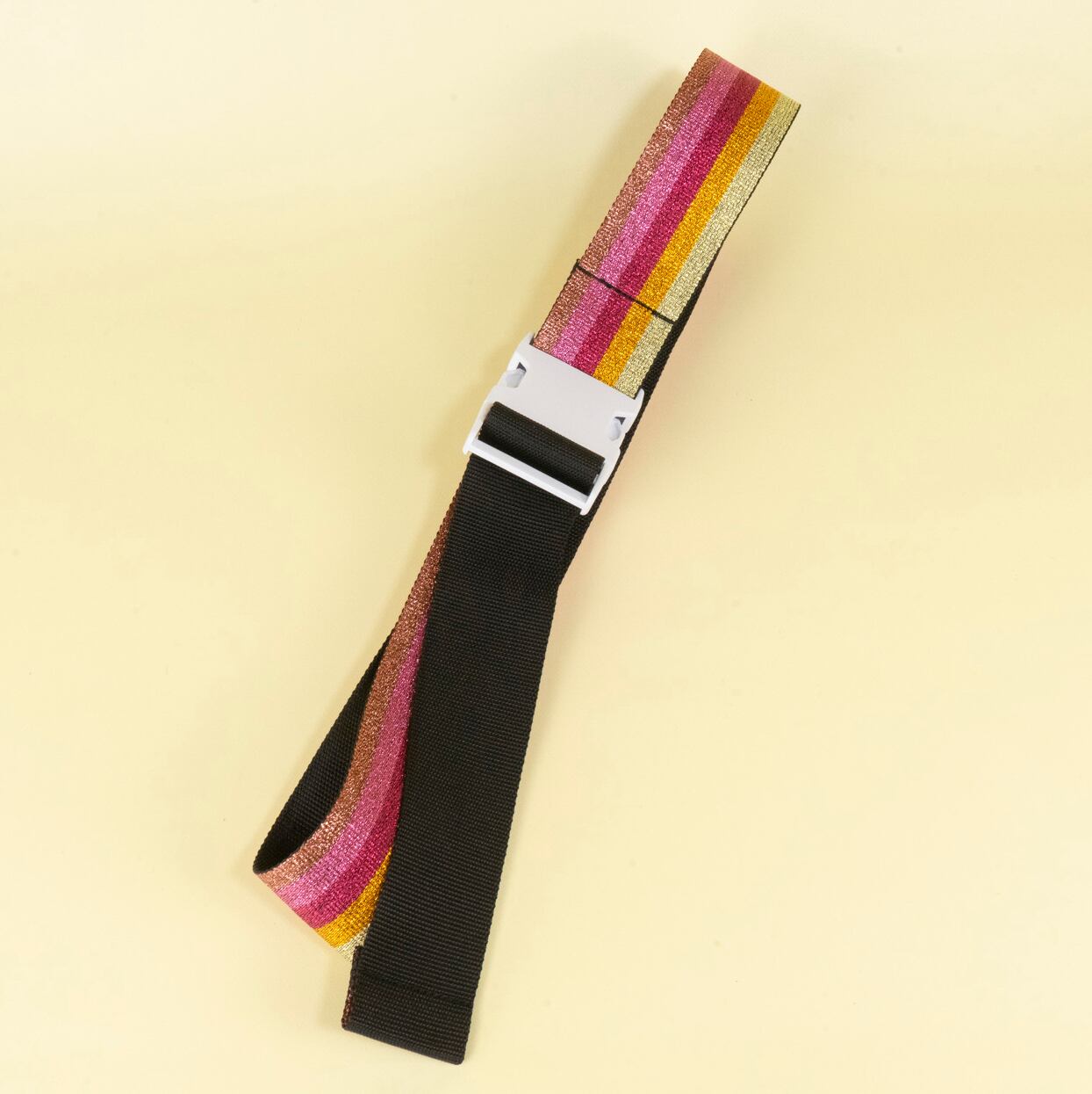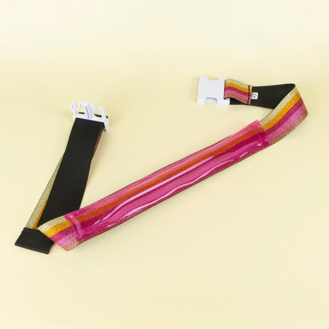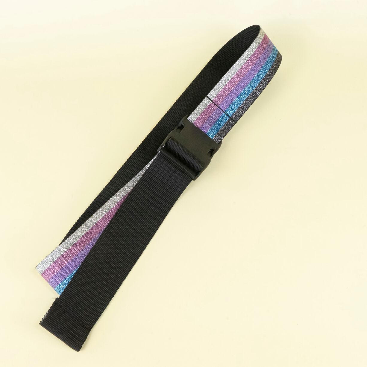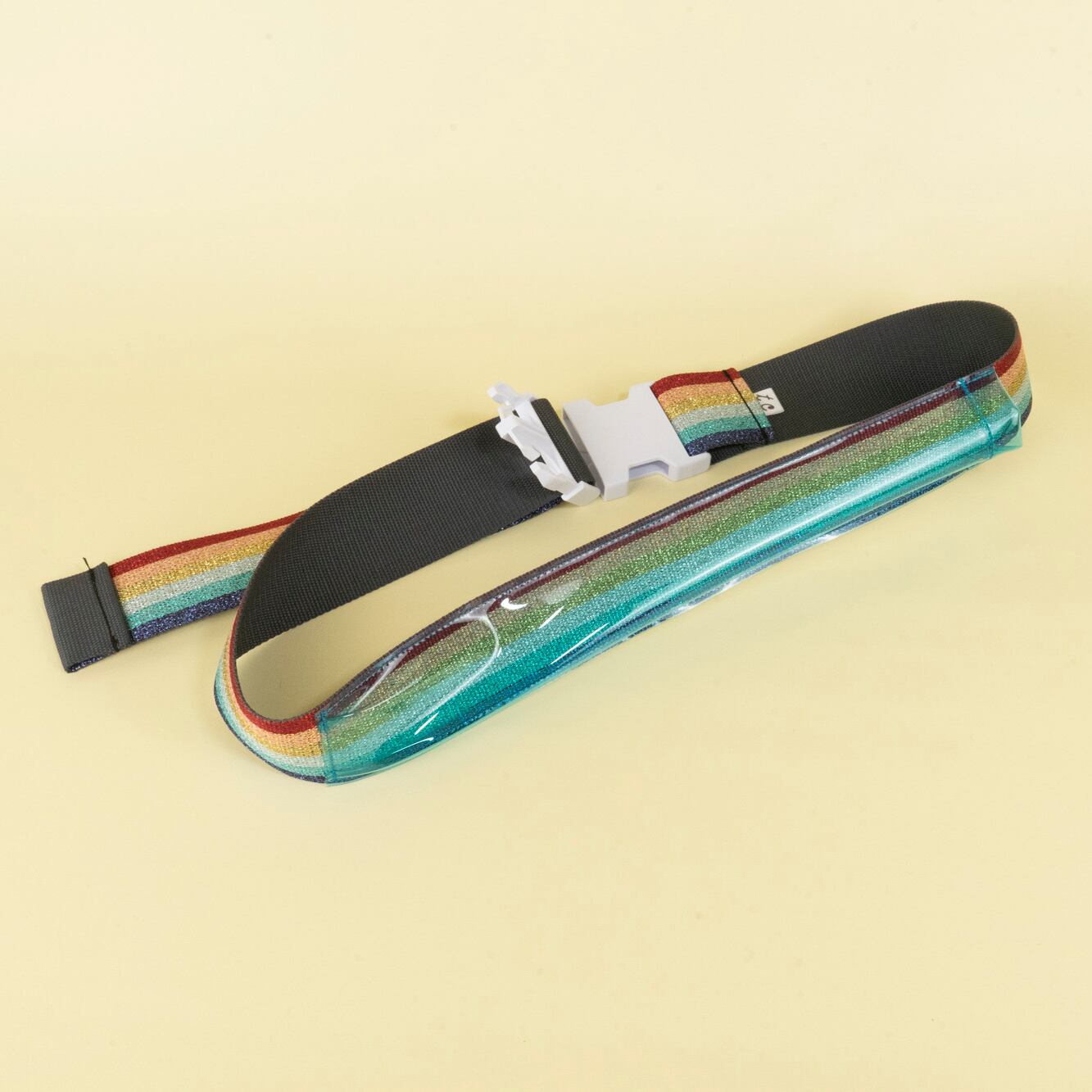 鮮やかなPVC(透明ビニール)生地のポケットとカラフルなラメレインボーのベルトはポップ度増し増しで相性抜群です。