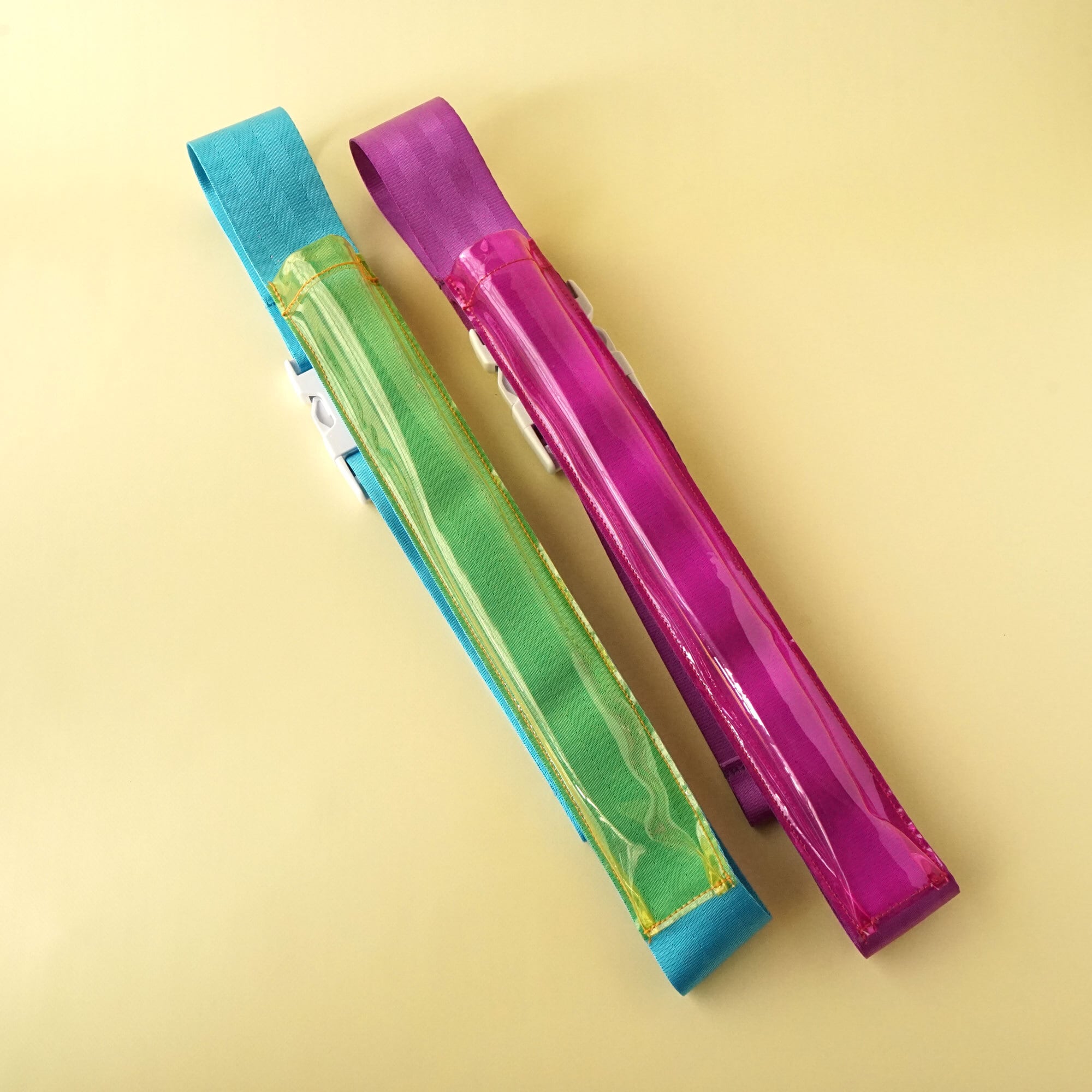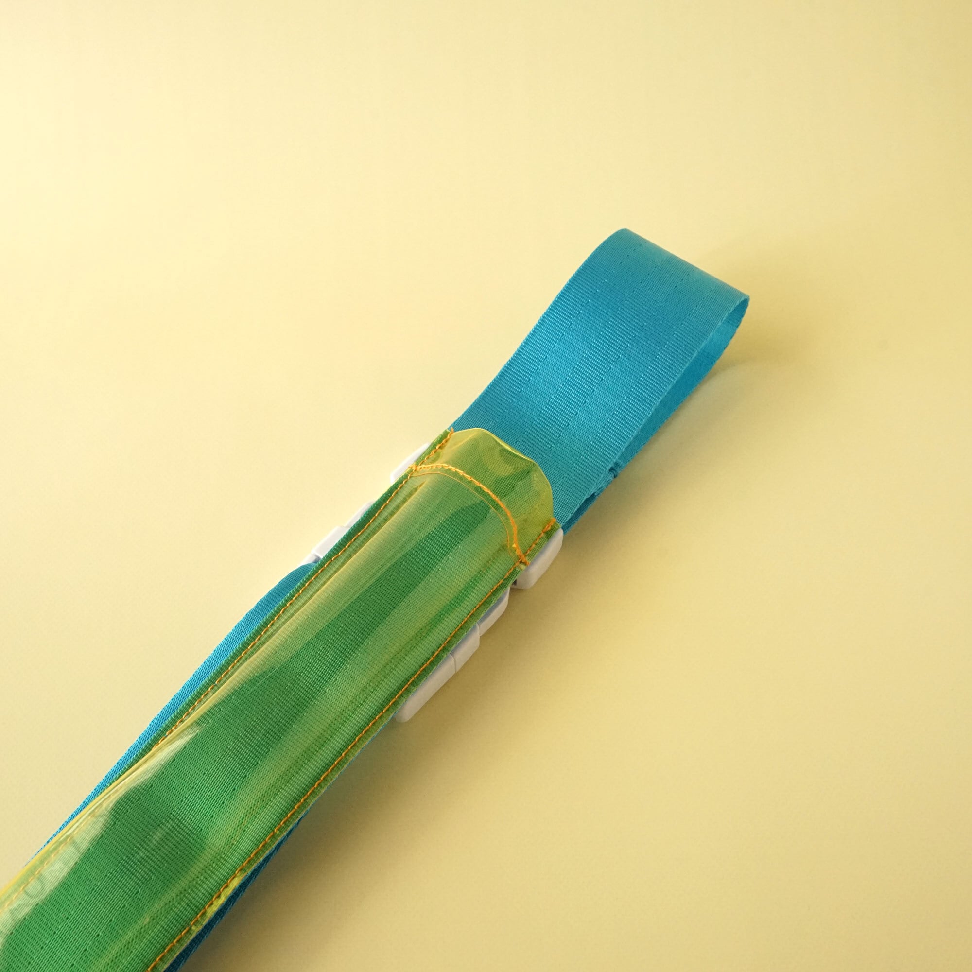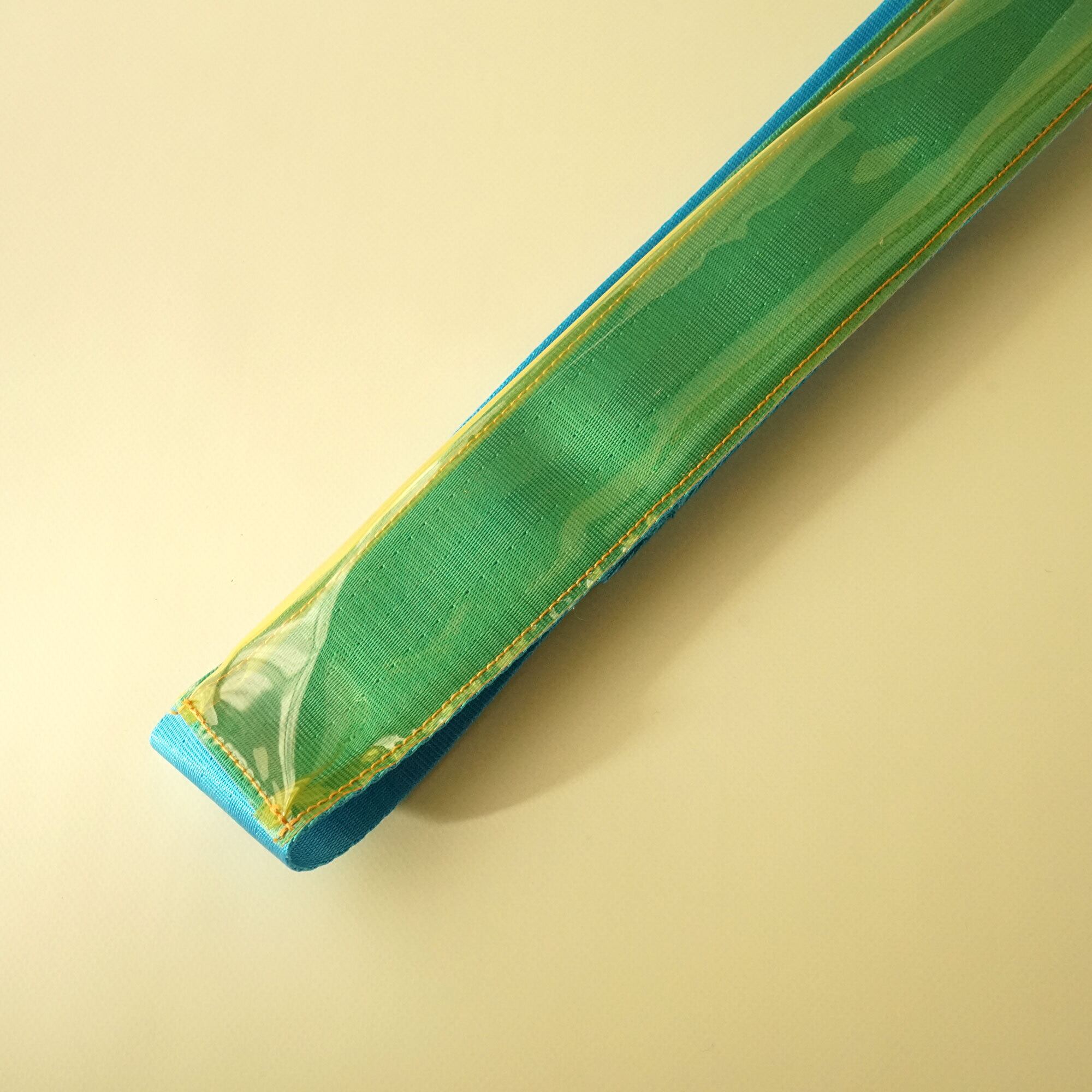 鮮やかなPVC(透明ビニール)生地のポケットとカラフルなシートベルト素材のベルトは相性抜群です。