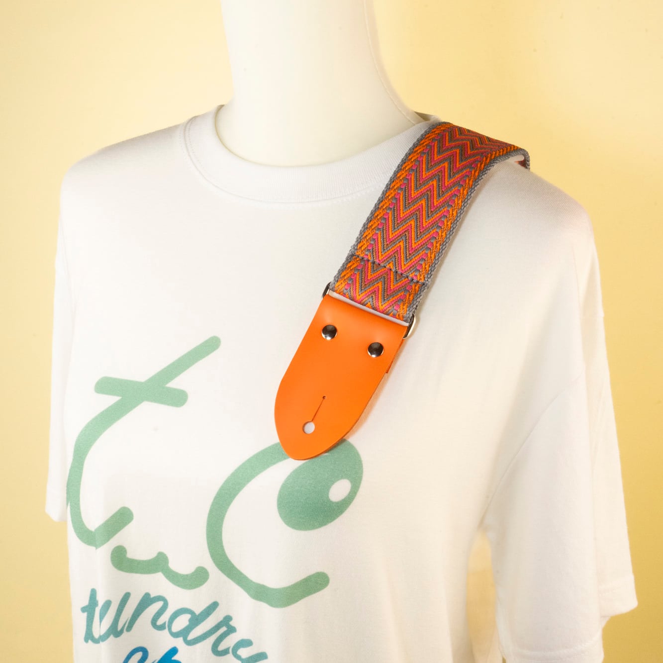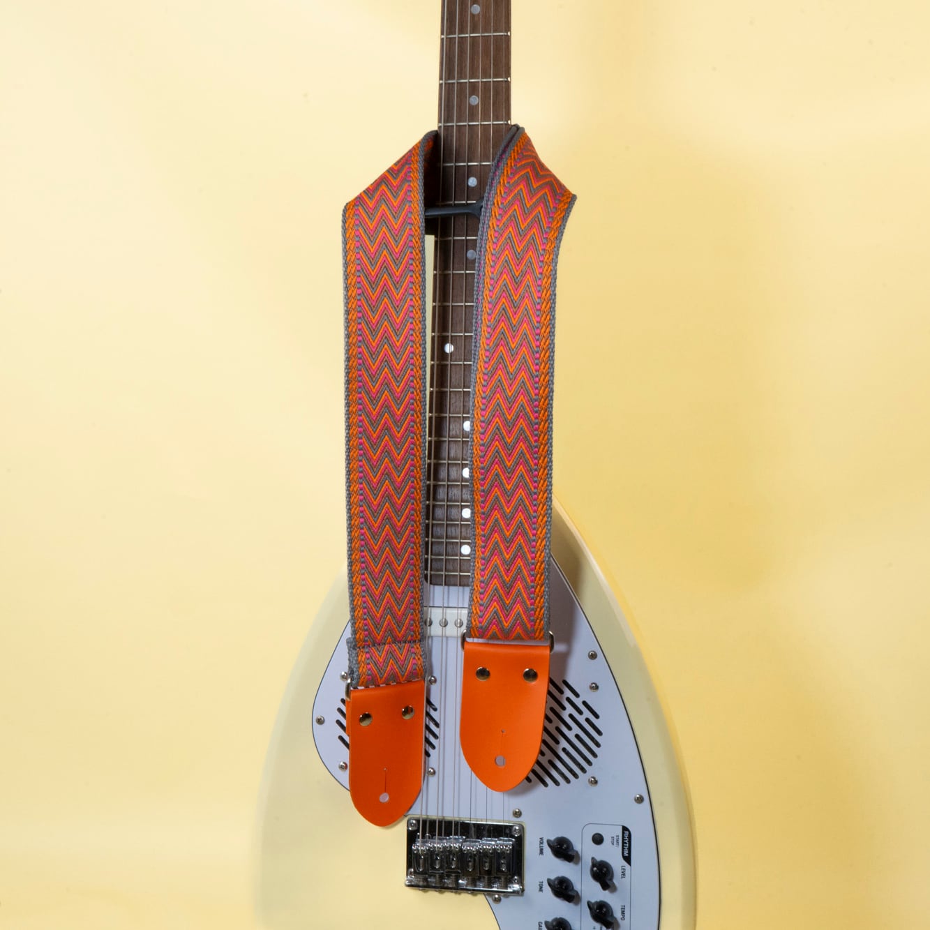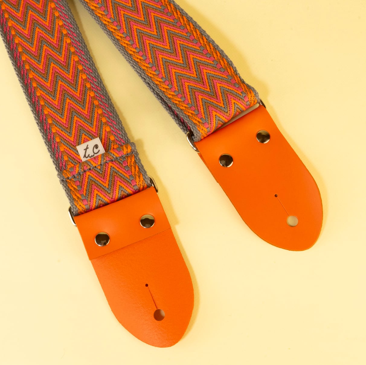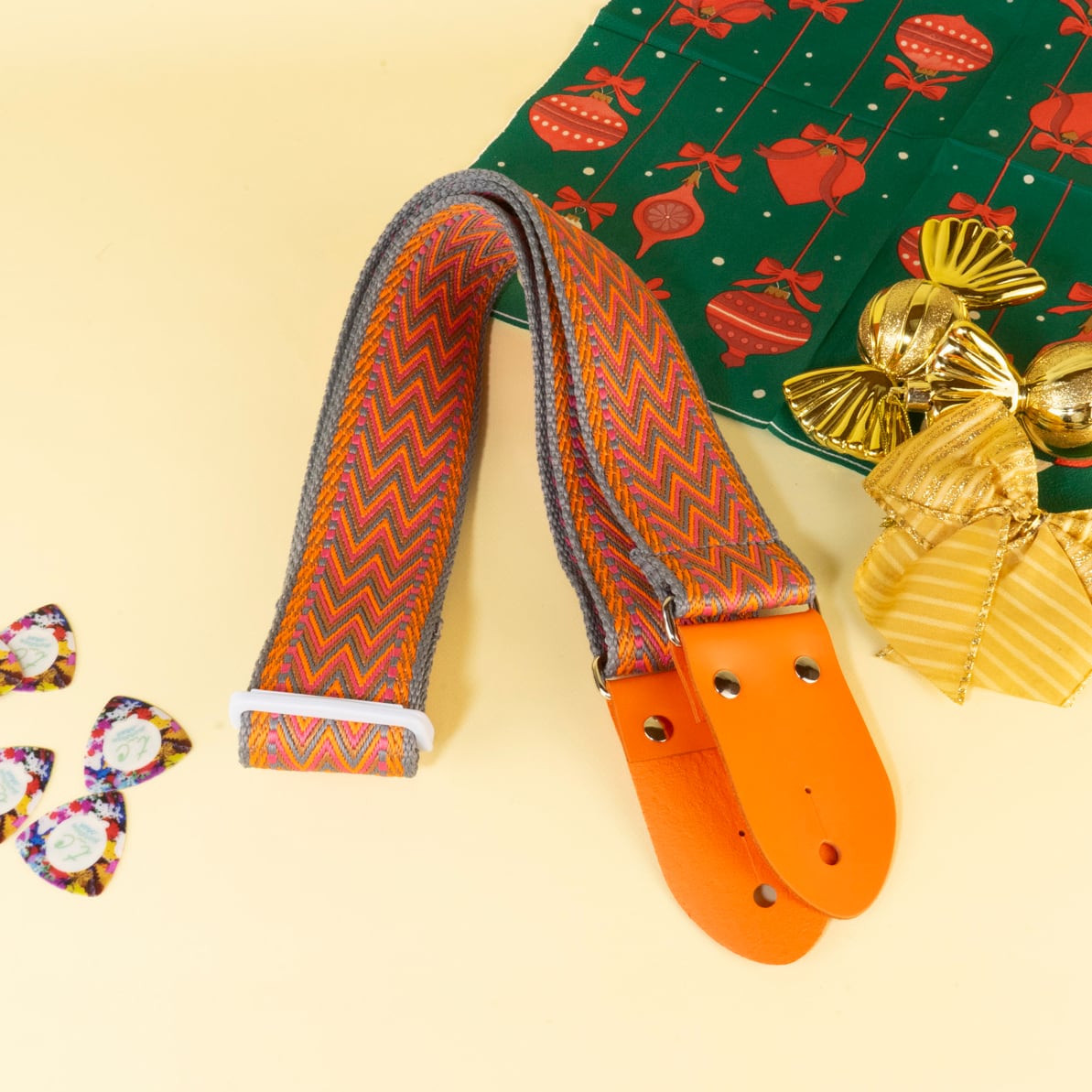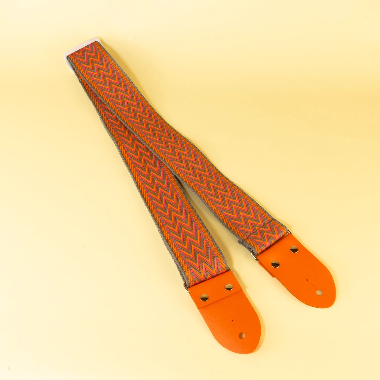 オレンジ・ピンク・グレーの賑やかなWが縦に連なるジャカードベルトに、