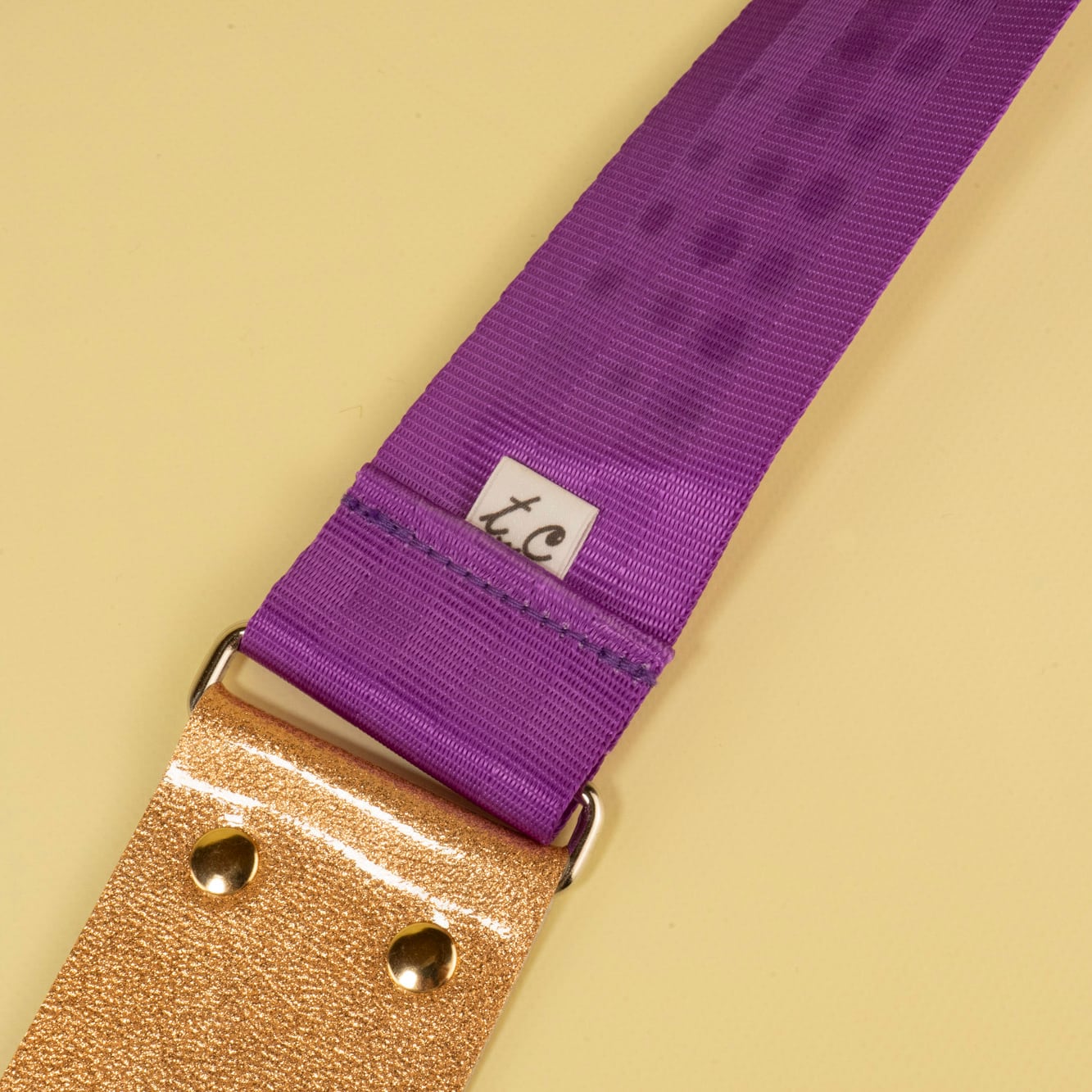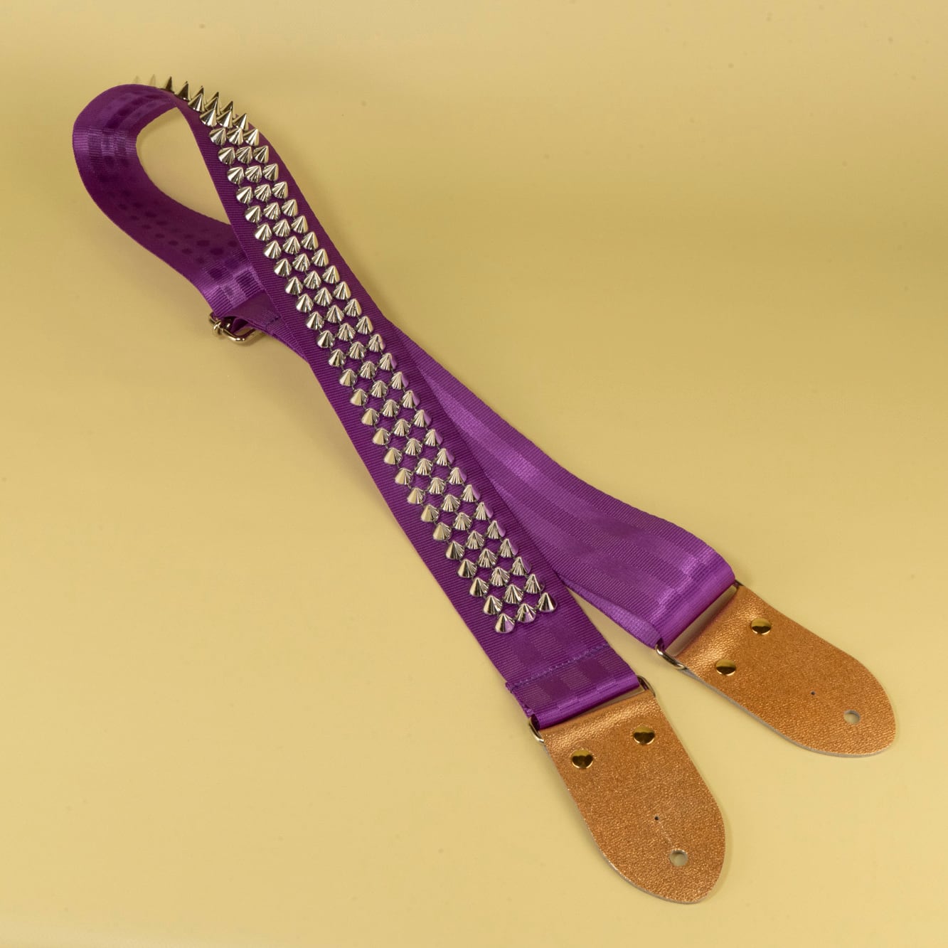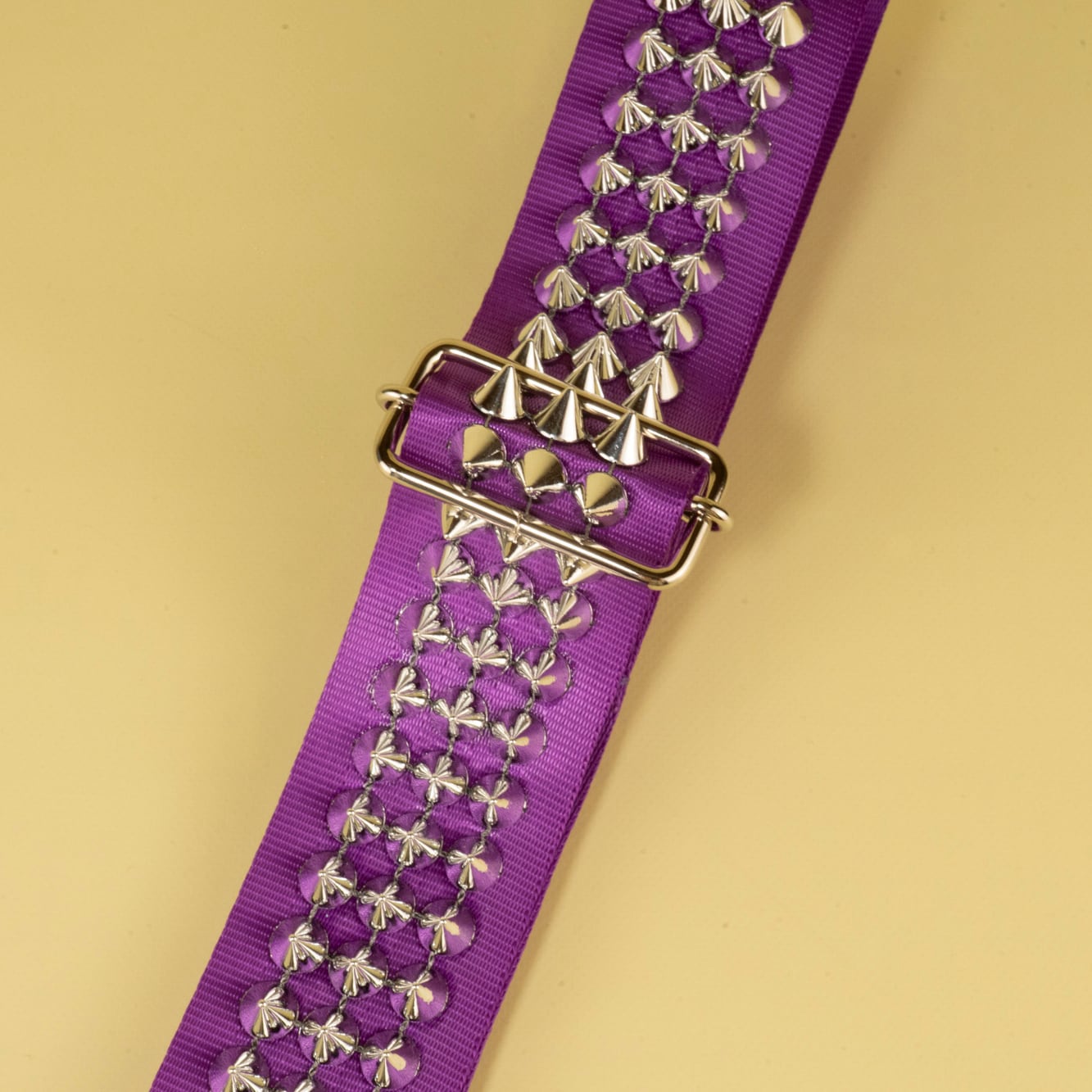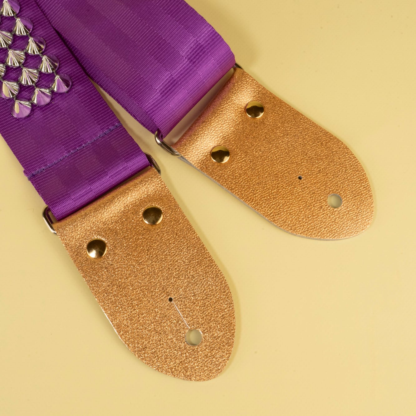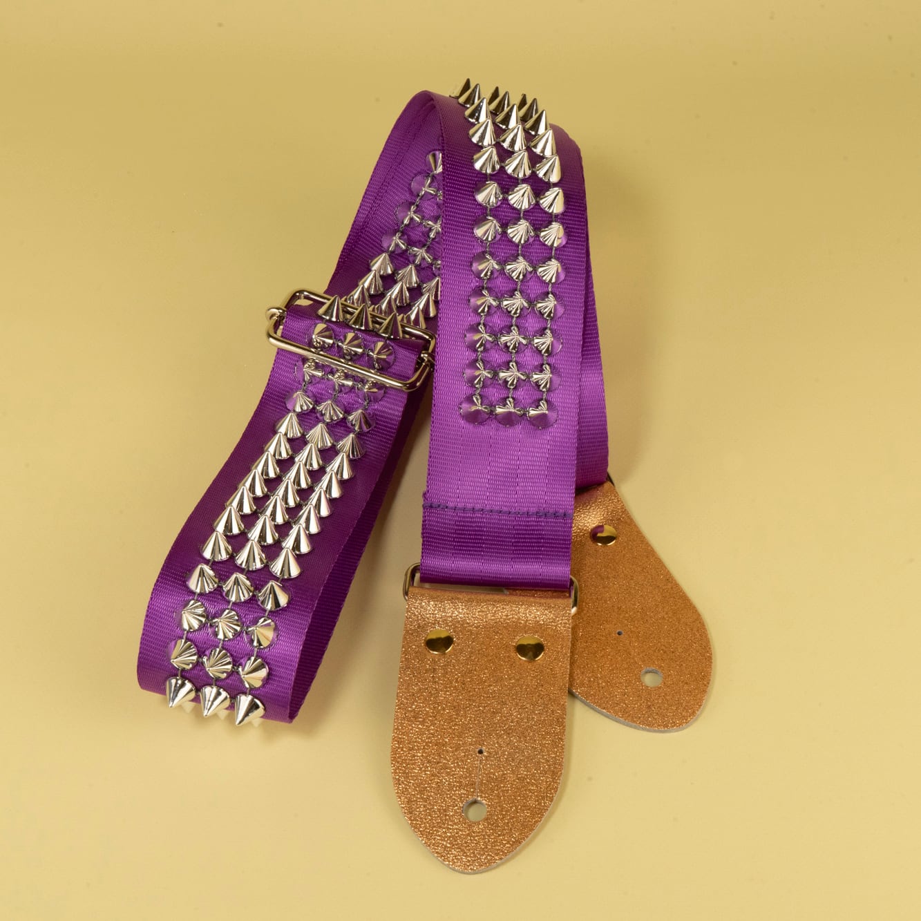 ポップカラーのしなやかなシートベルト素材に、たっぷりのラメが散りばめられたグリッターエナメルのストラップエンド、ギラギラに光り輝くシルバースタッズのカッコかわいいギターストラップに仕上がっています。