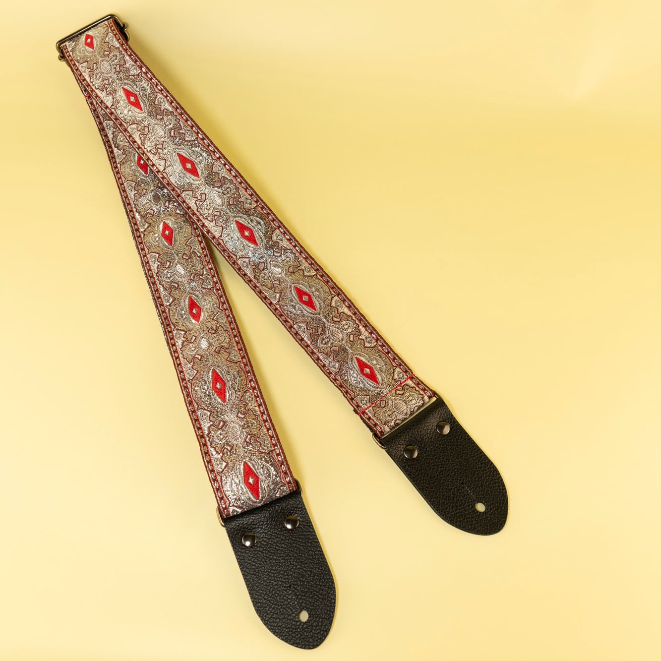 ゲームやアニメの勇者が纏う盾や鎧をイメージしたシルバー基調のモチーフに、力強い硬めの黒革と黒パーツでまとめたギターストラップは、