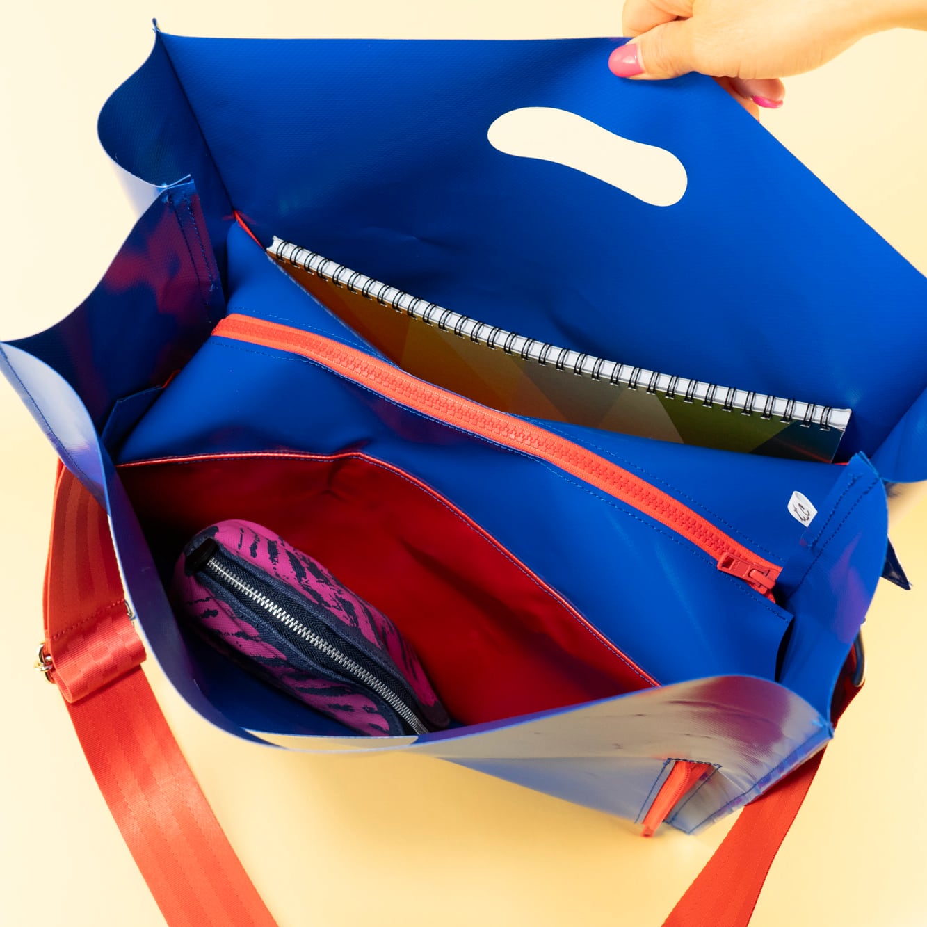 目が覚めるような鮮やかな生地は、サーカス小屋にも使われているターポリン素材。丈夫なだけでなく防水・防炎と高機能・高性能です。
