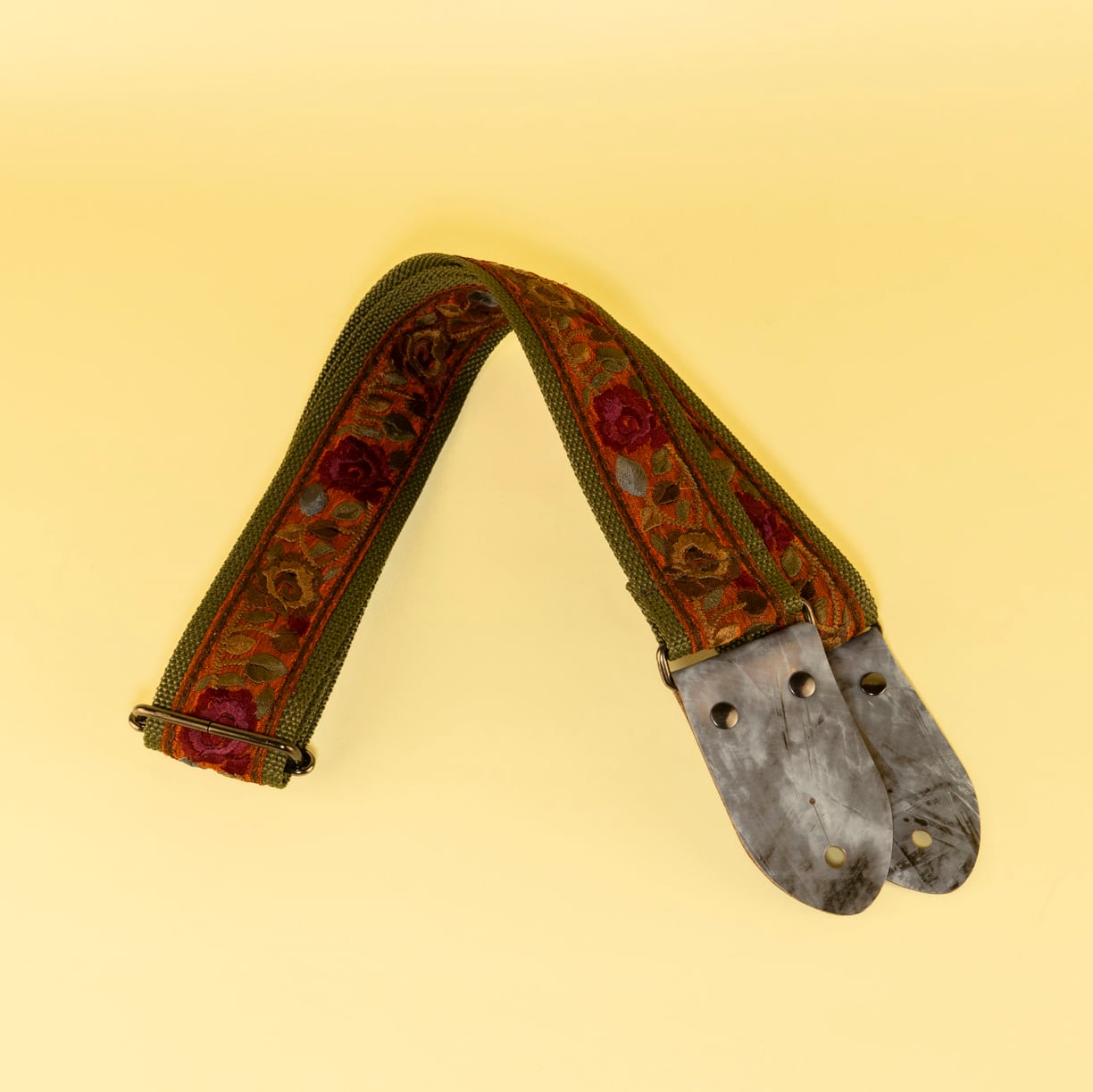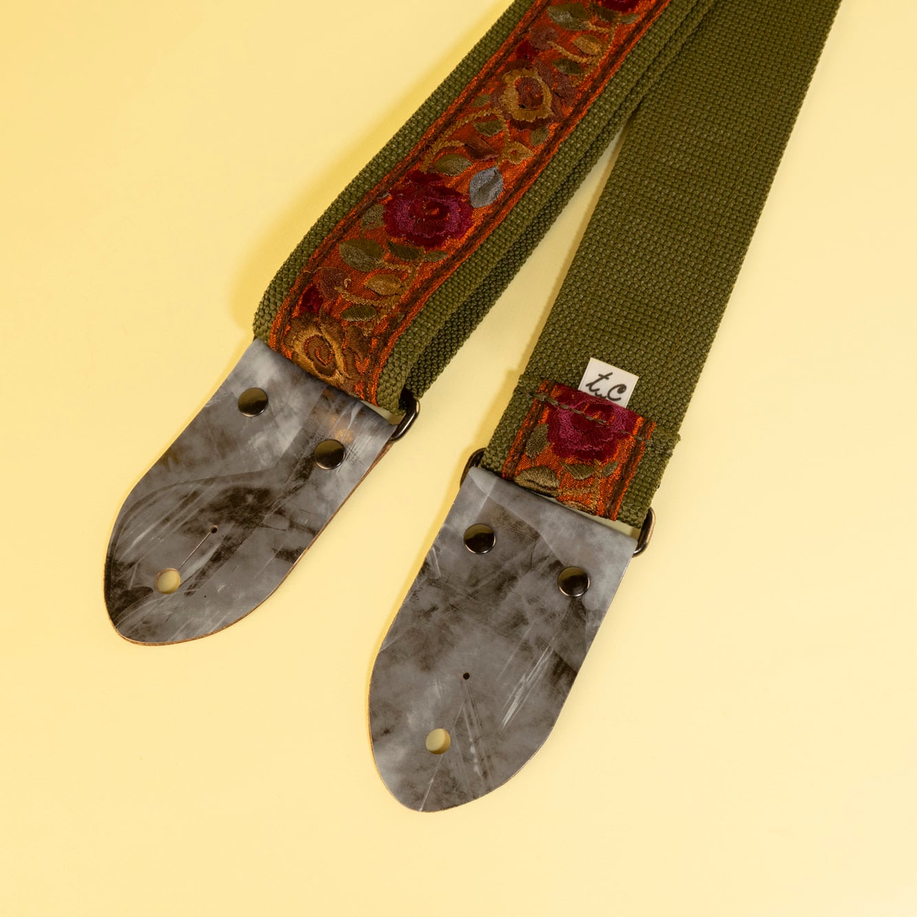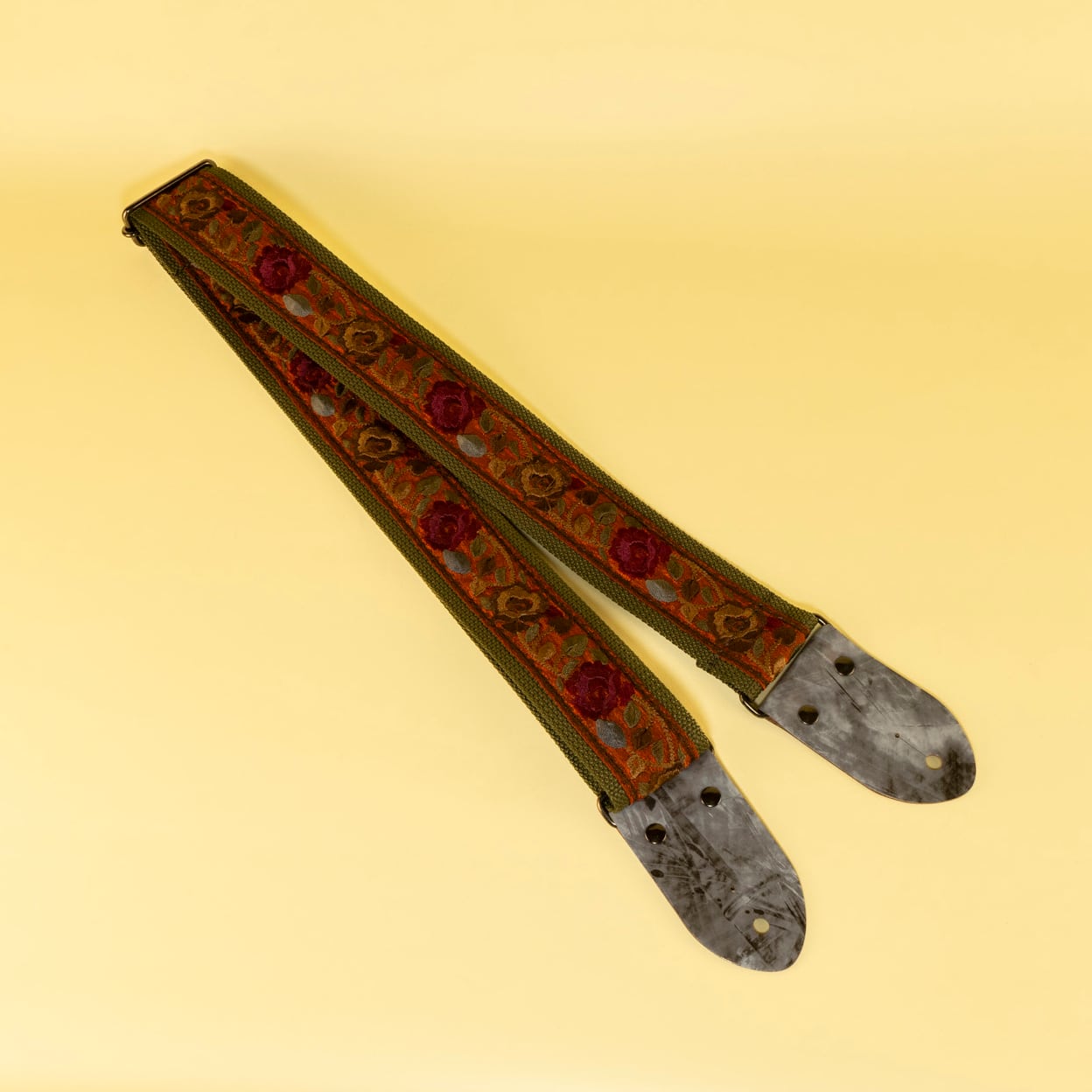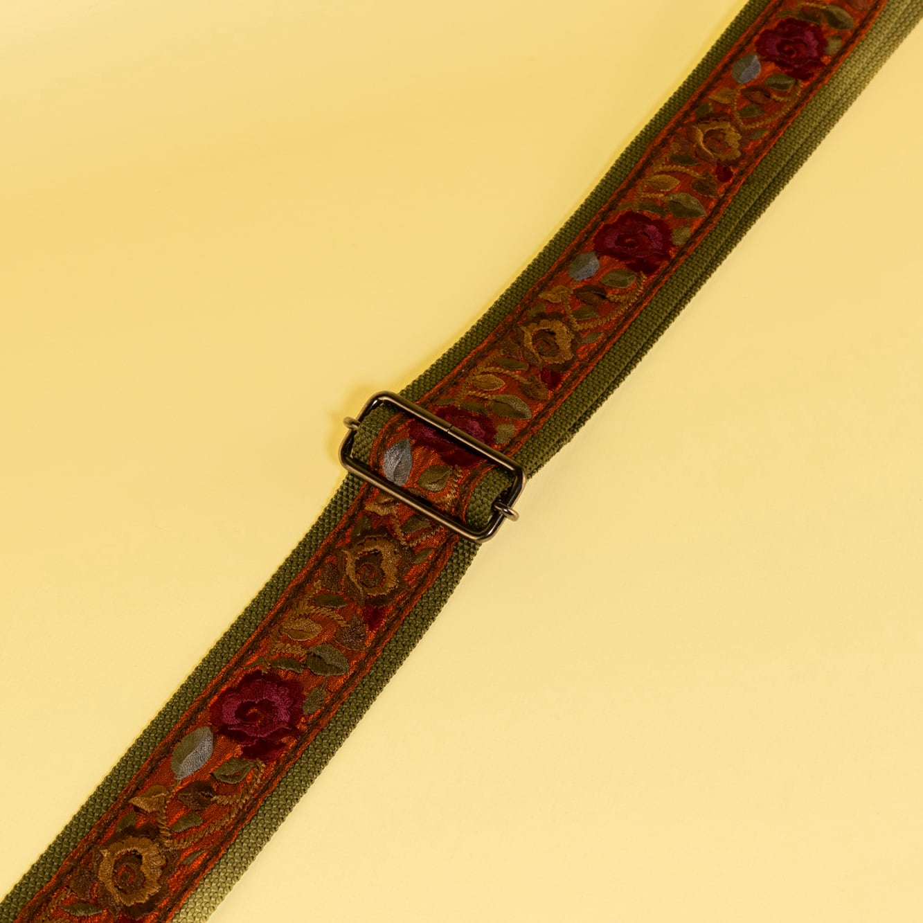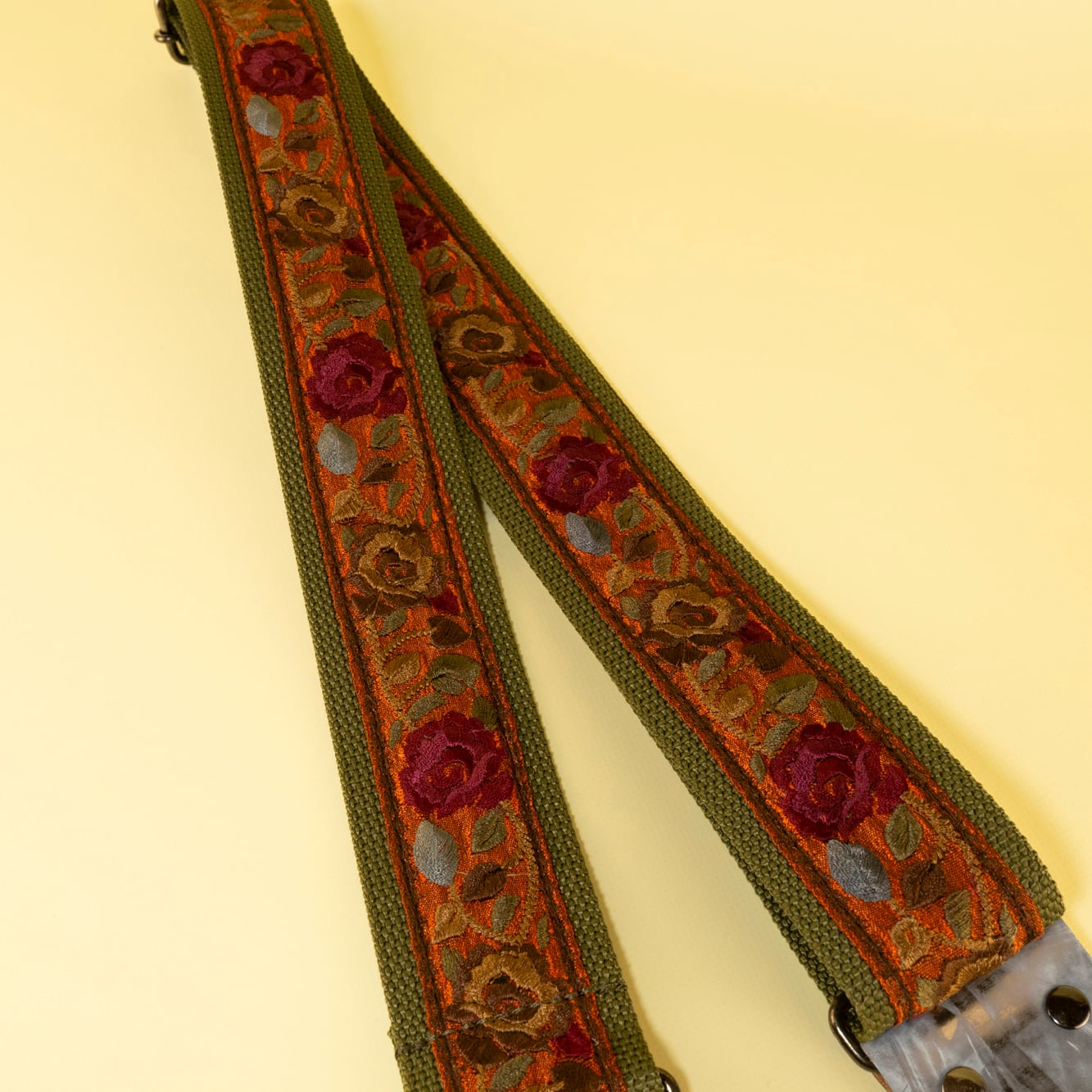 美しいチョコレート色を基調にした華やかなローズの刺繍リボンを、環境に優しく安定性も抜群のカーキ色のポリプロピレンバンドに施しました。