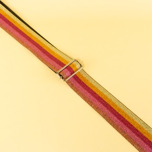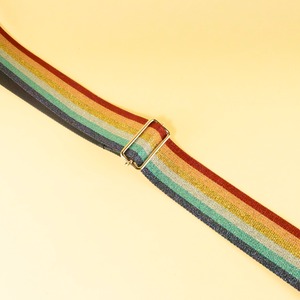 虹色は6色、パープルとピンクは5色のラメラインが輝く外国製のPP(ポリプロピレン)ベルトで、従来のレインボー柄のように子どもっぽくなり過ぎず、クール系にもモード系にもかわいい系にもハマるデザインです。