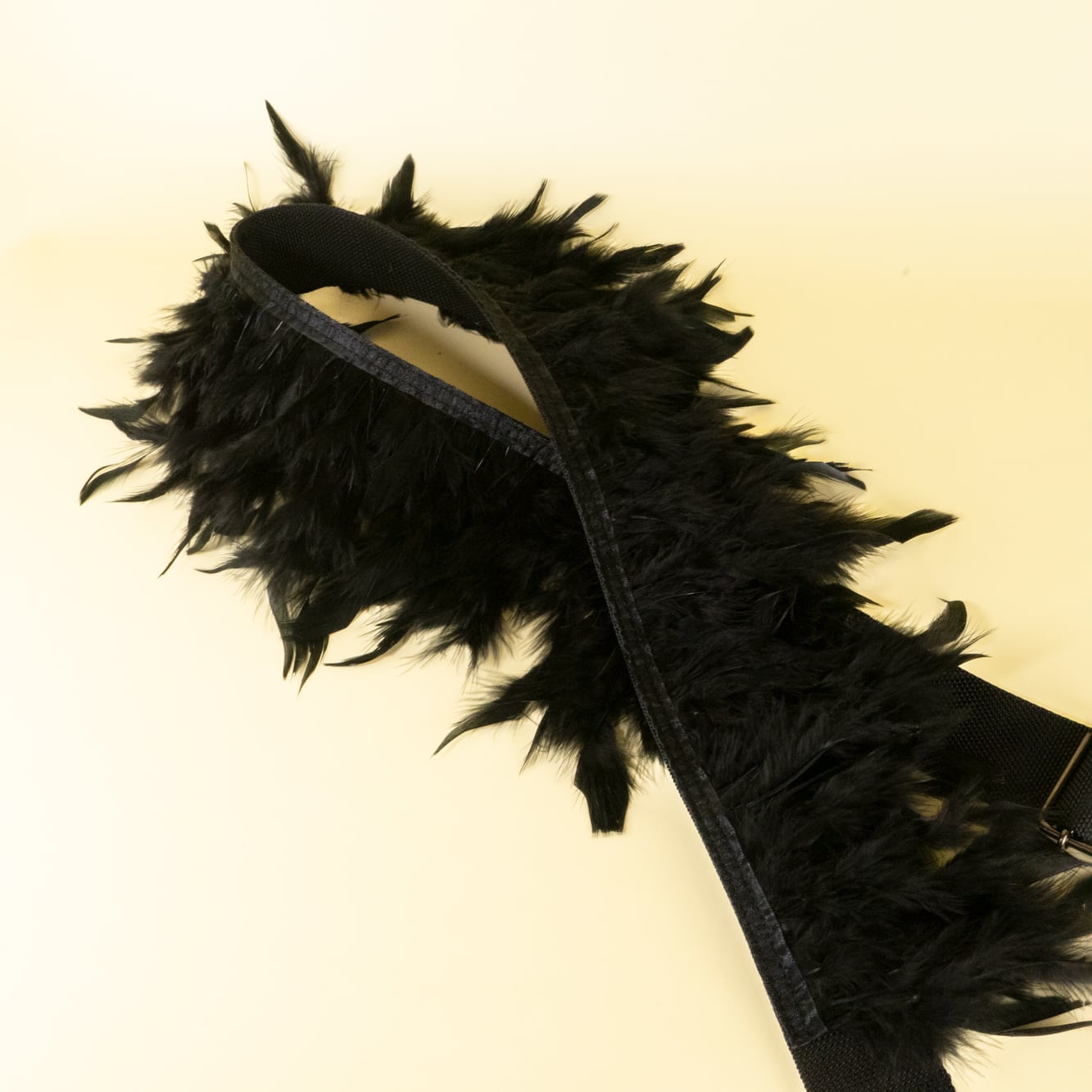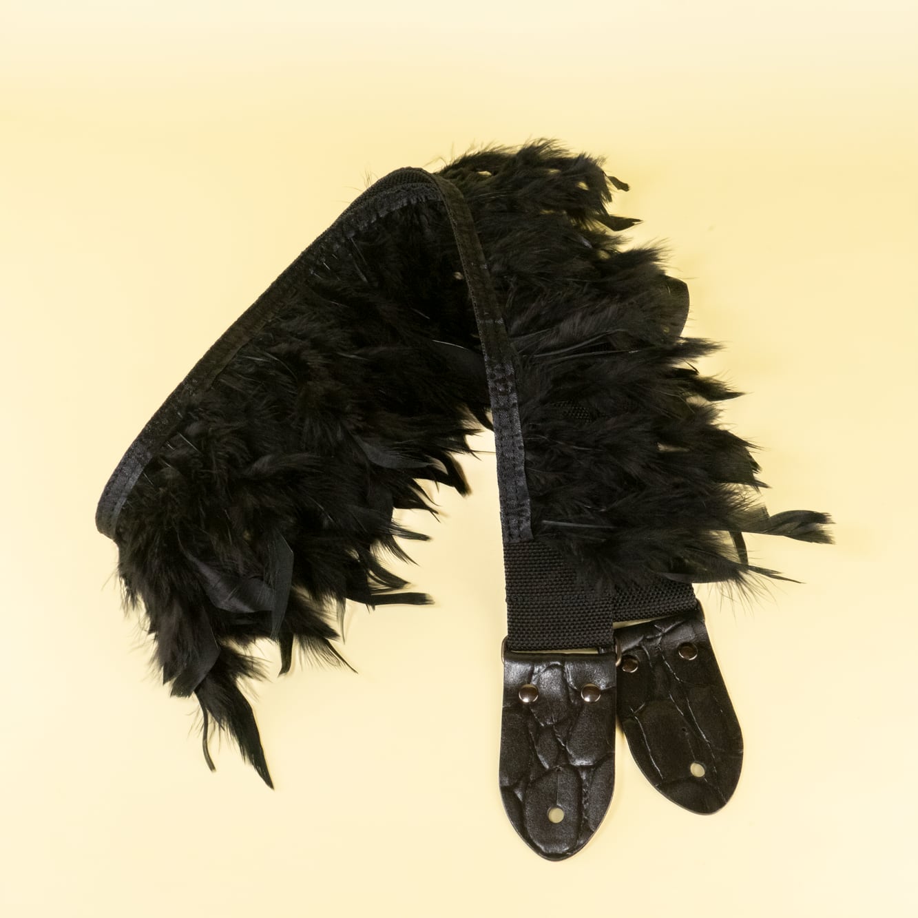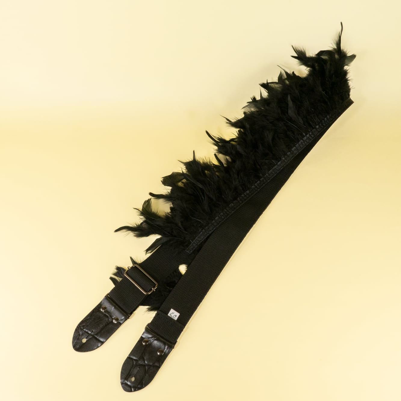 ボリューミーなフェザーの圧倒的な存在感が魅力の「フェザーギターストラップ」。記念すべき第一弾は、深く艶やかな「漆黒の堕天使ブラック」で登場です!