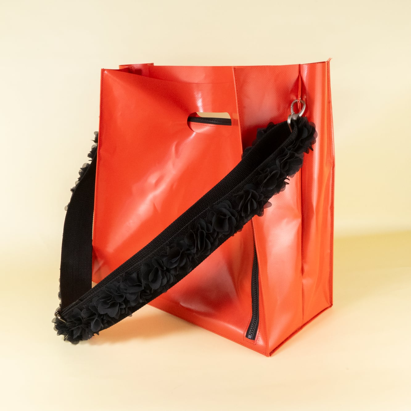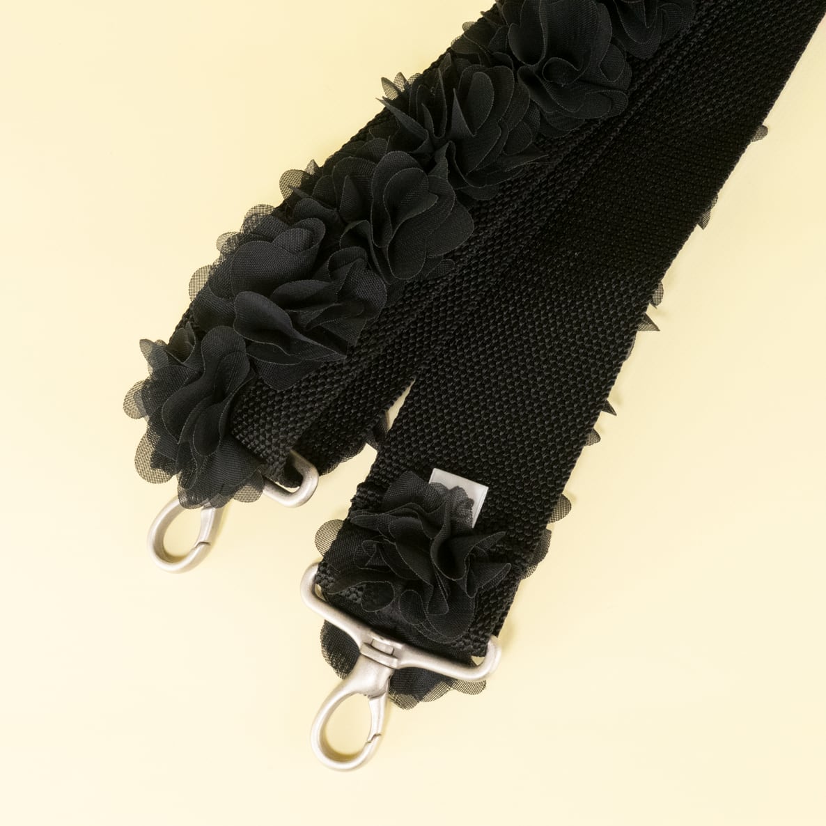 The base features eco-friendly polypropylene webbing for exceptional stability, adorned with a bold scattering of jet-black chiffon flowers. The soft fabric sways gently with your movement, creating a piece that boosts your motivation the moment you pick it up.