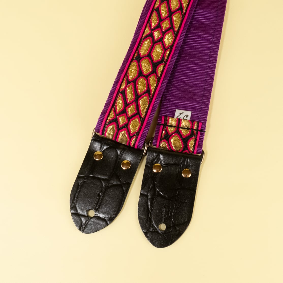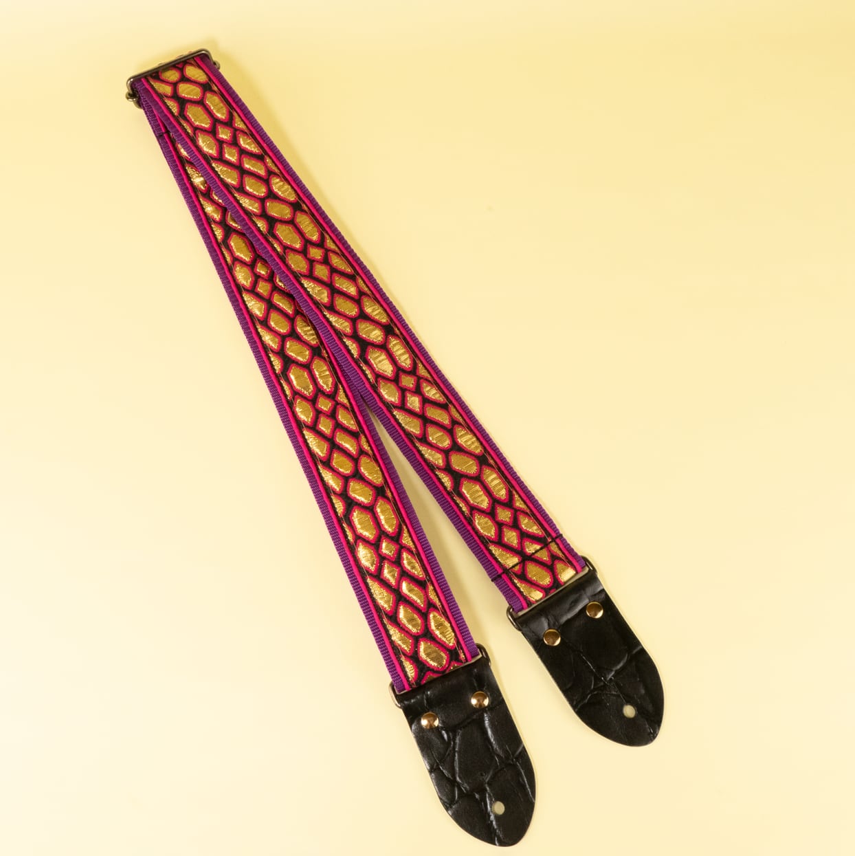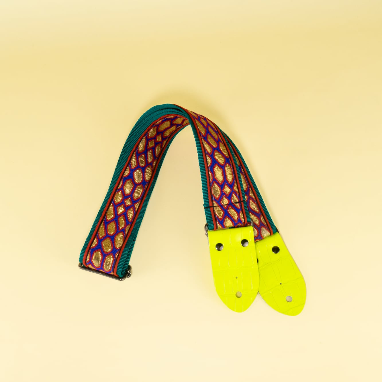 Introducing the "Dragon Scale Guitar Strap," featuring a mysterious and energetic pattern that shimmers like golden dragon scales! This one-of-a-kind piece showcases tsundrum_chan's signature eye-popping, vivid color palette.