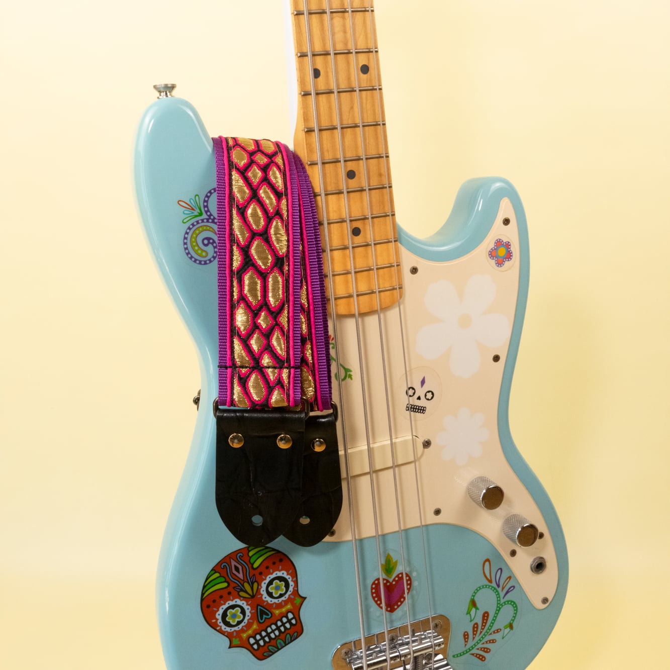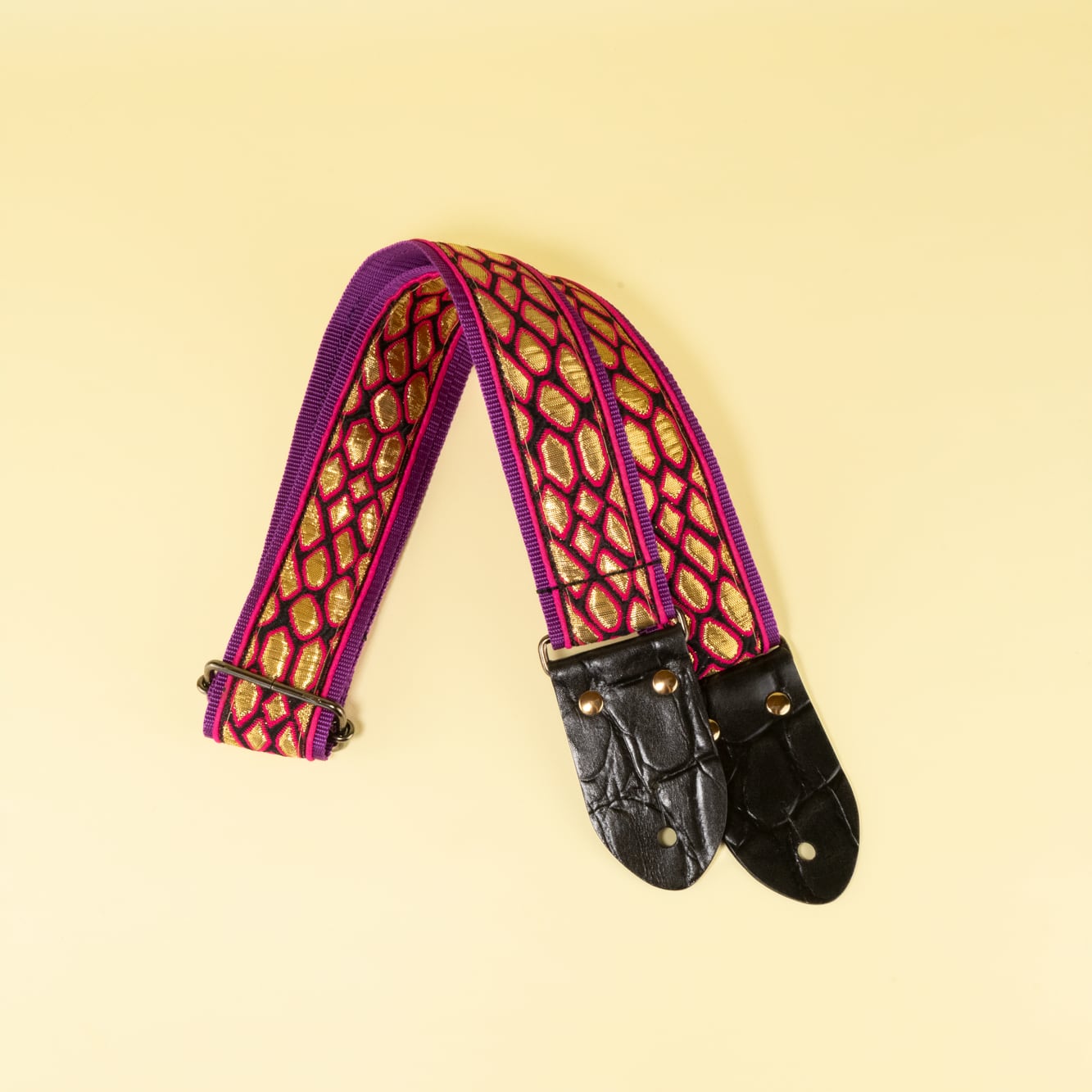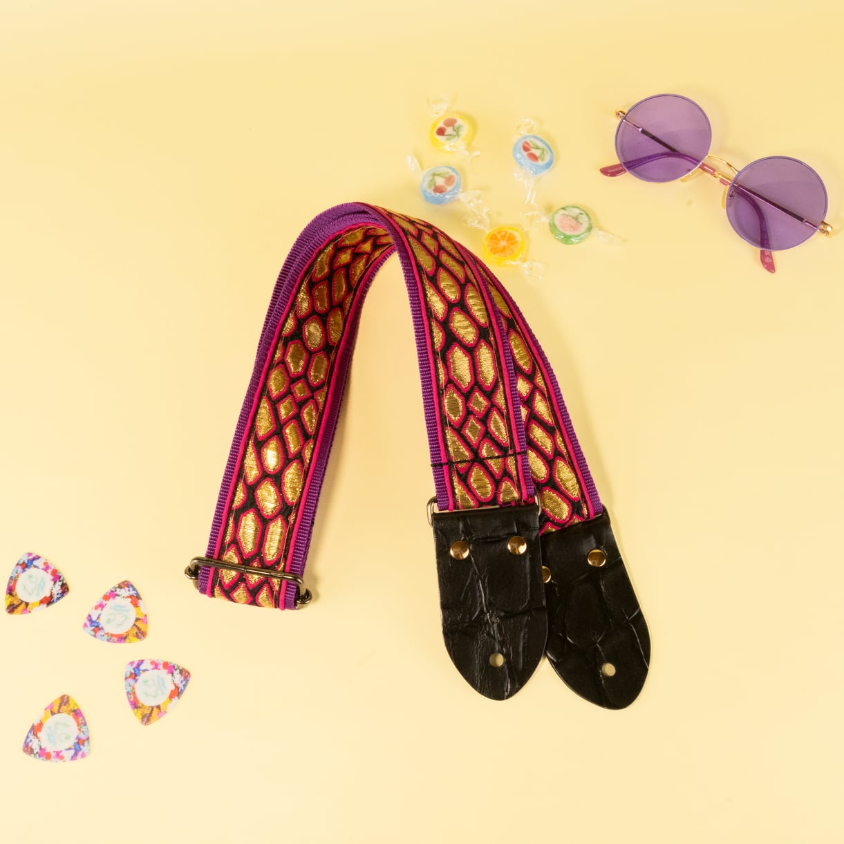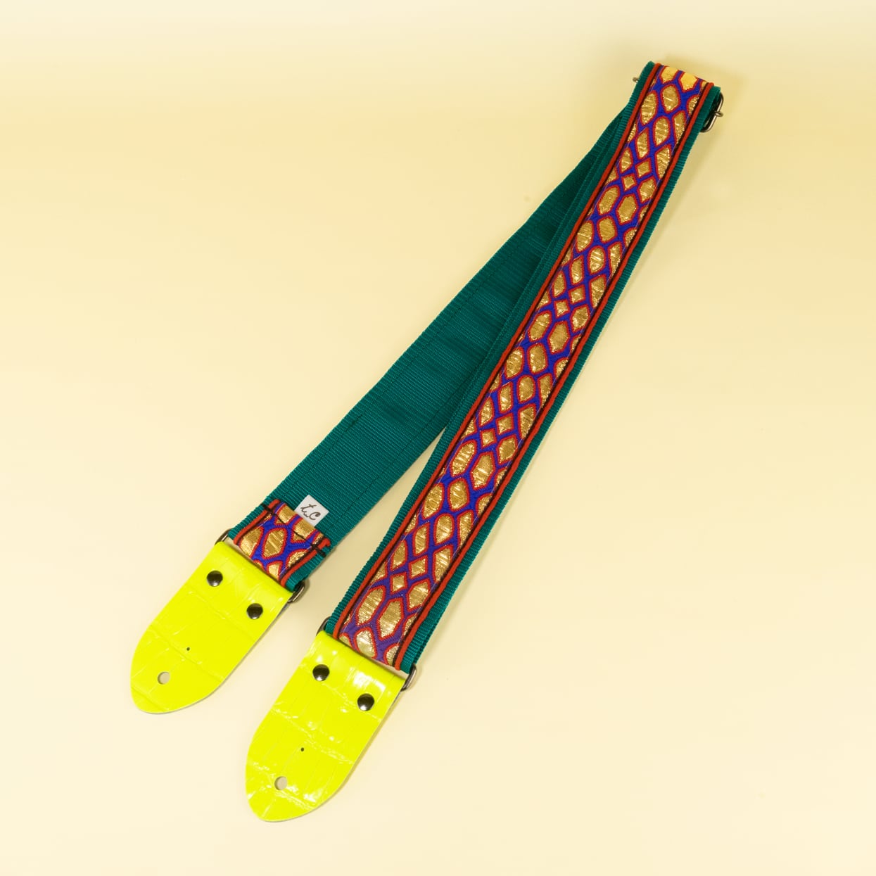 Introducing the "Dragon Scale Guitar Strap," featuring a mysterious and energetic pattern that shimmers like golden dragon scales! This one-of-a-kind piece showcases tsundrum_chan's signature eye-popping, vivid color palette.
