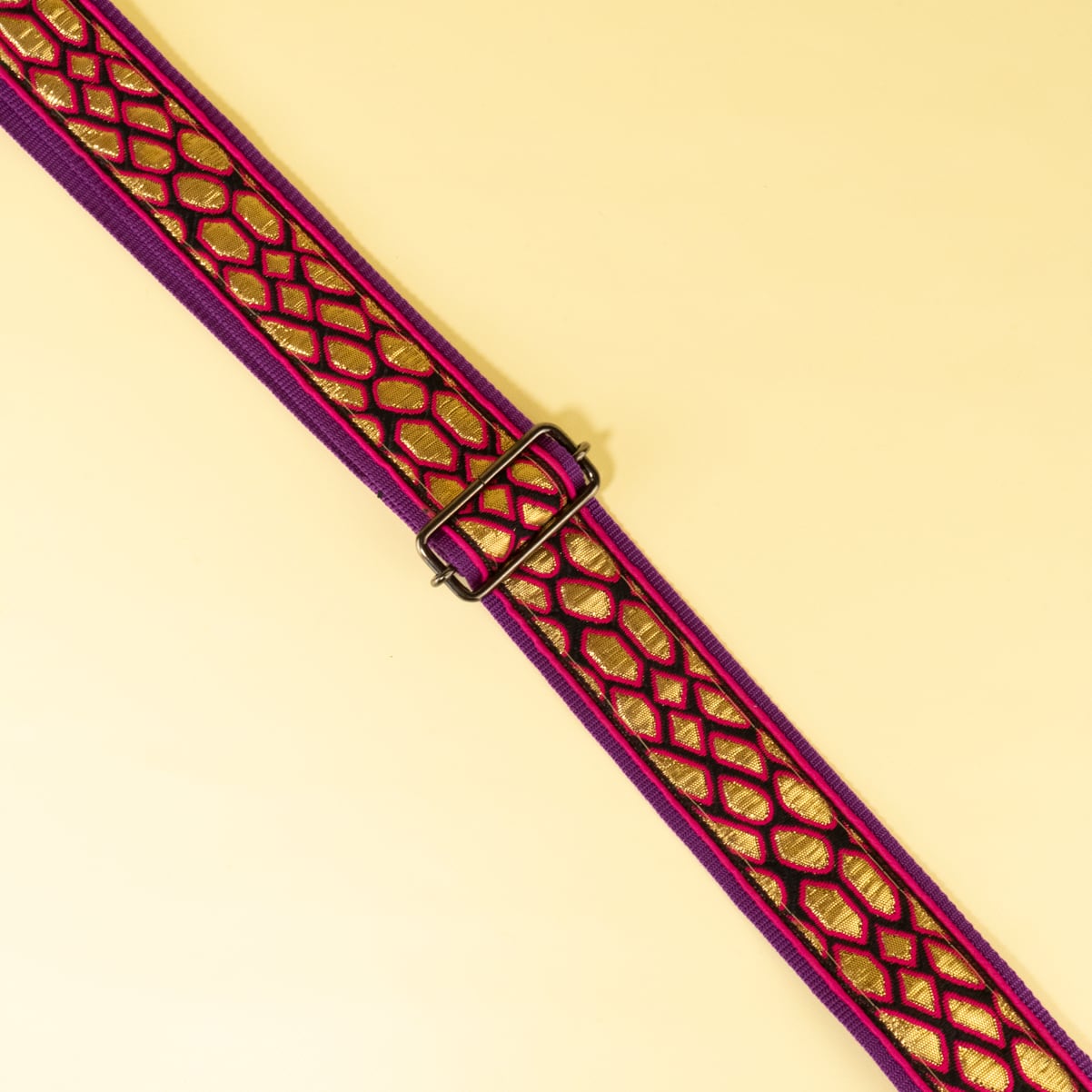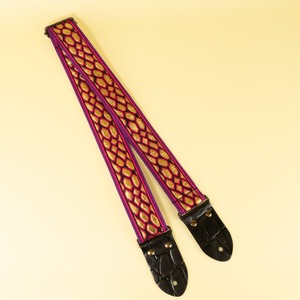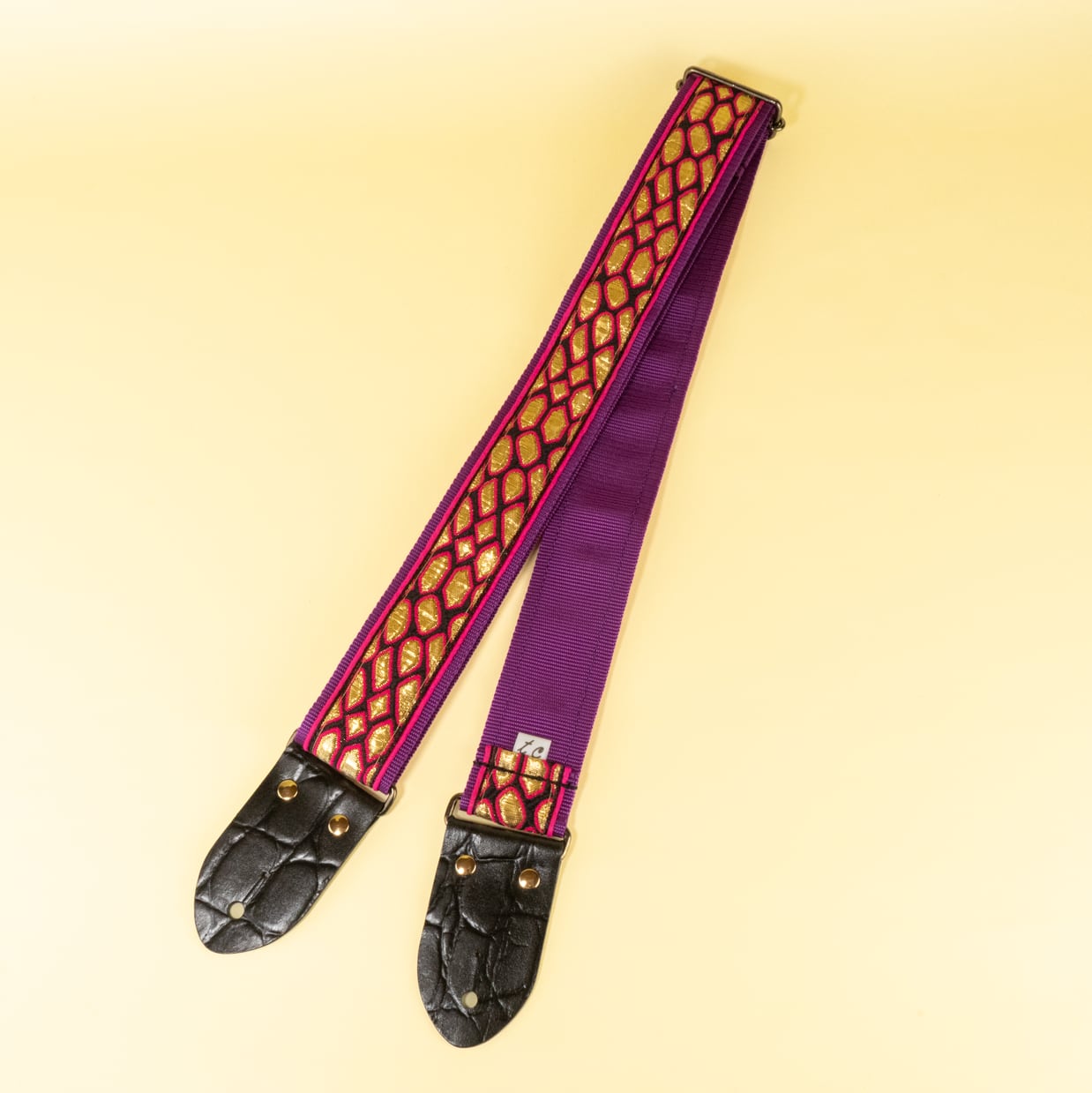ゴールドに輝く龍の鱗(ウロコ)のような、神秘的かつエネルギッシュな模様が目を引く「ウロコ柄ギターストラップ」が登場!