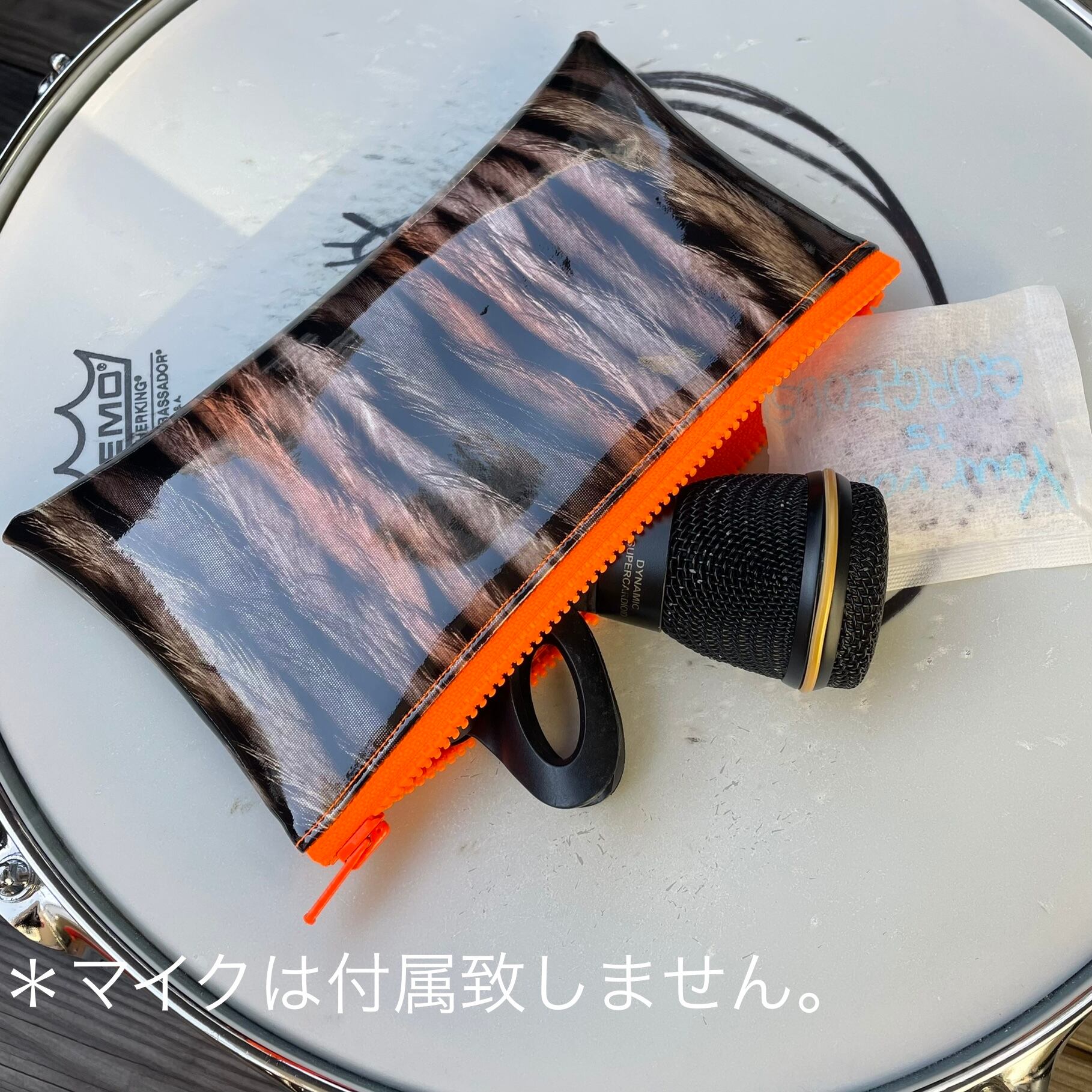 アンプの上や暗いステージ上で迷子になりやすいマイクケースを、フェイクファー柄のエナメル生地とPVCでかわいく目立たせて、気分も効率も上げてみてはいかがでしょう?