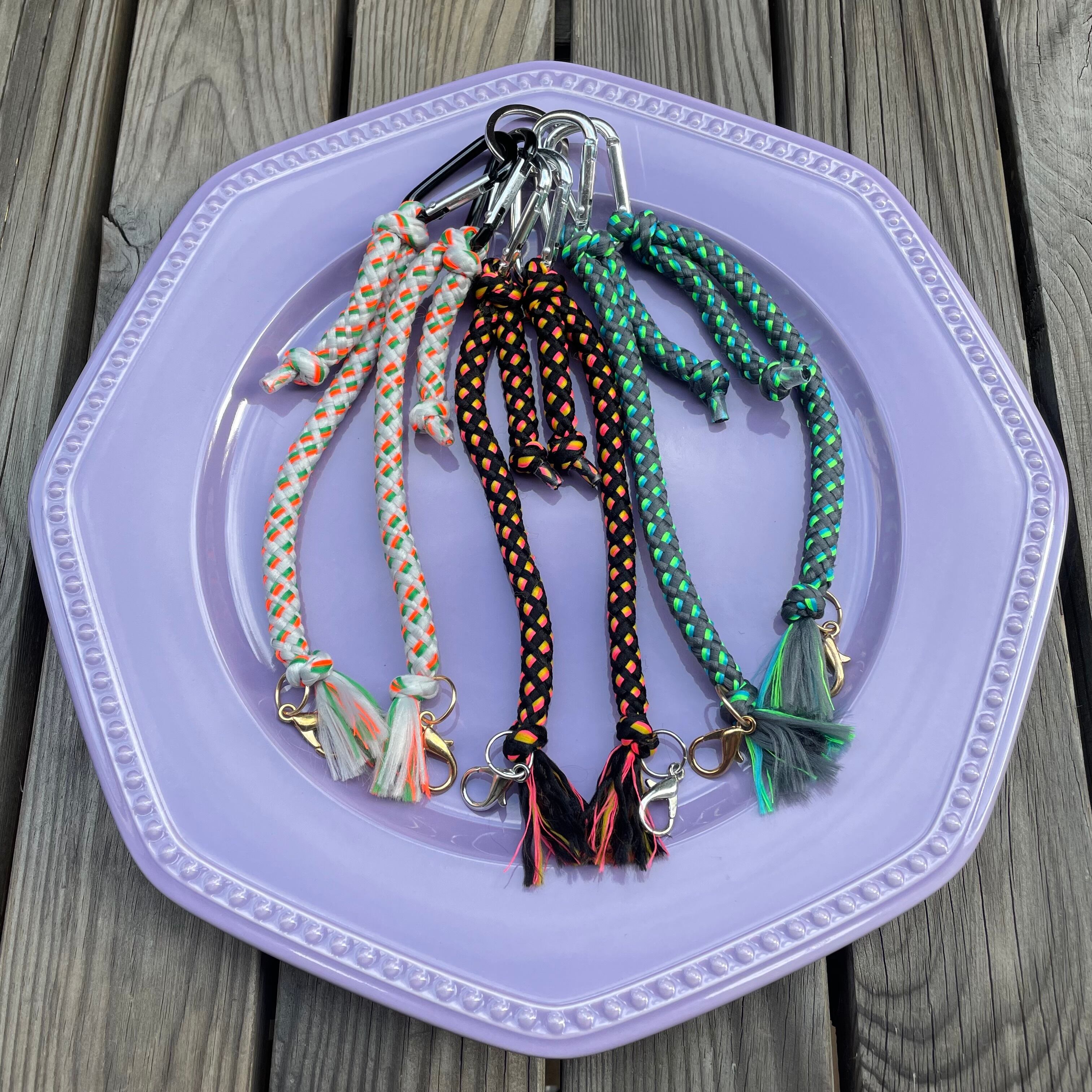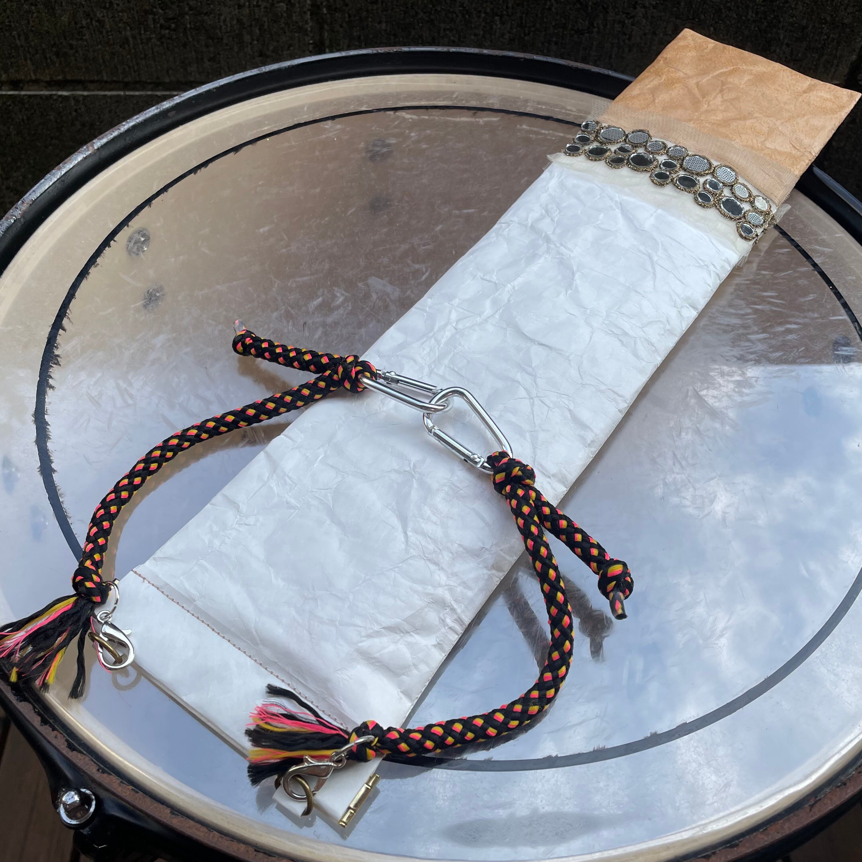 あのバンドと同じ「スリップ・ノット(=引き解け結び)」という結び方のストラップは、コロンとした結び目とビビッドな差し色がかわいい一品です。どんな色のフロアタムにぶら下げても、かわいく主張してくれるはず!