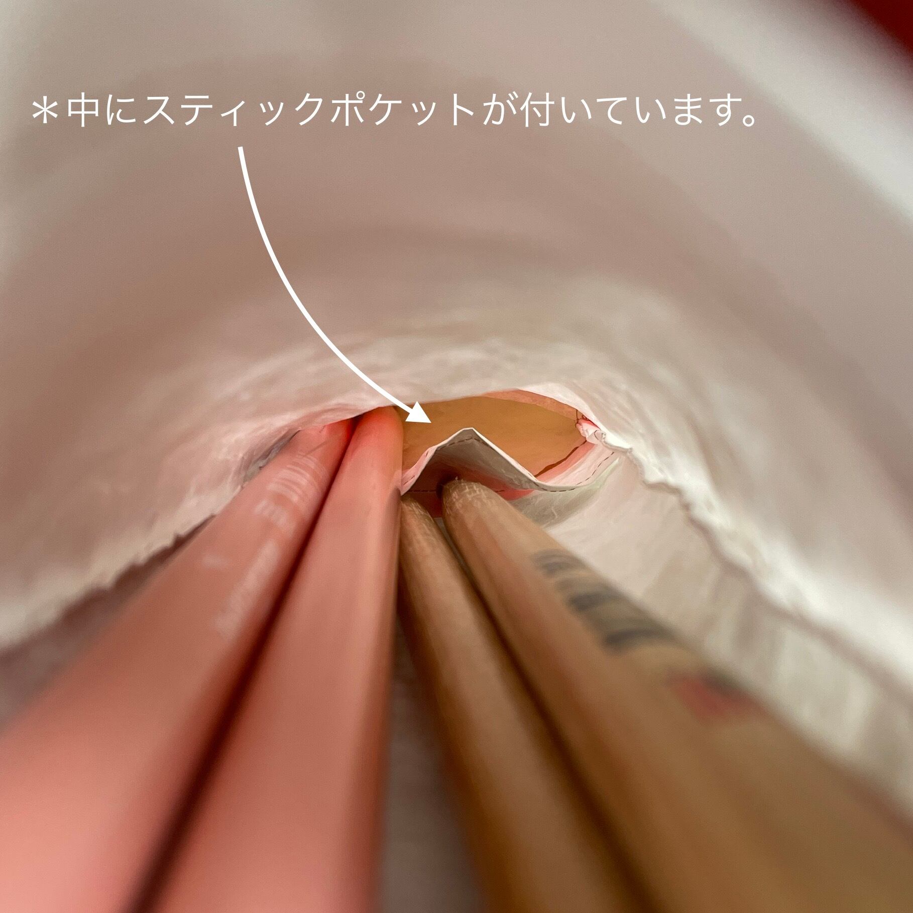 フロアタムにぶら下げるときは、内側のスティックポケットにスティックの先を入れれば持ち手部分が飛び出して、演奏中のもしも!の時にも取り出しやすい仕様です。