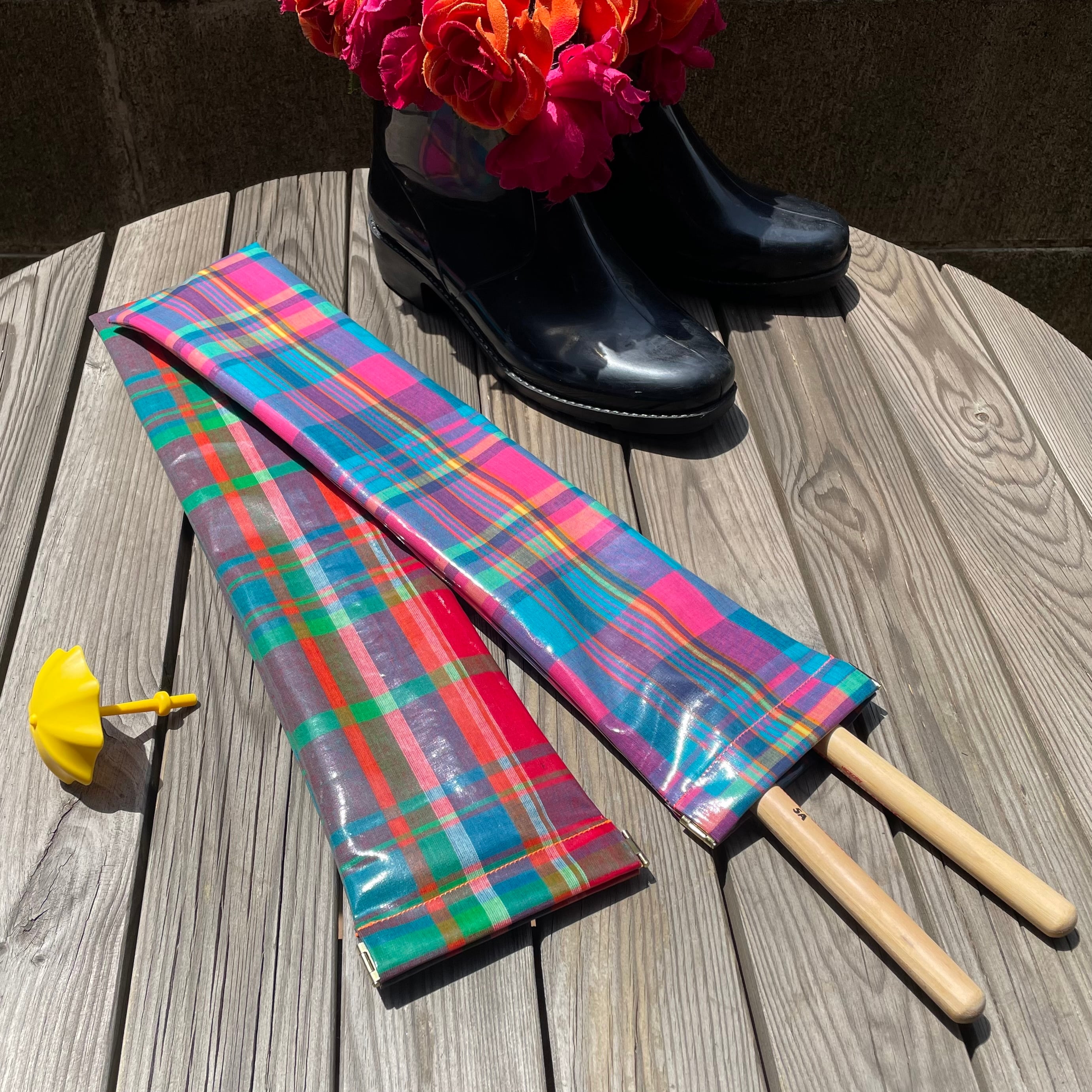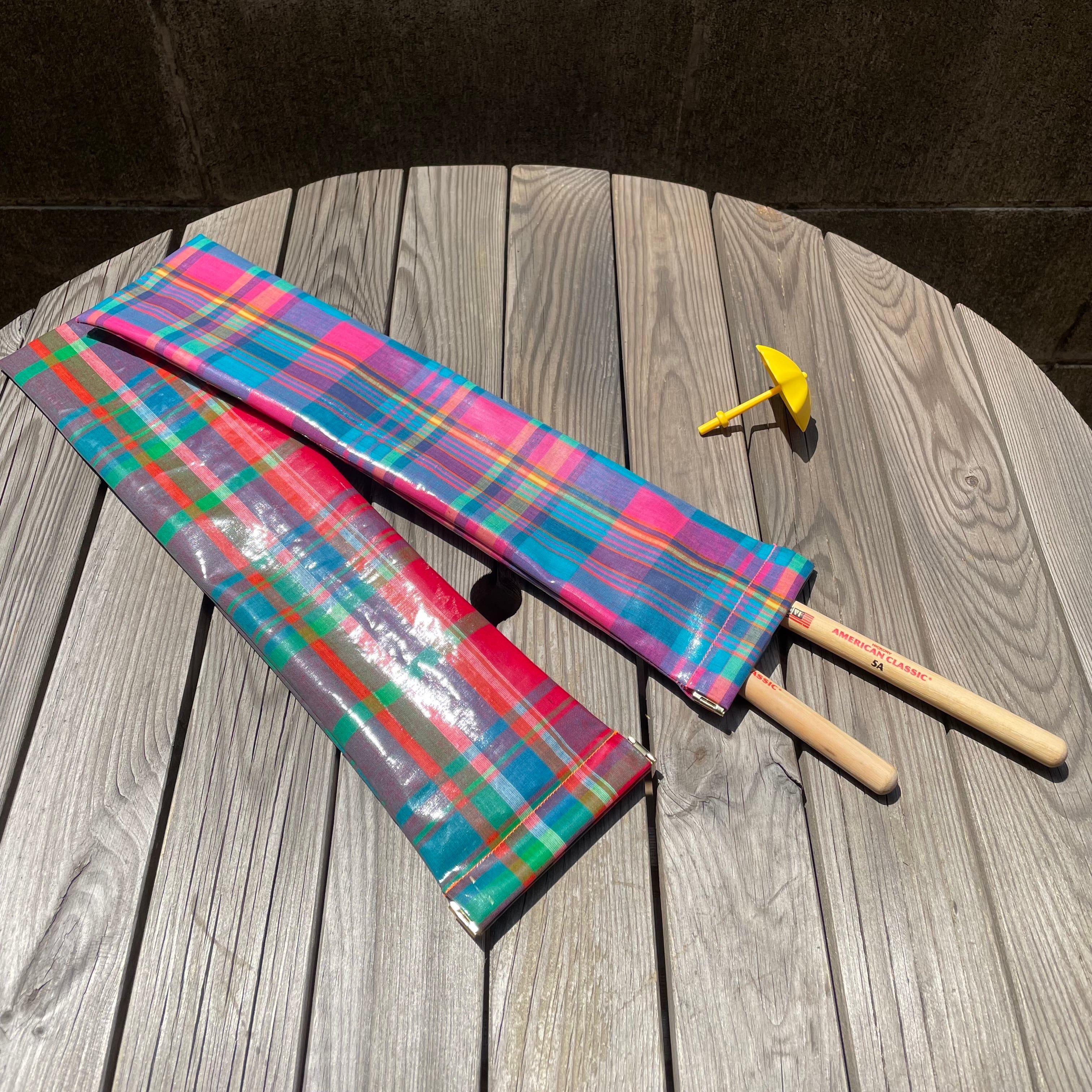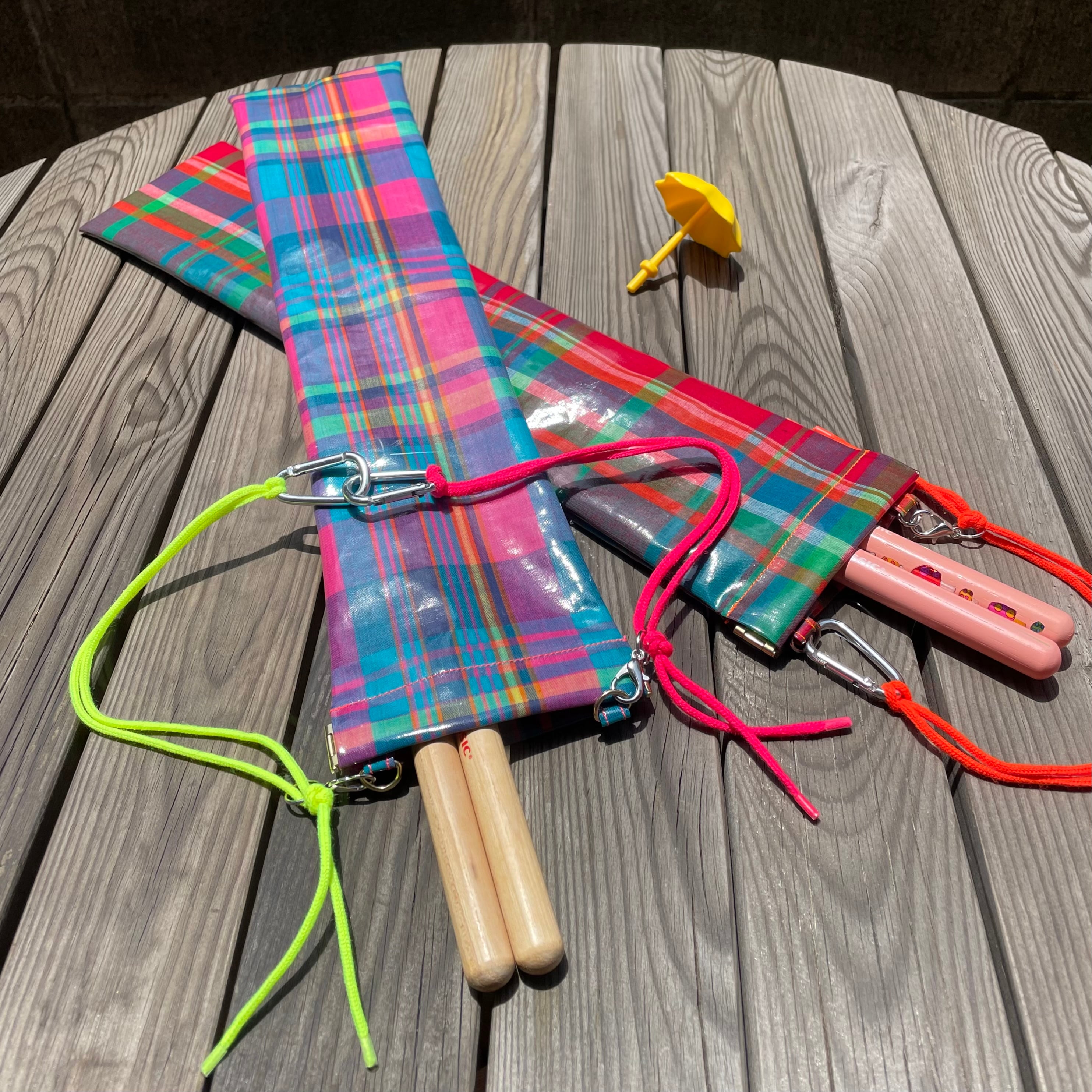 レインコートを思わせるヨーロピアンレトロなチェック柄にネオンカラーのステッチが眩しいスティックケースは、雨の日の気分をアゲてくれる強い味方。