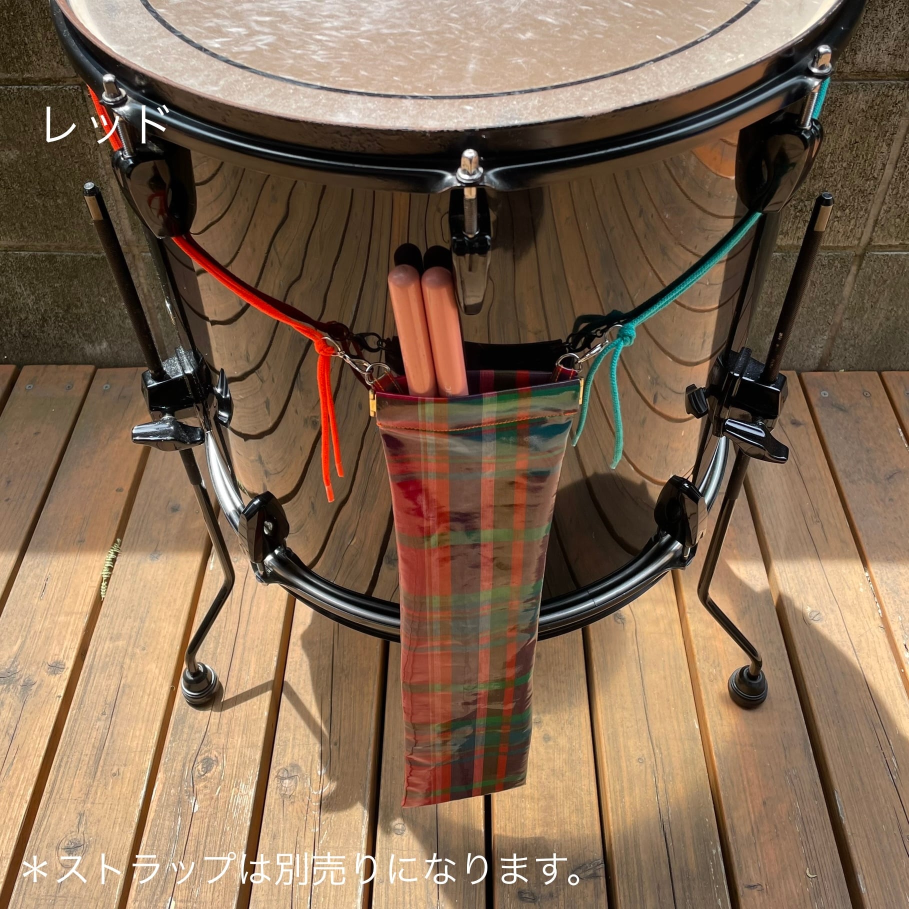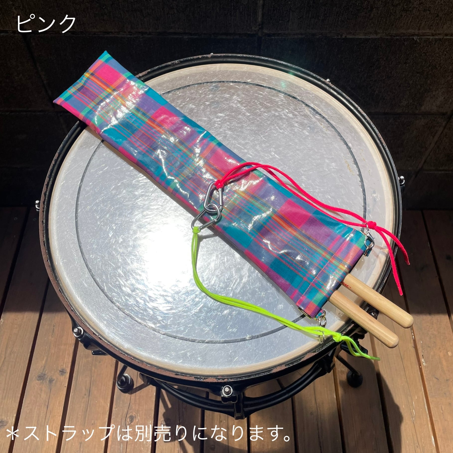 フロアタムにぶら下げるときは内側のスティックポケットにスティックの先を入れれば、持ち手部分が飛び出して演奏中のもしも!の時にも取り出しやすい仕様です。