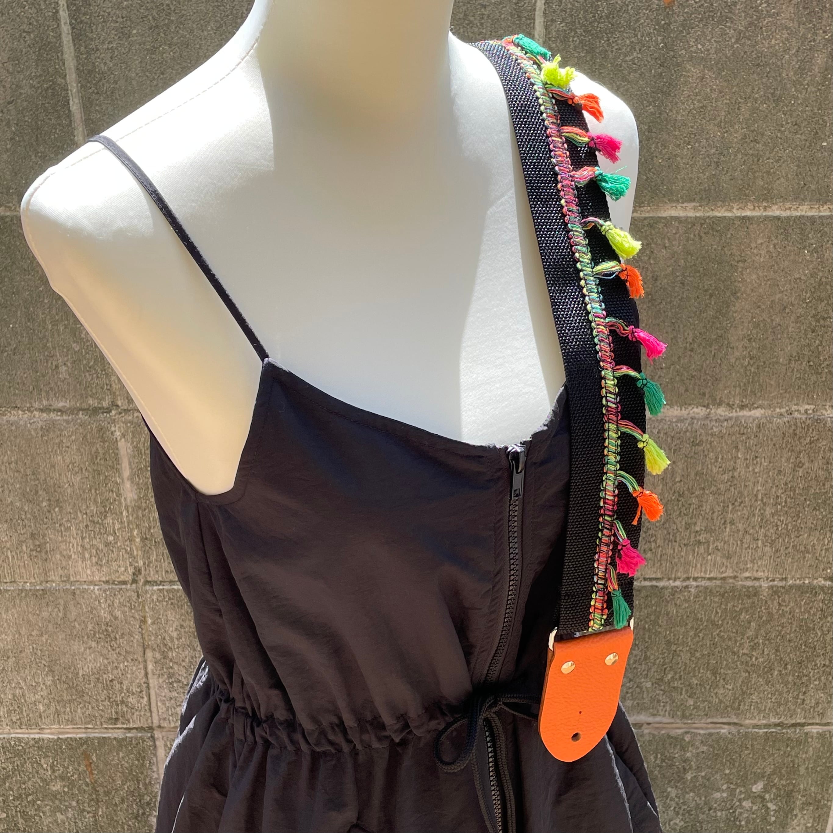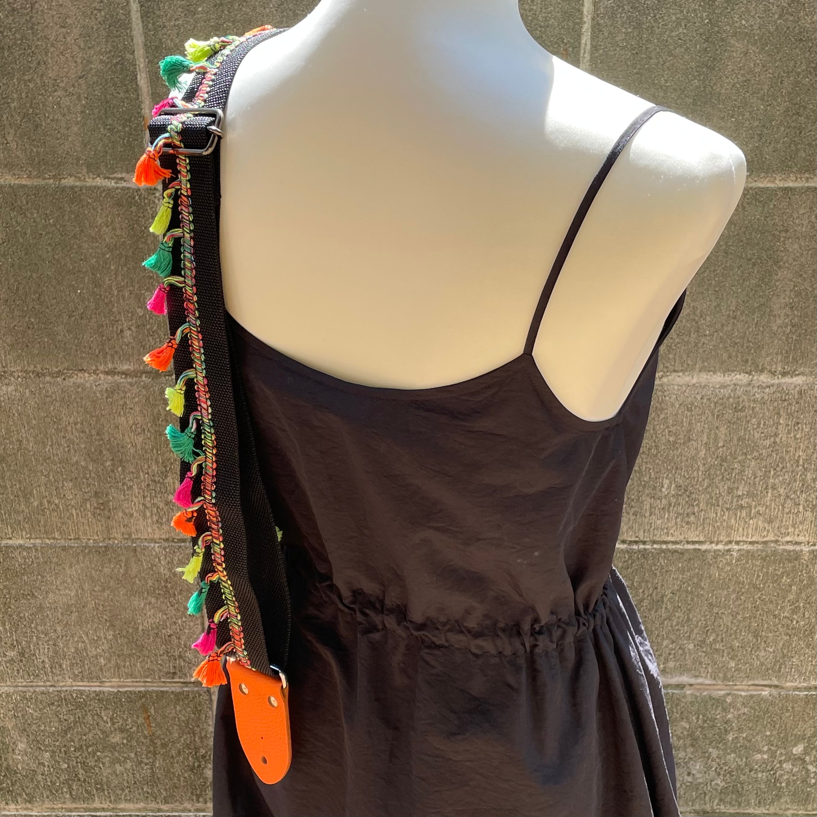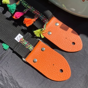 安定感があって地球にも優しい黒いポリプロピレンバンドに、小さな4色のタッセルを惜しみなくぶら下げたデザイン。タッセルと同じオレンジ色のストラップエンドが付いて、元気でキュートな色使いになっています。
