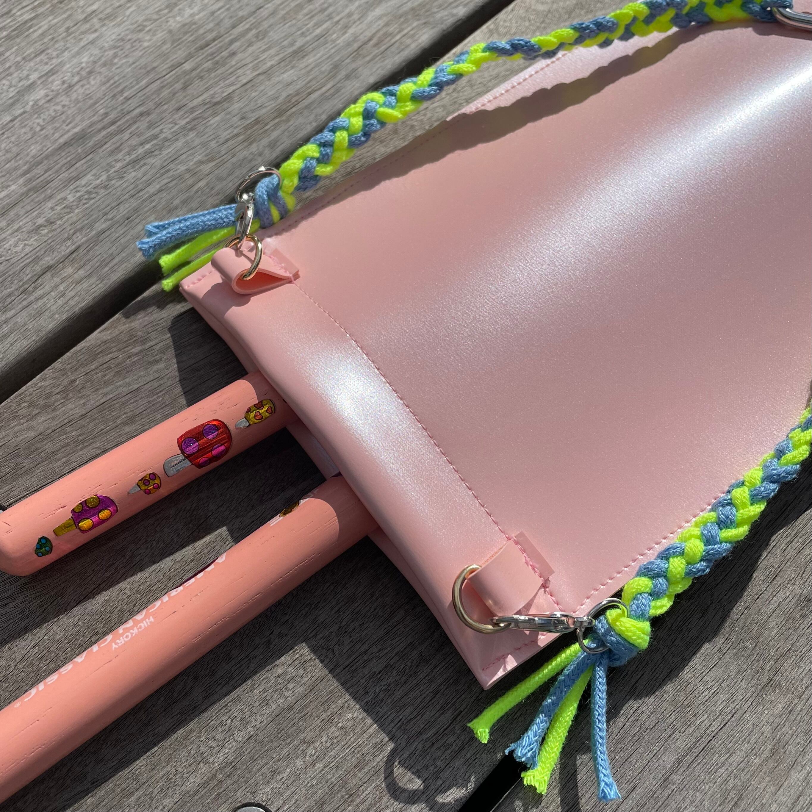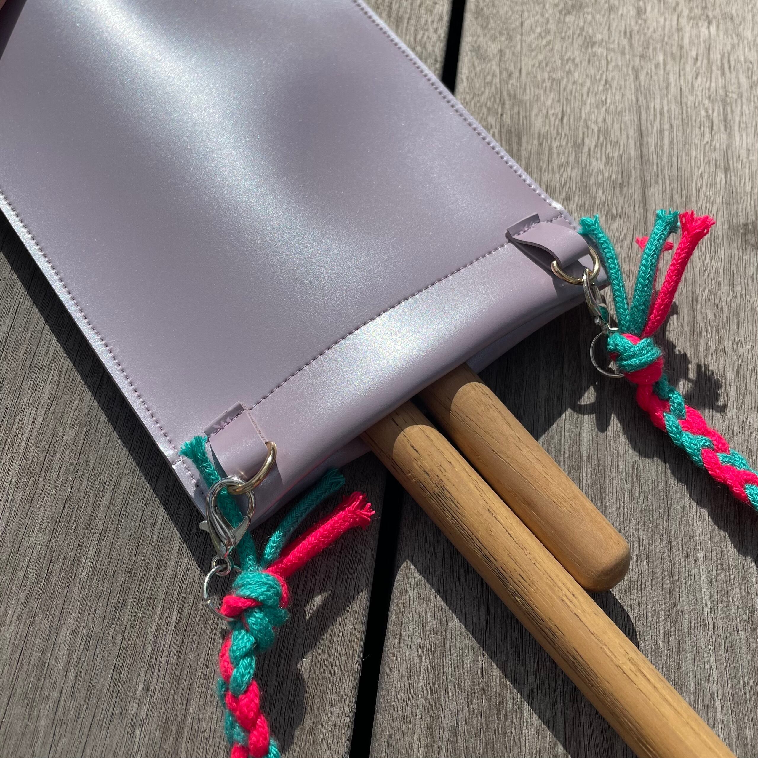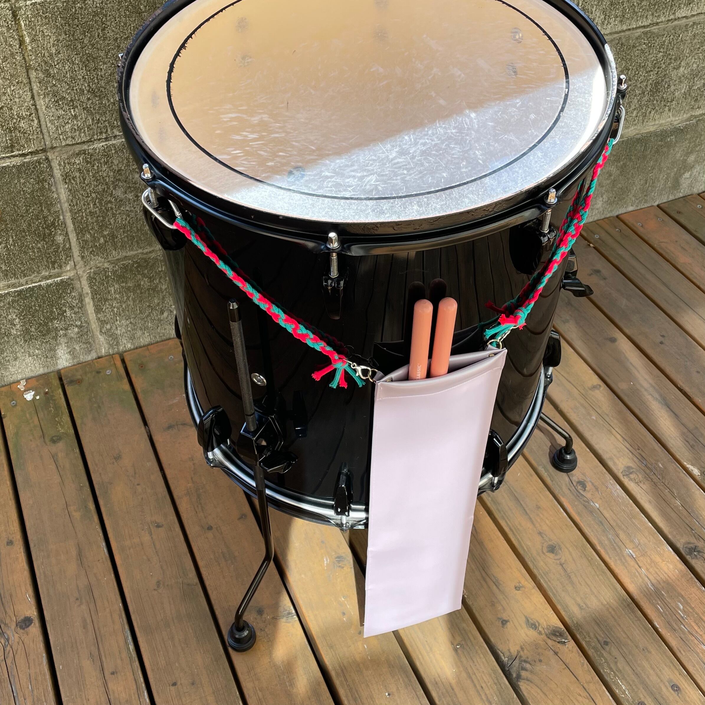 フロアタムにぶら下げるときは内側のスティックポケットにスティックの先を入れれば、持ち手部分が飛び出して演奏中のもしも!の時にも取り出しやすい仕様です。