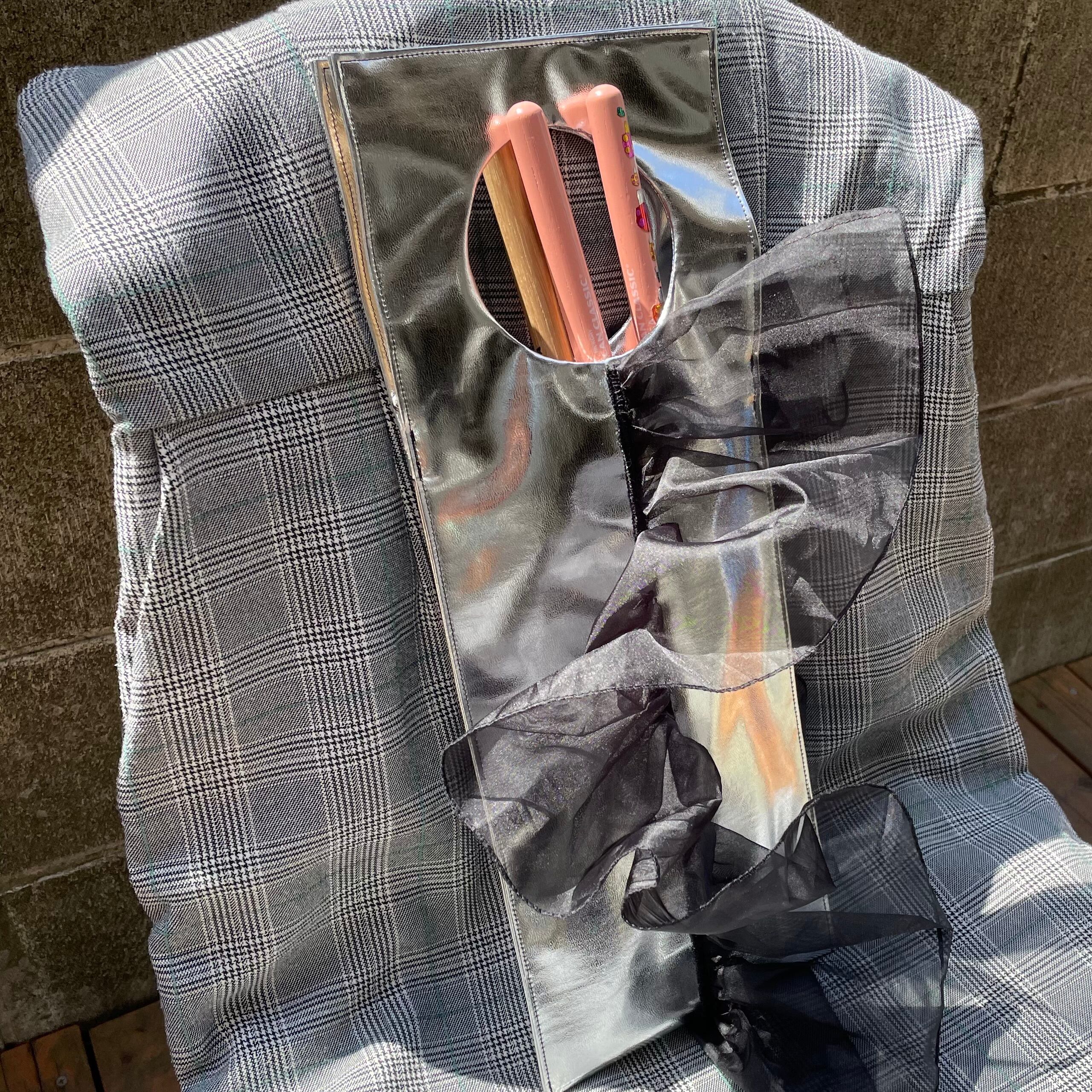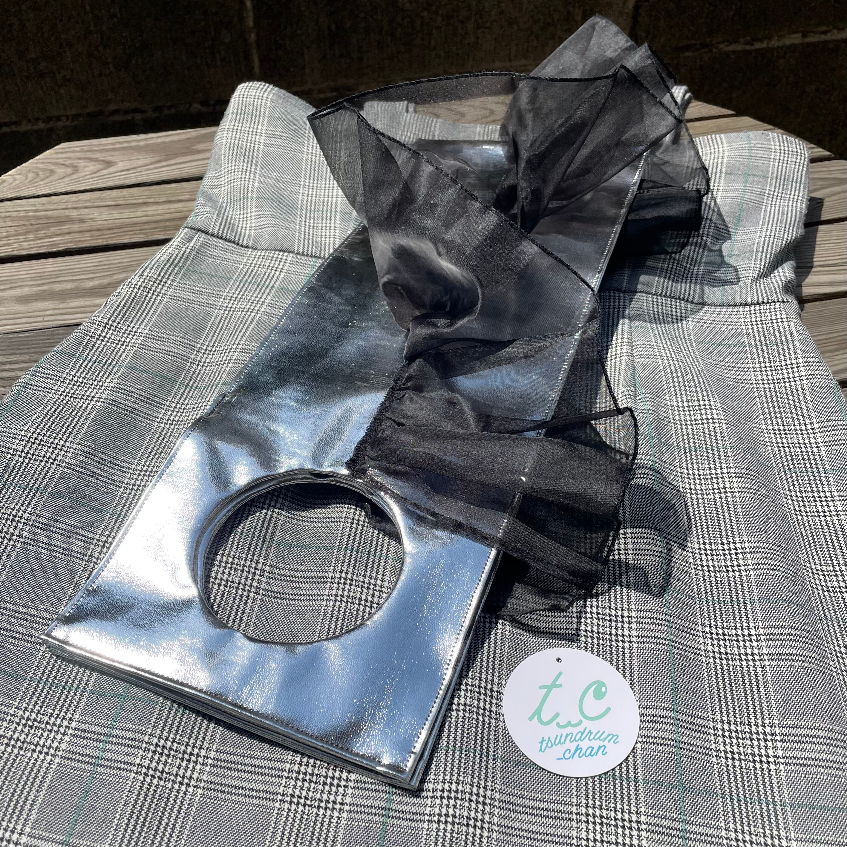 まばゆく輝くシルバー合皮に文句なしのボリュームの黒フリルをモヒカン風にあしらい、パンクな精神を内に秘めつつも、ゴージャスかつエレガントに仕上げました。
