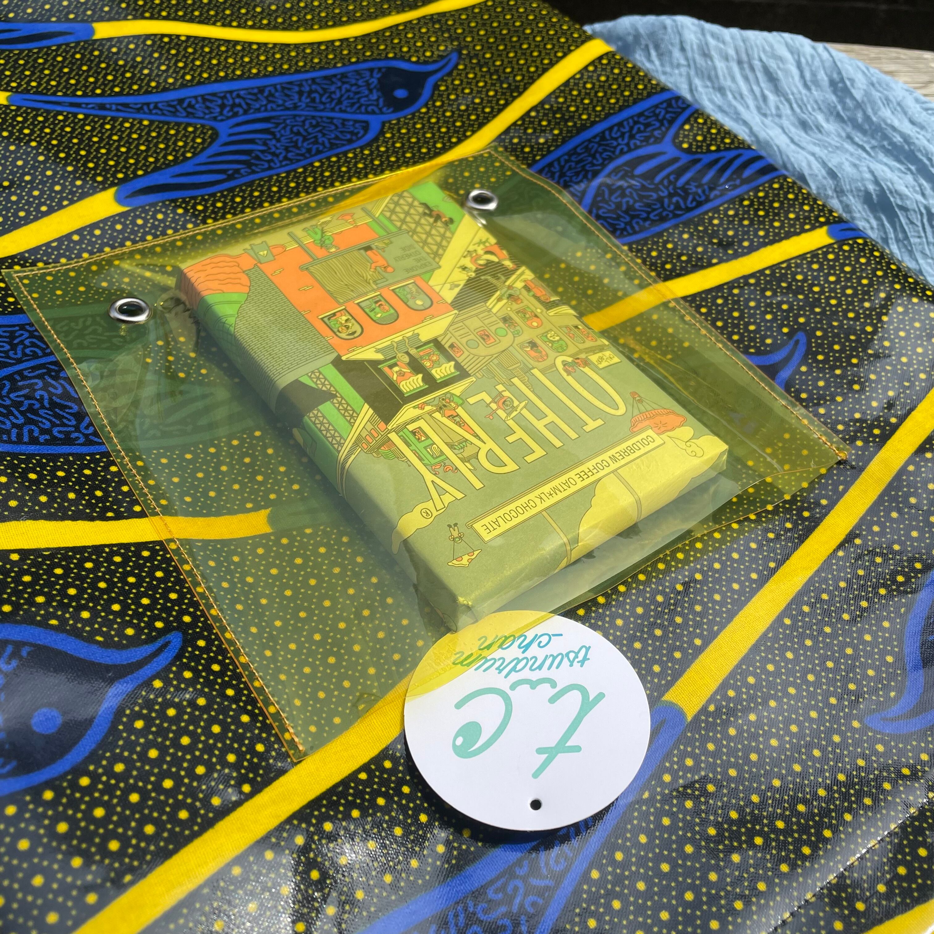 前面はハトメ付きの2重ポケット。カラーPVCだから透け感は控えめ。ポストカードやCDも収納が可能なので、お気に入りの一枚を入れてさりげなくアピールもできちゃいます!