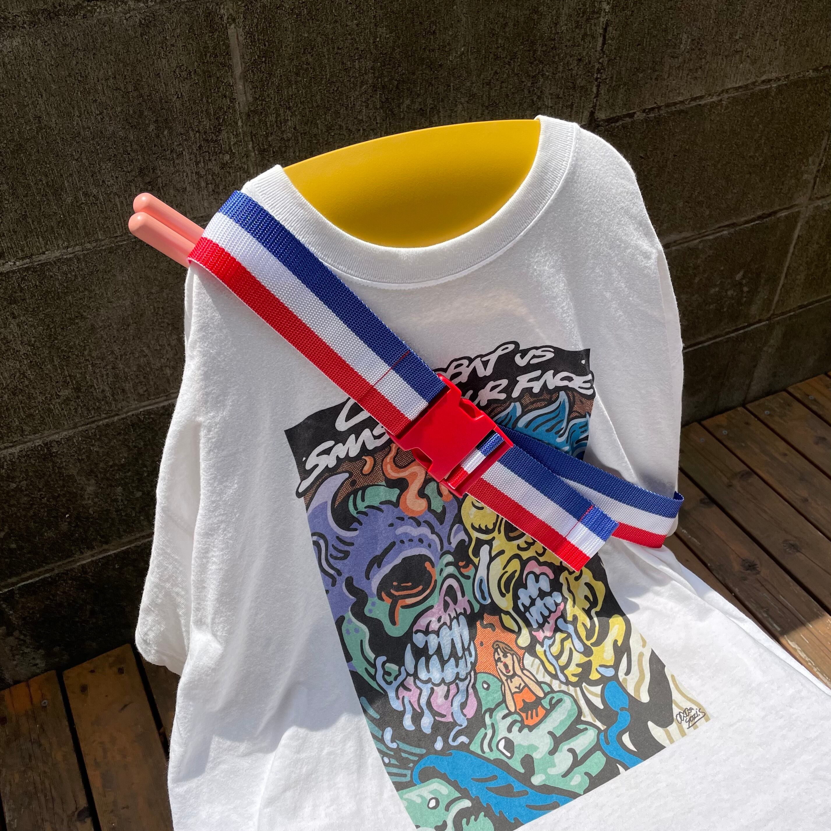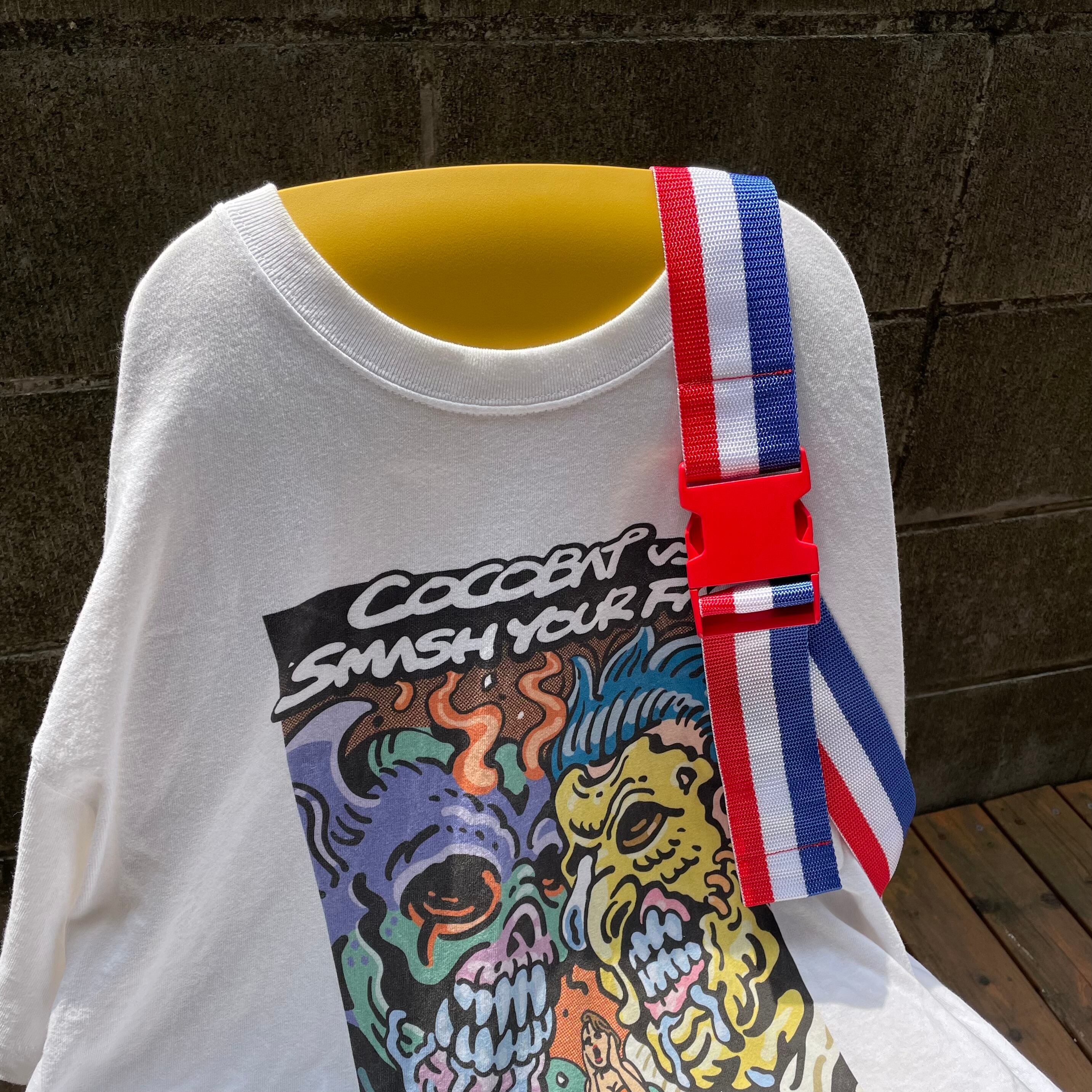 涼しげなブルーのPVC(透明ビニール)生地のポケットとトリコロール柄のベルトは相性抜群!長さ調整が可能な赤いアジャスターバックルで、正面から見てもポップさ・キュートさは間違いナシです。