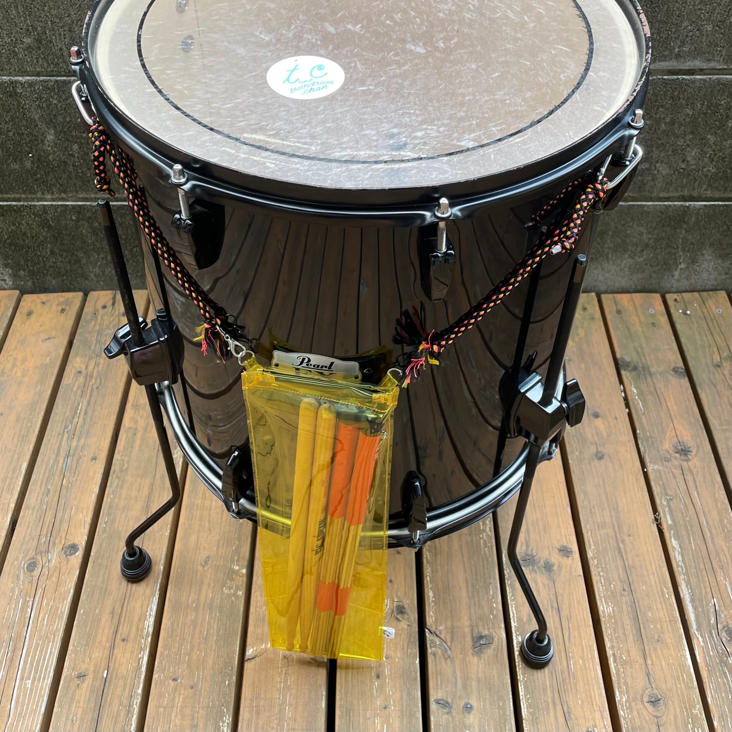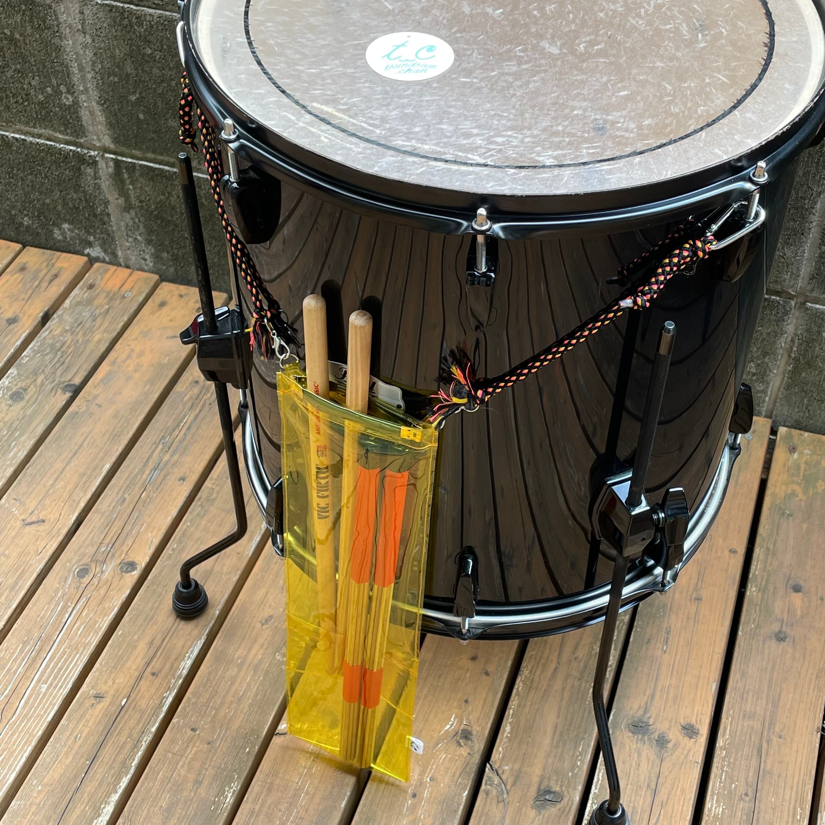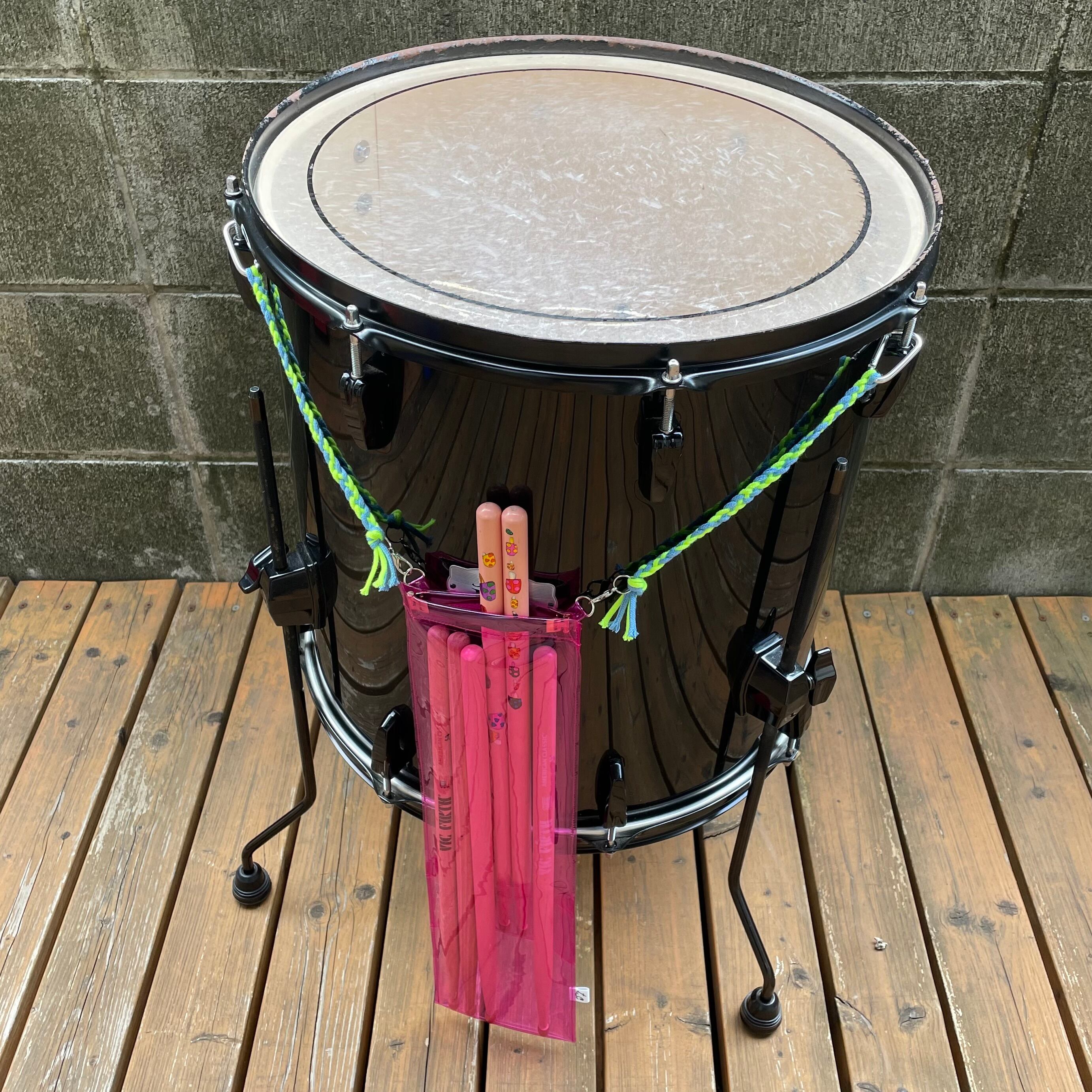 フロアタムにぶら下げるときは、内側のスティックポケットにスティックの先を入れれば持ち手部分が飛び出して、演奏中のもしも!の時にも取り出しやすい仕様です。