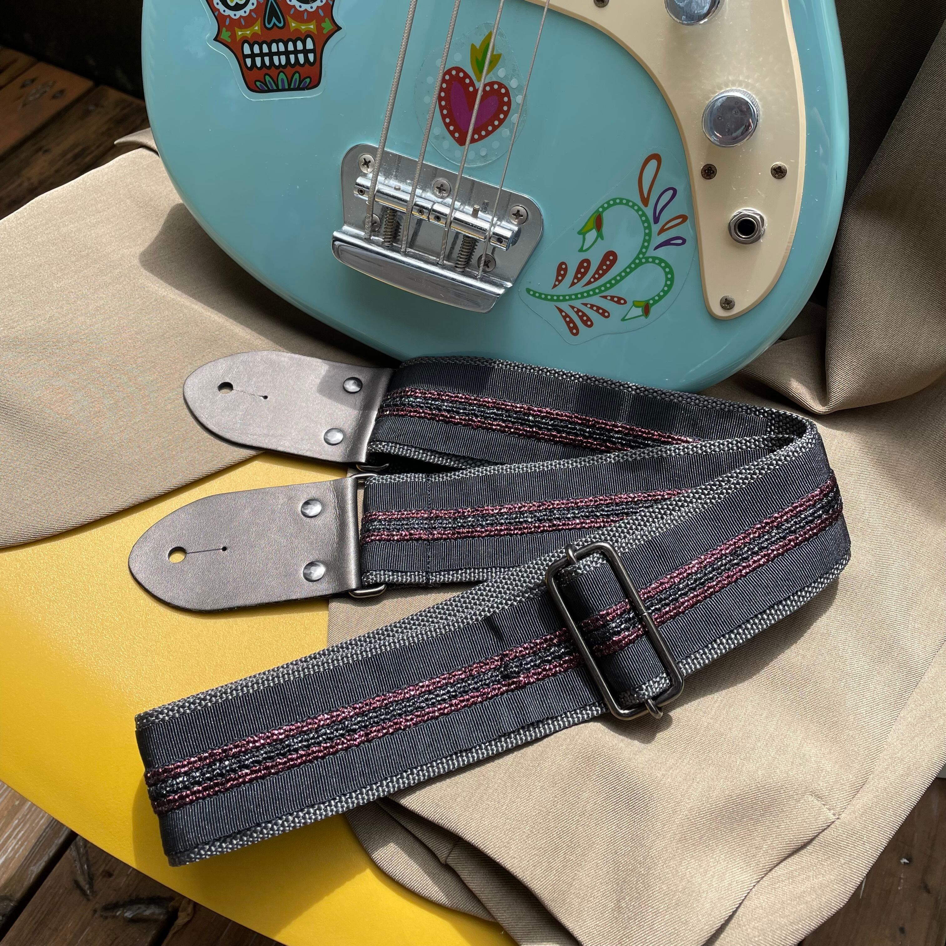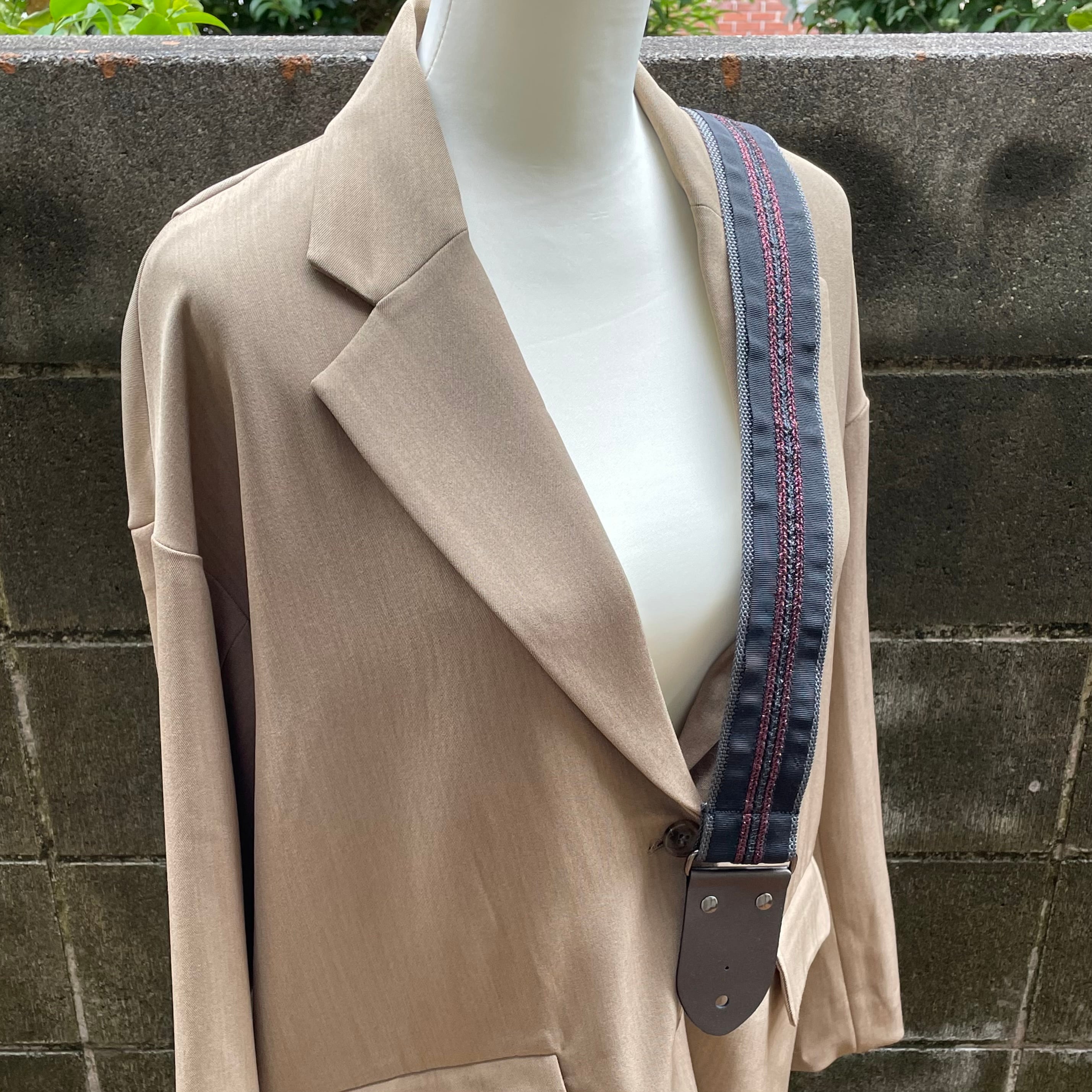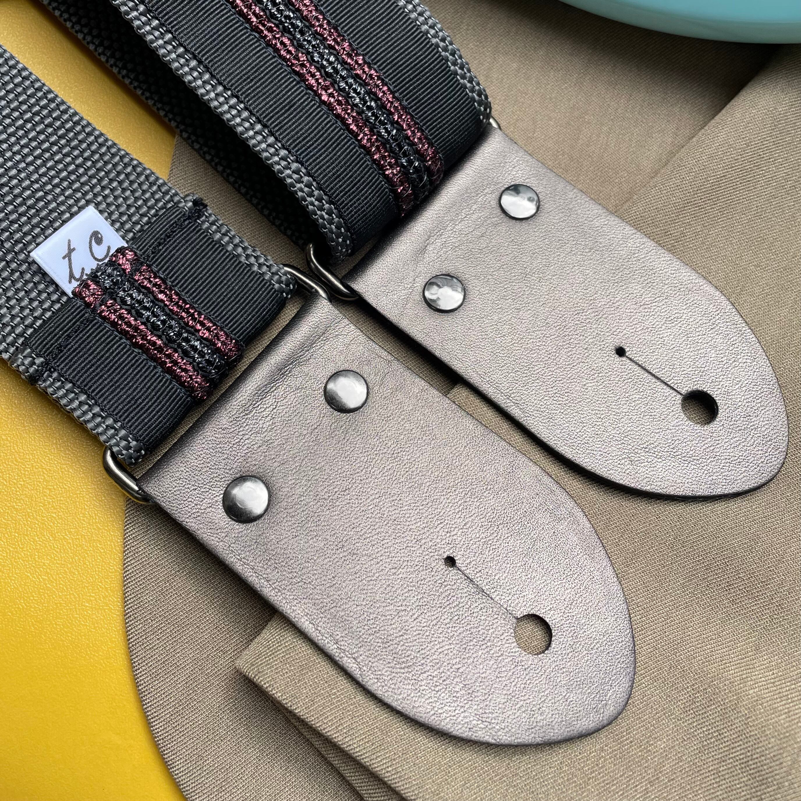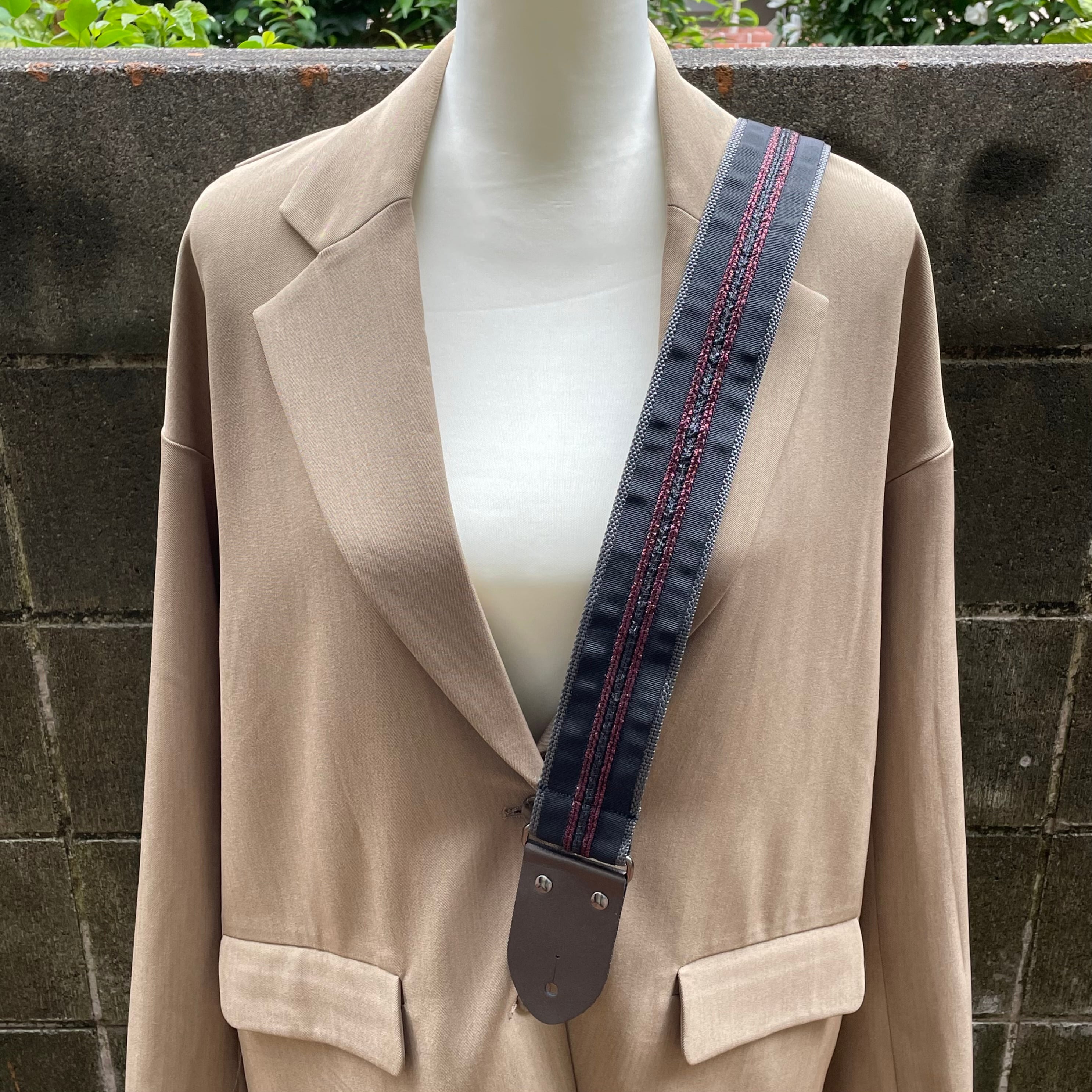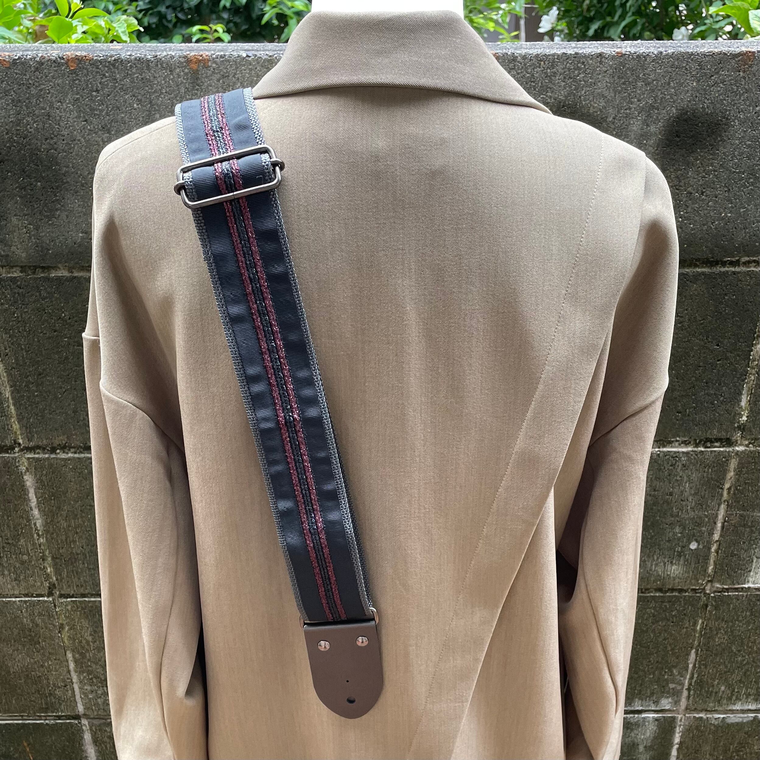 環境に優しく安定性も抜群のチャコールグレーのポリプロピレンバンドを、ワインレッドと黒いラメ糸のストライプが施されたグログランテープで惜しみなく装飾。ストラップエンドのブロンズカラーは落ち着いた中にも光沢感があります。金属パーツはアジャスターからカシメまで黒メッキで、シックなスーツスタイルに似合うようデザイン致しました。