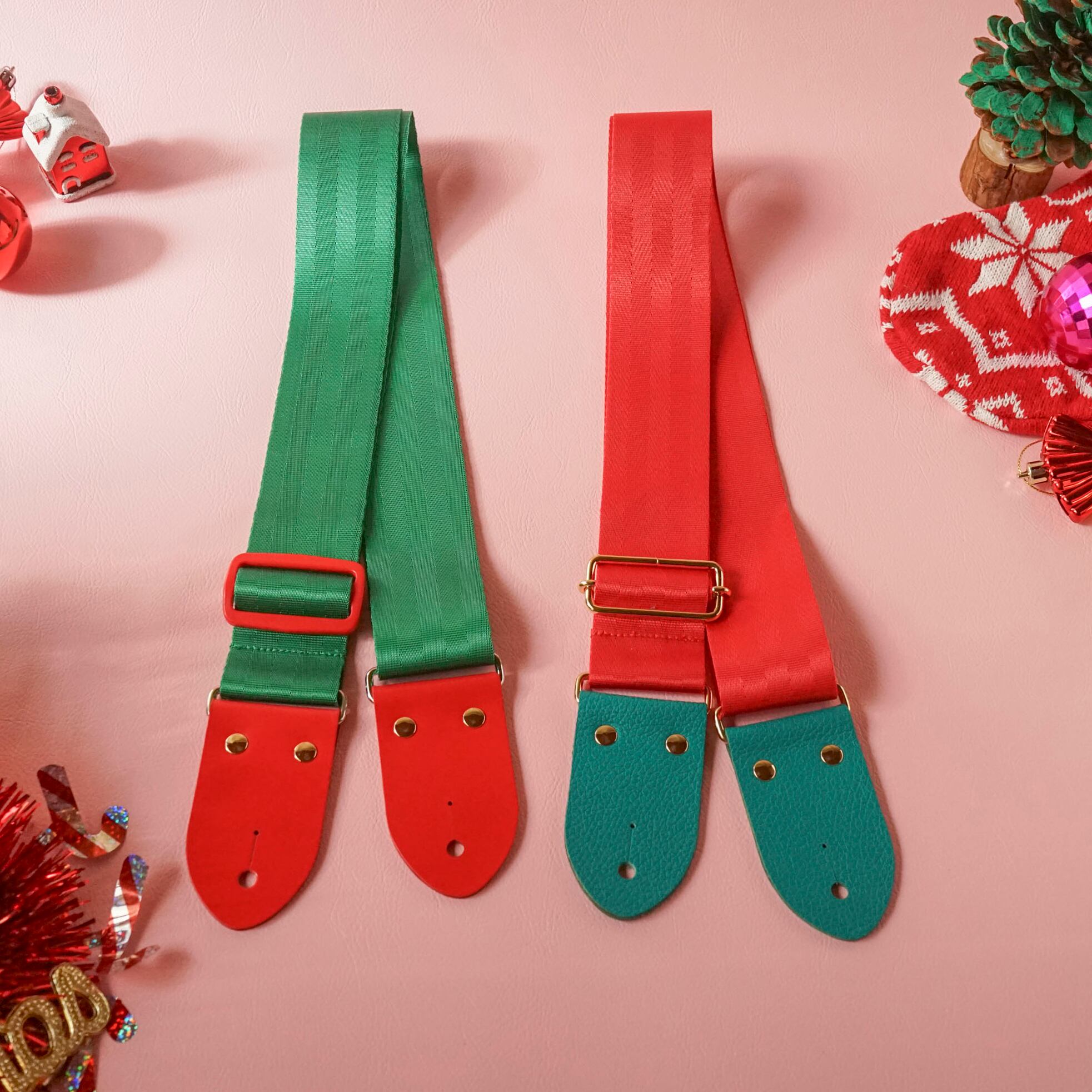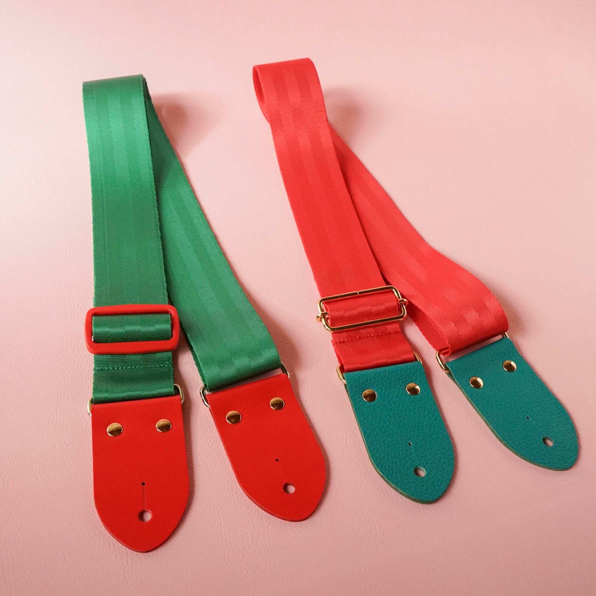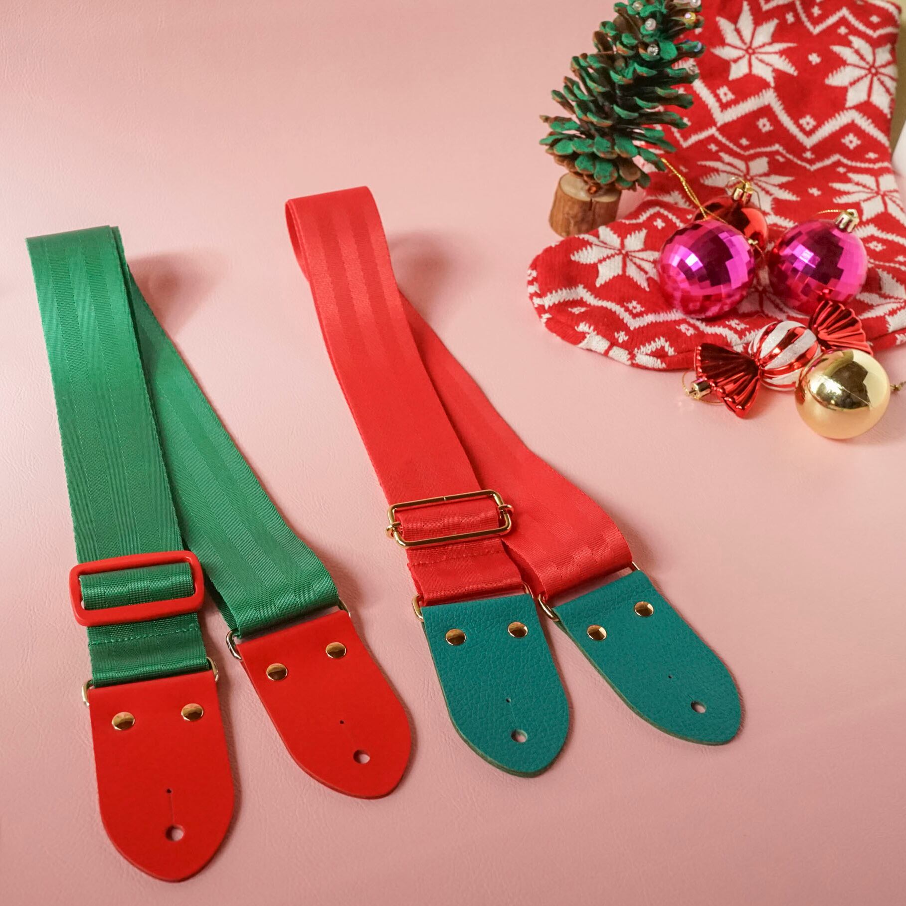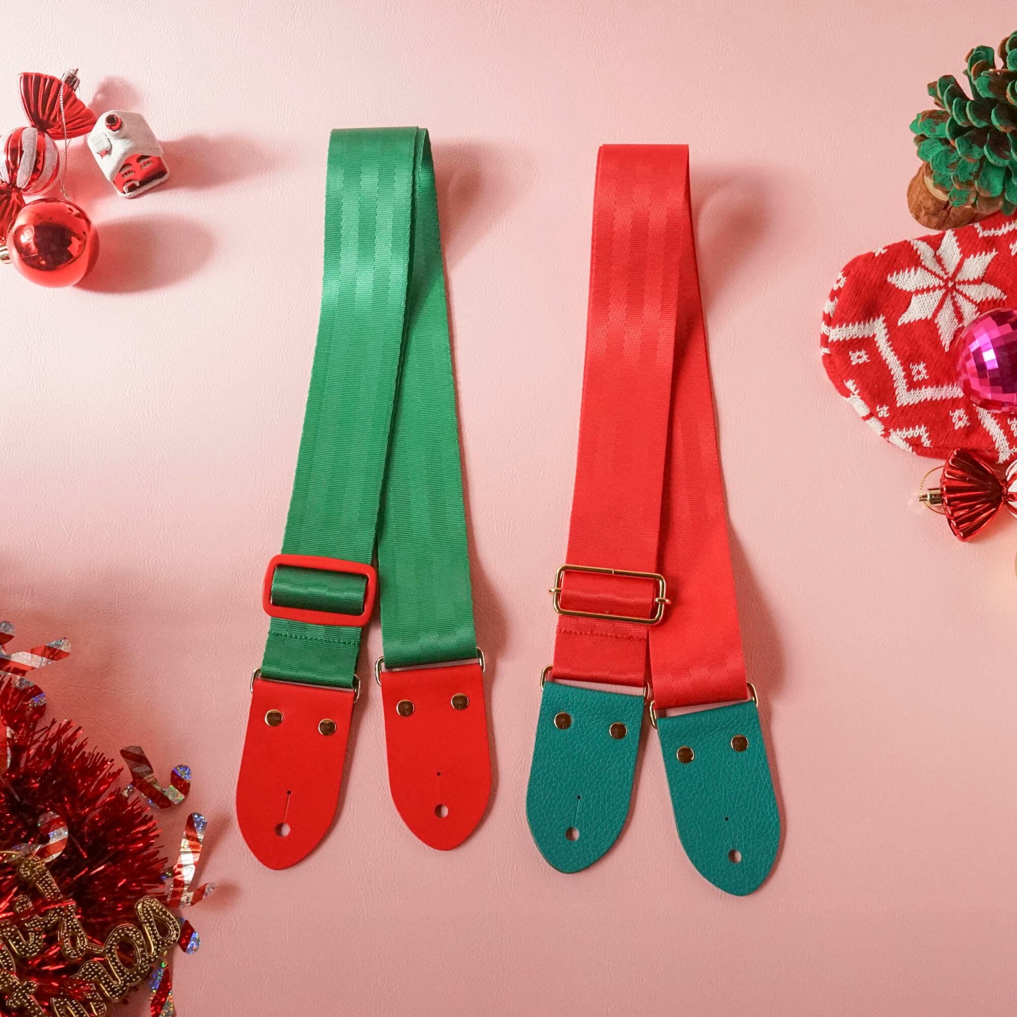 カラフルシートベルトギターストラップを、この季節ならではの赤×緑でポップに大人かわいく仕上げた、「クリスマスカラーシートベルトギターストラップ」登場です!