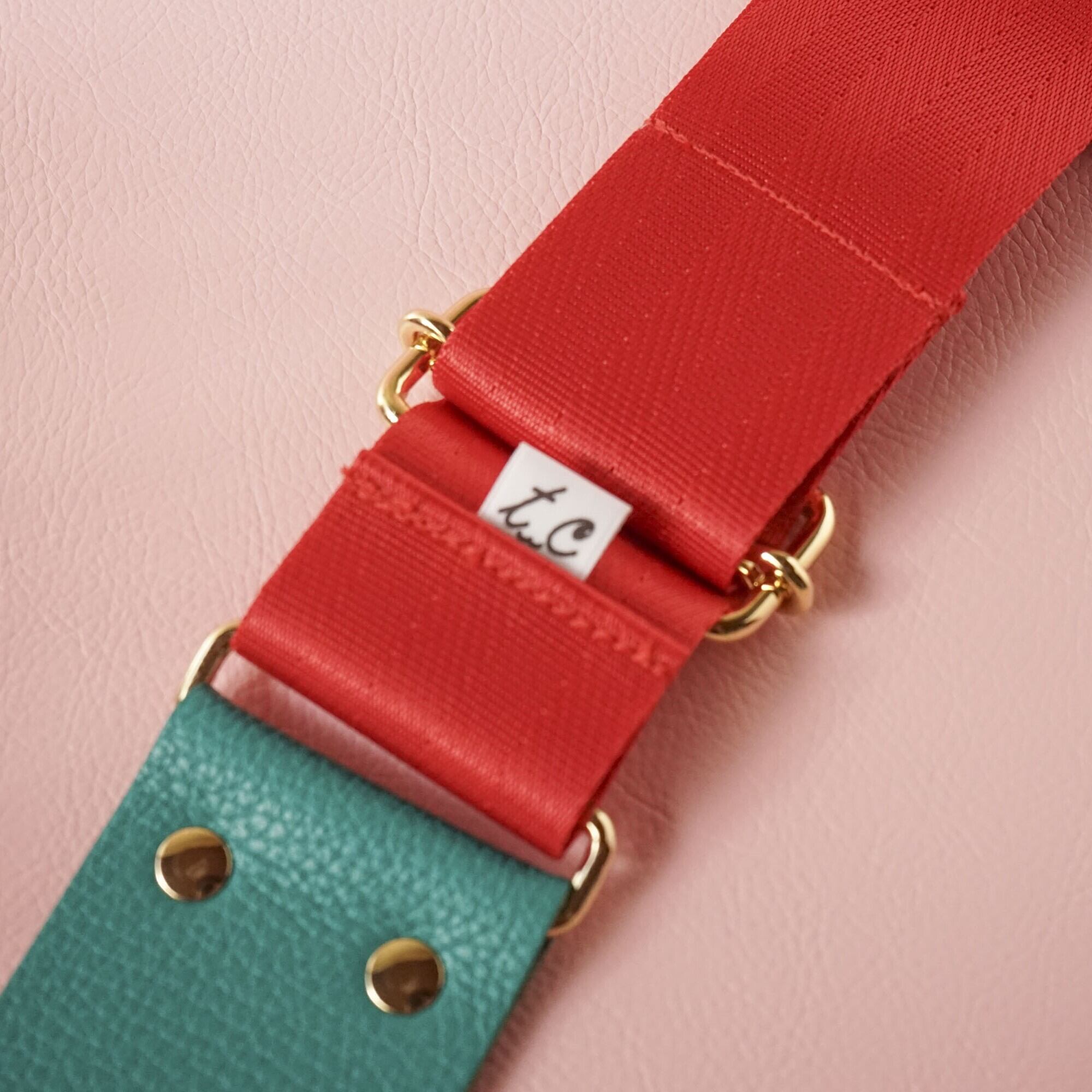 滑らかで肌辺りもよいシートベルトを基調に、緑には艶感が革とは思えない真っ赤なストラップエンドと赤プラアジャスターを合わせ飛び切りポップな印象に、赤にはヨーロピアンなグリーンのストラップエンドとゴールドパーツを合わせ大人かわいく仕上げました。