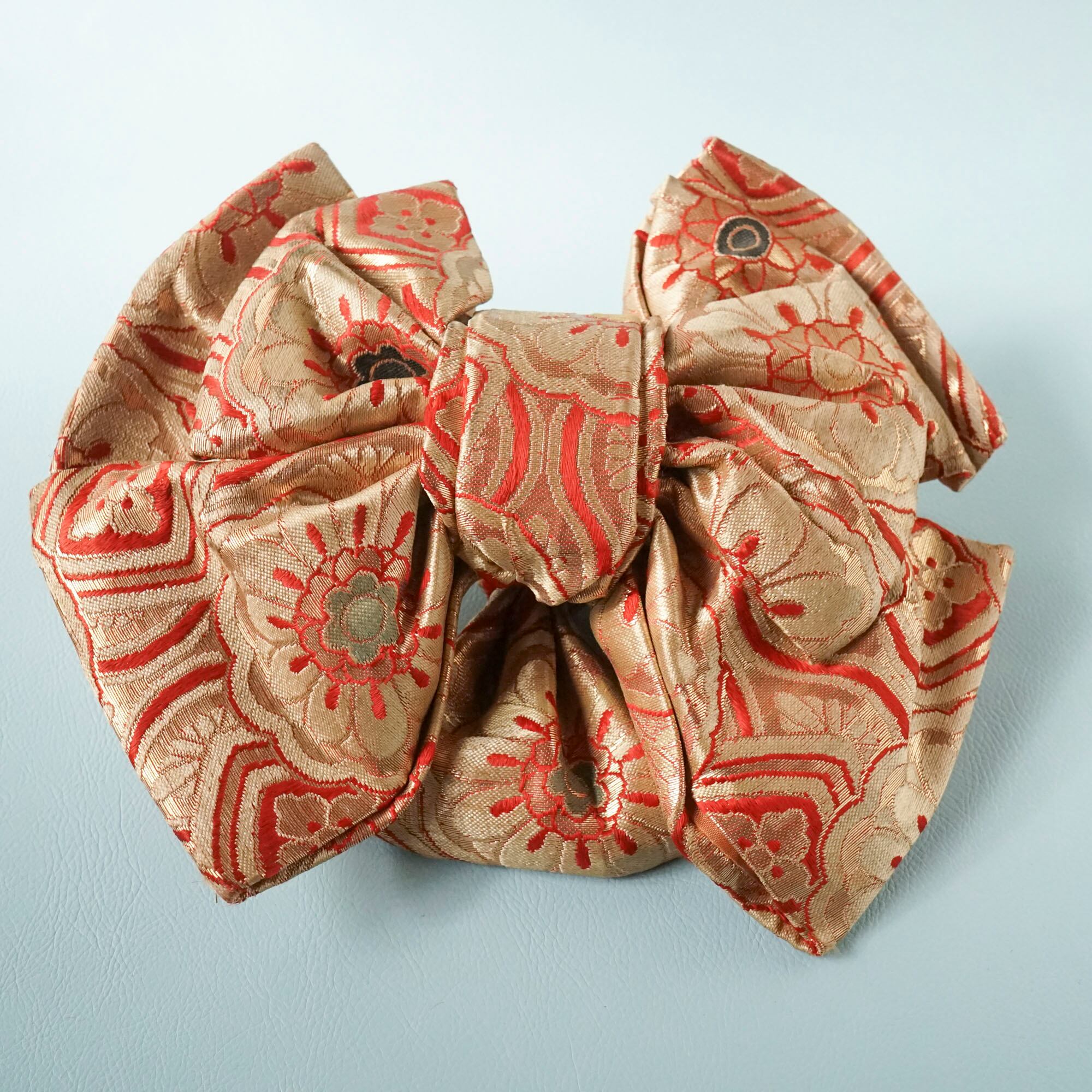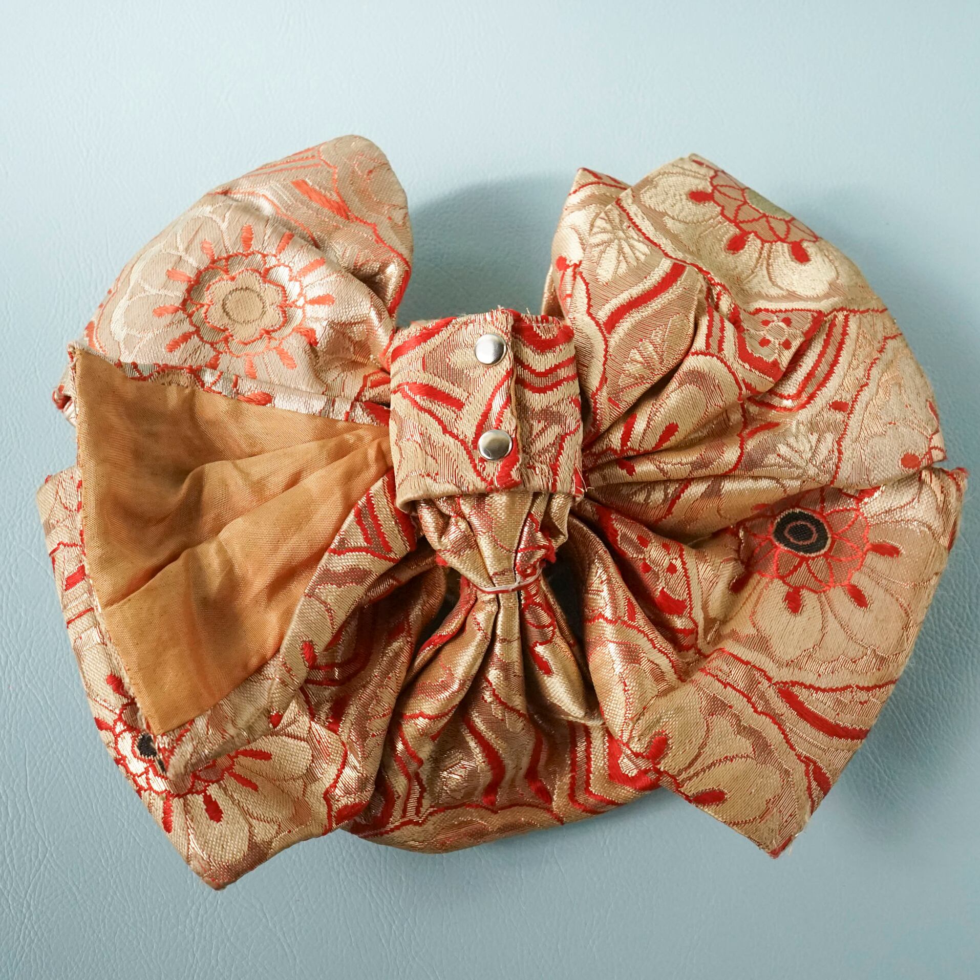 差し色は赤ながら落ち着いたカラーの着物リメイクなので、どんな服にも合わせやすい仕上がりになっています。